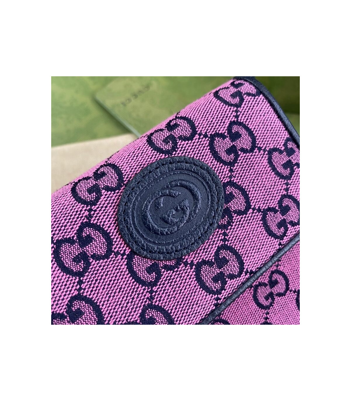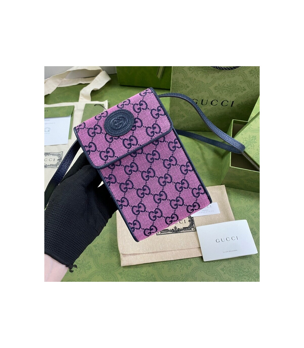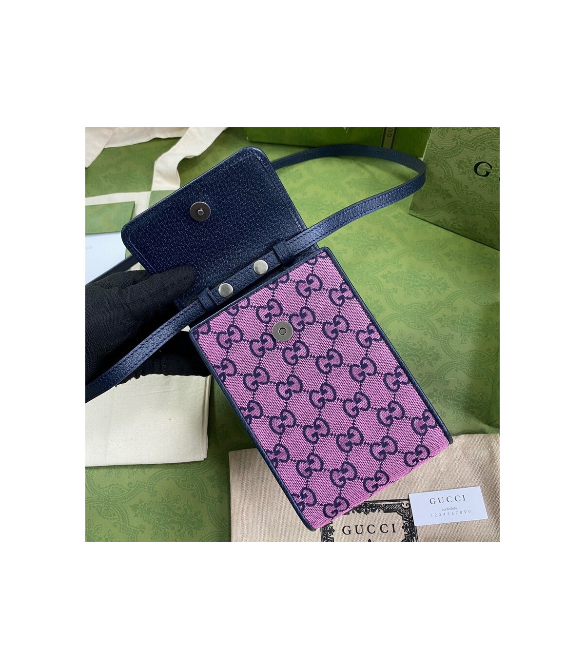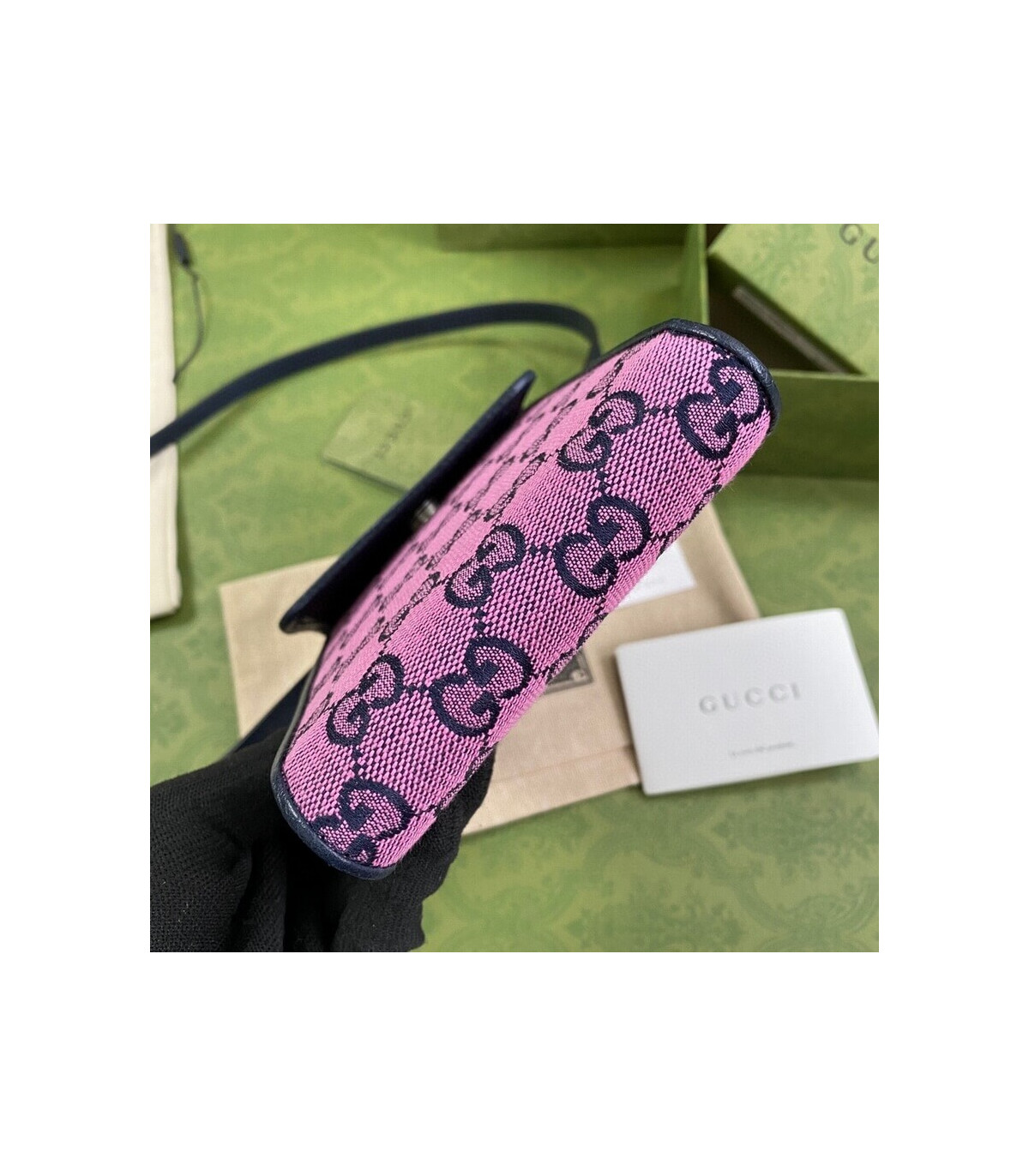 Embracing the new possibilities that lie within variations of the Gucci archives, various pieces throughout the collection provide a new lens through which to view the emblematic GG rhombi motif. Already an evolution of the House logo, it is once again reimagined in a series of bright colours―a theme that has become synonymous with the Creative Director’s vision. This mini bag is part of the GG Multicolour collection.
