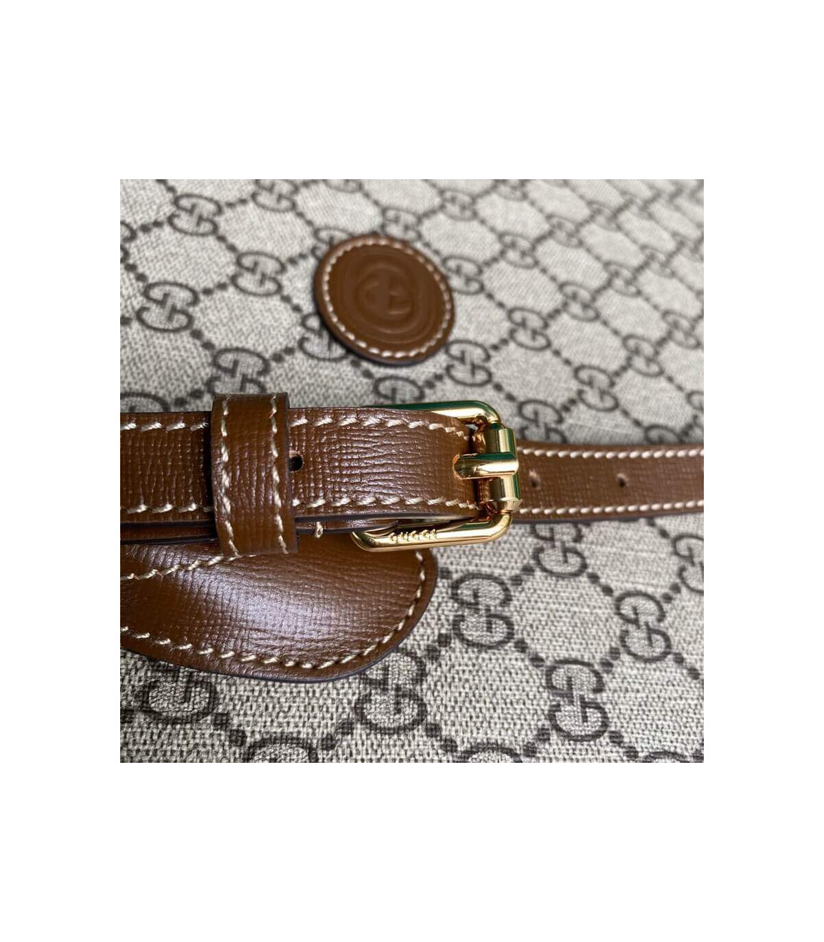 Designed with a structured silhouette, this small tote bag is crafted from beige/ebony GG Supreme canvas with brown leather trim. Featuring both top handles and a shoulder strap, it offers versatile carrying options. The interior includes two zip pockets for secure organization.