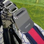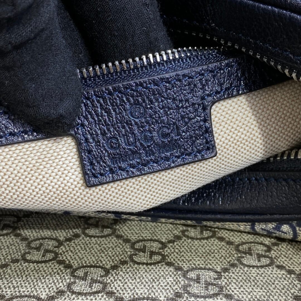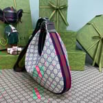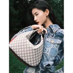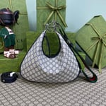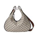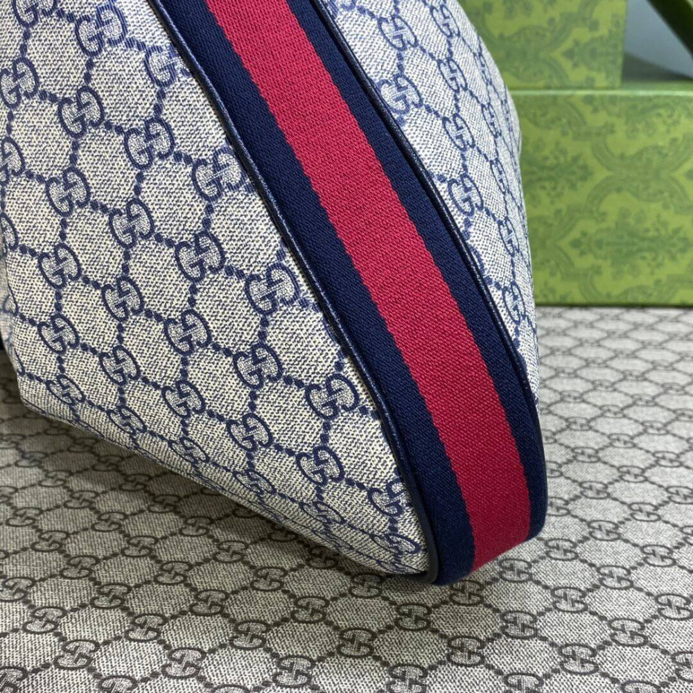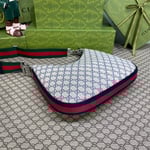 An ode to the timeless Hollywood glamour that shaped Gucci Love Parade, classic elements from the House’s archives are reintroduced. Distinguished by its crescent moon shape, the accessory is further defined by a G shaped hook closure. Paired with soft materials, the heritage hardware creates a refined design with vintage appeal. This medium version is crafted from beige and blue GG Supreme canvas, complete with a blue and red Web trim.
