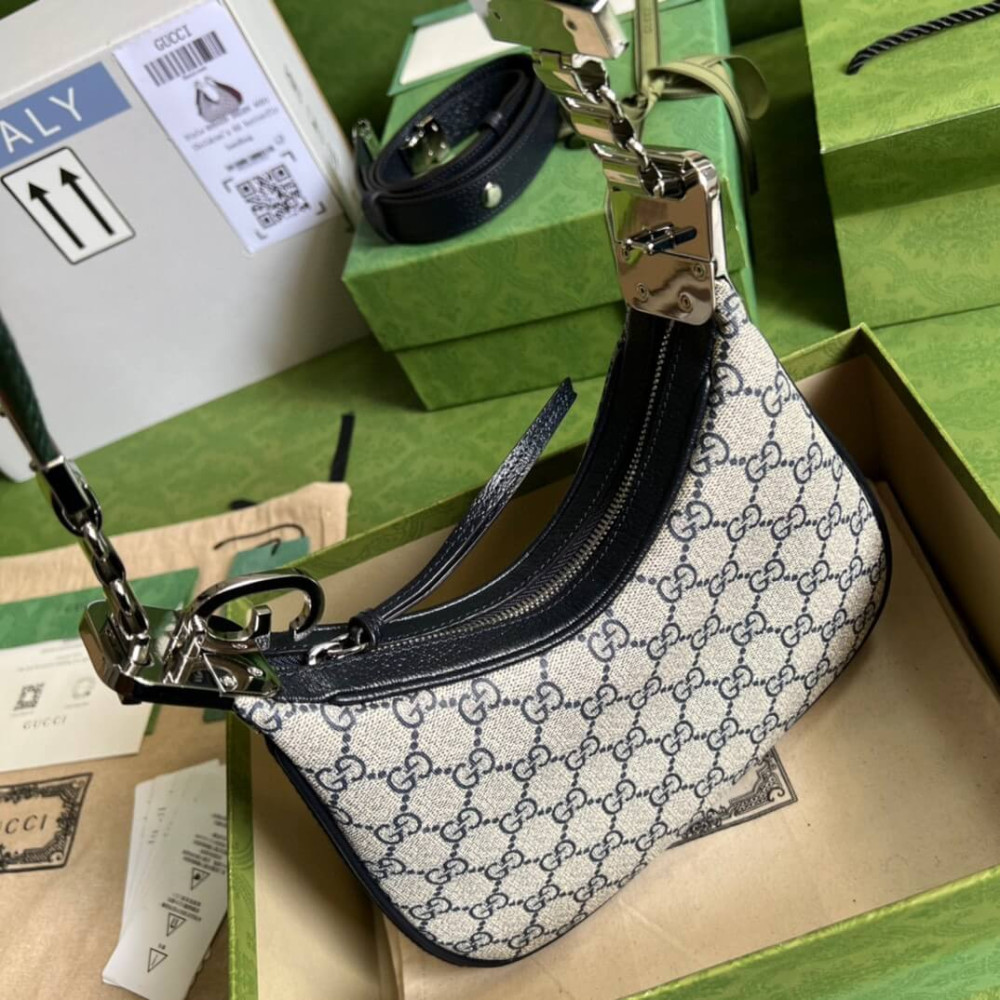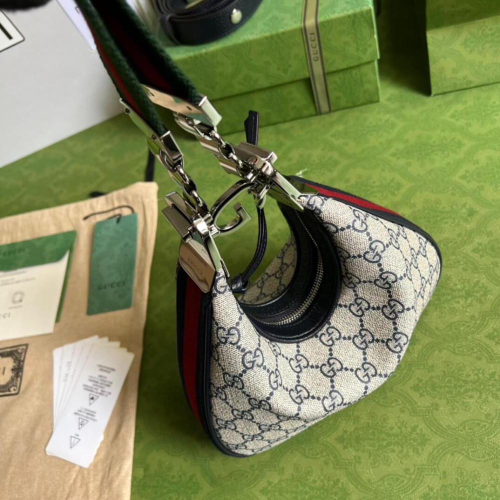 An ode to the timeless Hollywood glamour that shaped Gucci Love Parade, classic elements from the House’s archives are reintroduced. Distinguished by its crescent moon shape, the accessory is further defined by a G shaped hook closure. Paired with soft materials, the heritage hardware creates a refined design with vintage appeal. This small version is crafted in beige and ebony GG Supreme canvas with brown leather trim.