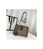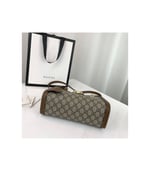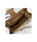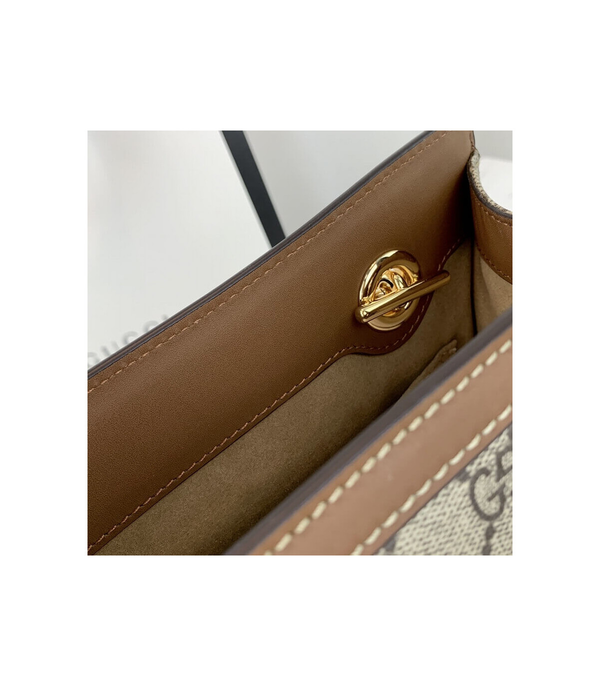 A structured silhouette in beige/ebony GG Supreme canvas with brown leather trim, secured by a key lock closure inspired by archival designs. Comes with a detachable leather key case. Finished with gold-toned hardware and a chain strap for elegant wear.