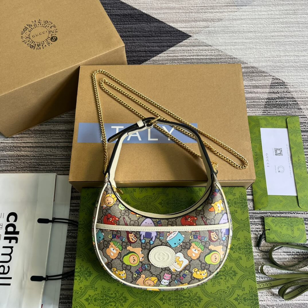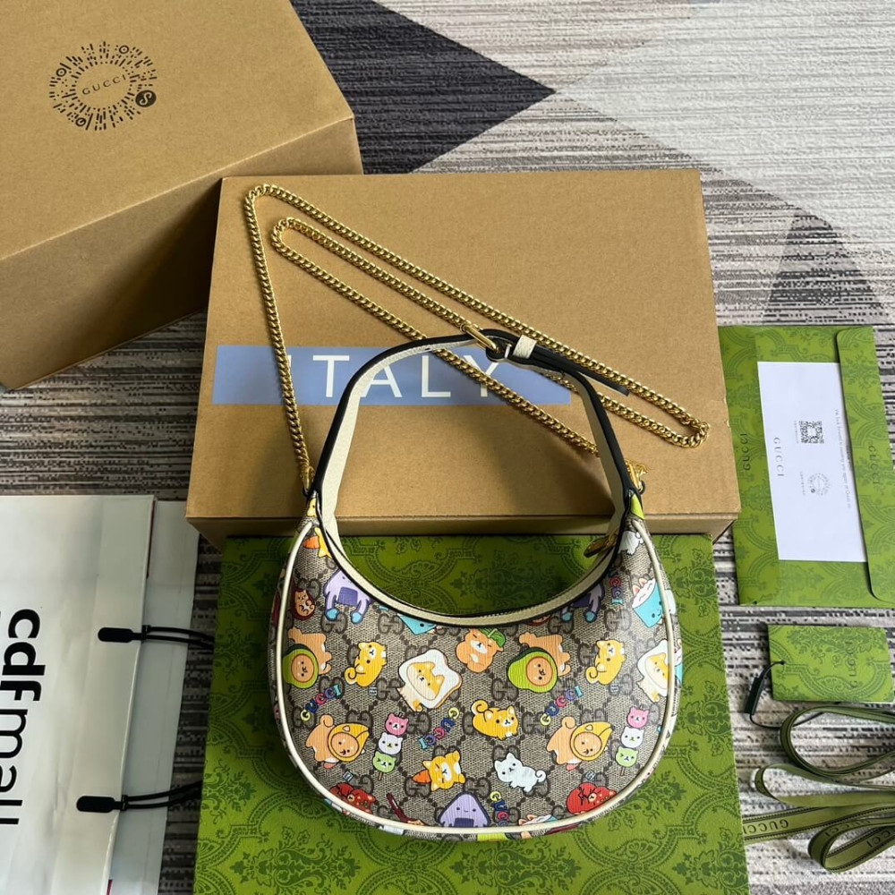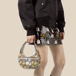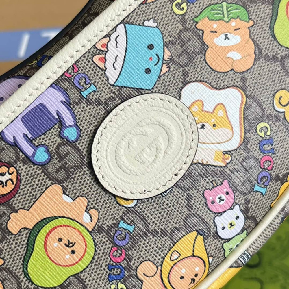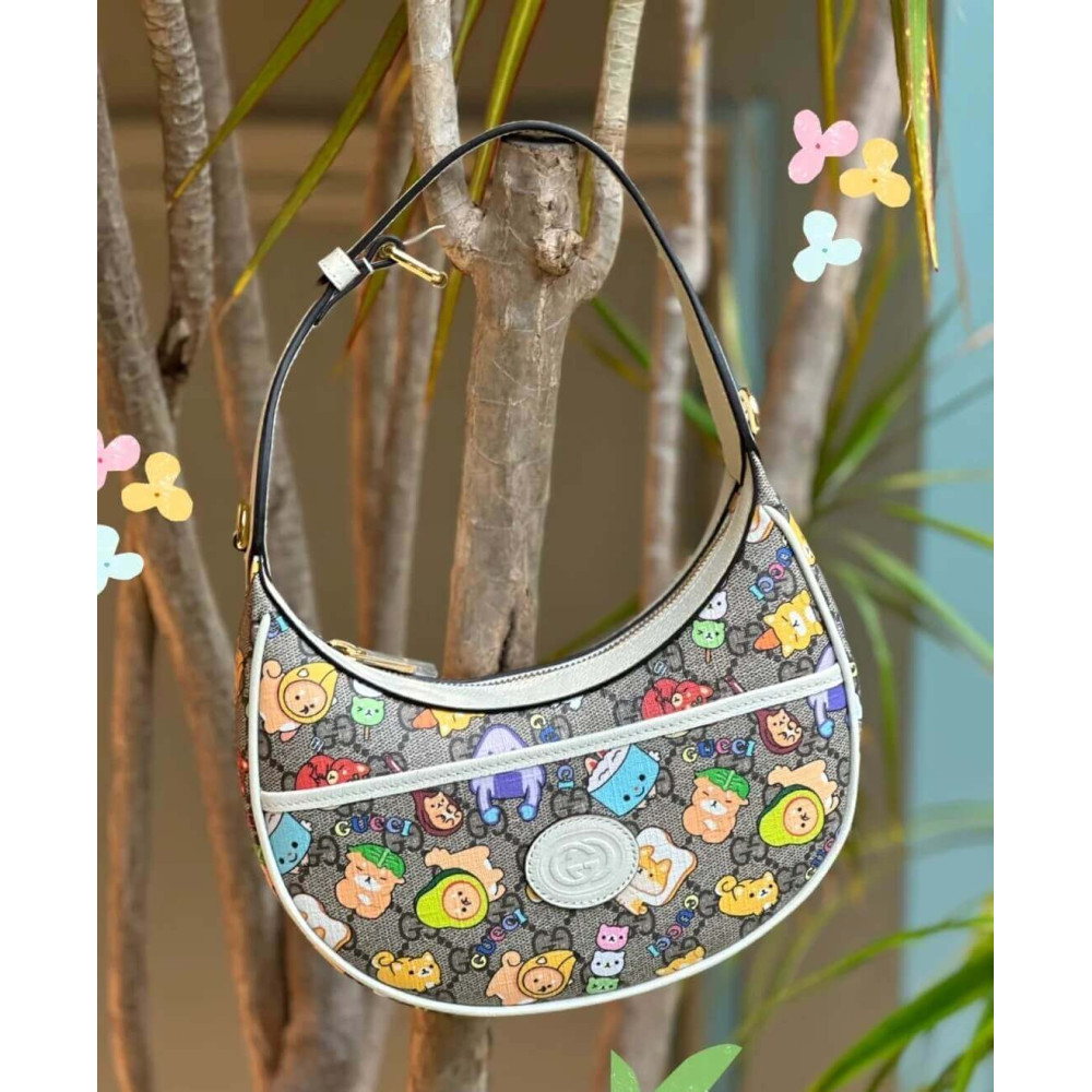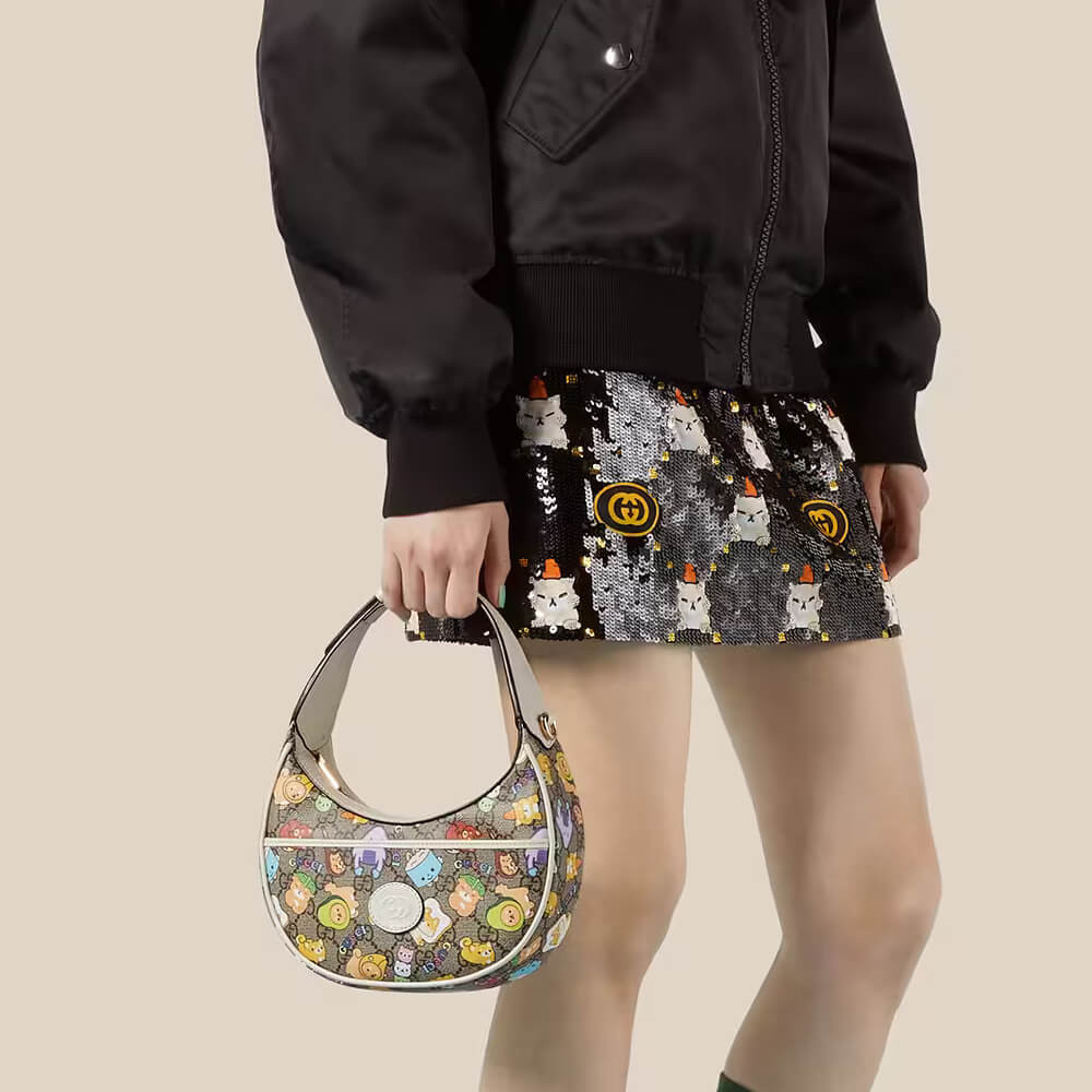 The artwork by America-based illustrator and designer, Angela Nguyen, also known as ‘Pikarar’, adds a playful touch to ready-to-wear pieces and accessories with vibrant prints or embroideries inspired by pop culture, anime, and animals. Here this mini bag is defined by a Gucci animal print.?