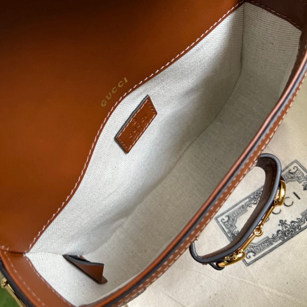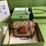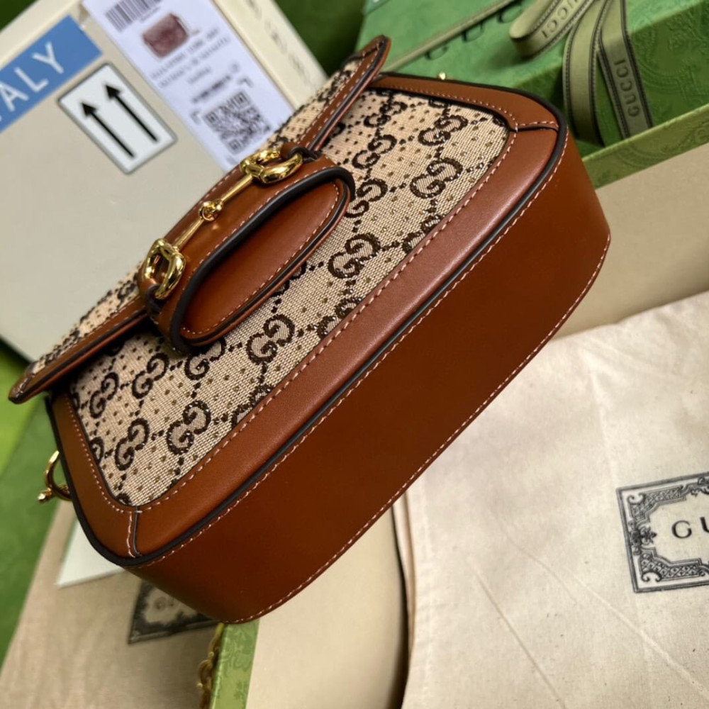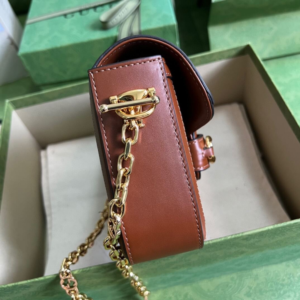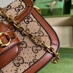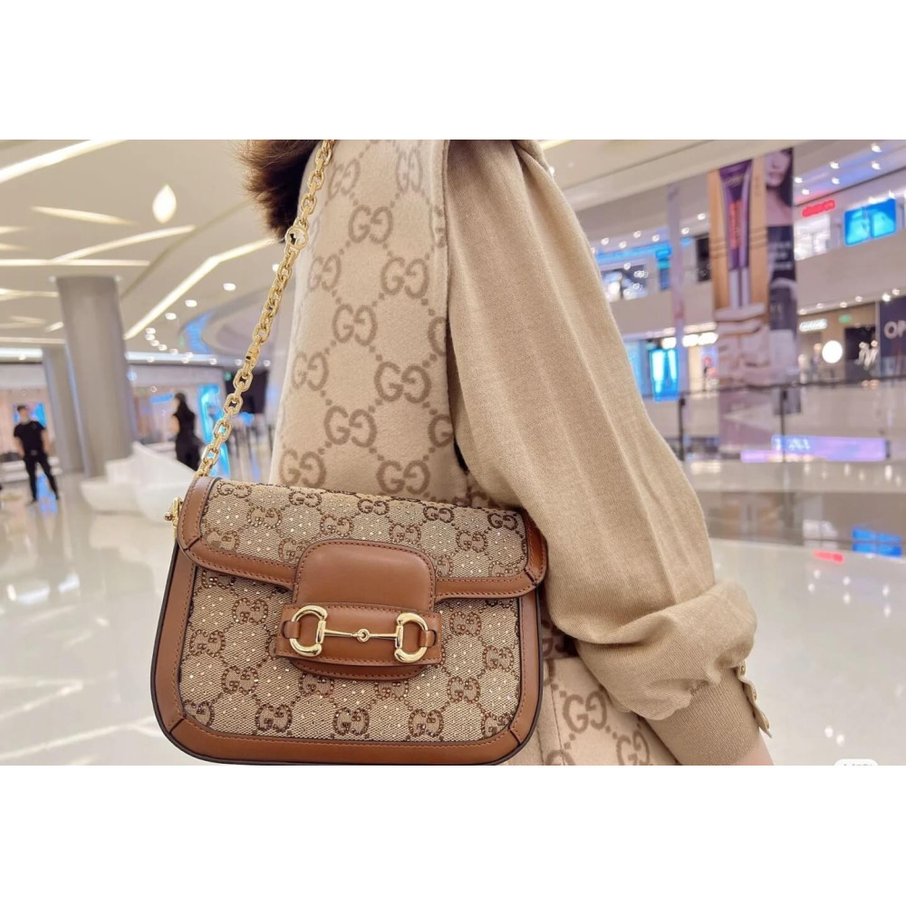 Presented in camel and ebony GG canvas, this bag is further enhanced by crystals. The structured shape and clean lines of the Gucci Horsebit 1955 highlights the collection’s signature gold-toned hardware. Part of Gucci’s genetic code, the double ring and bar design has been established as one of the most distinctive elements among the House symbols borrowed from the equestrian world. A delicate chain strap with monogram details adds a refined note to the style.