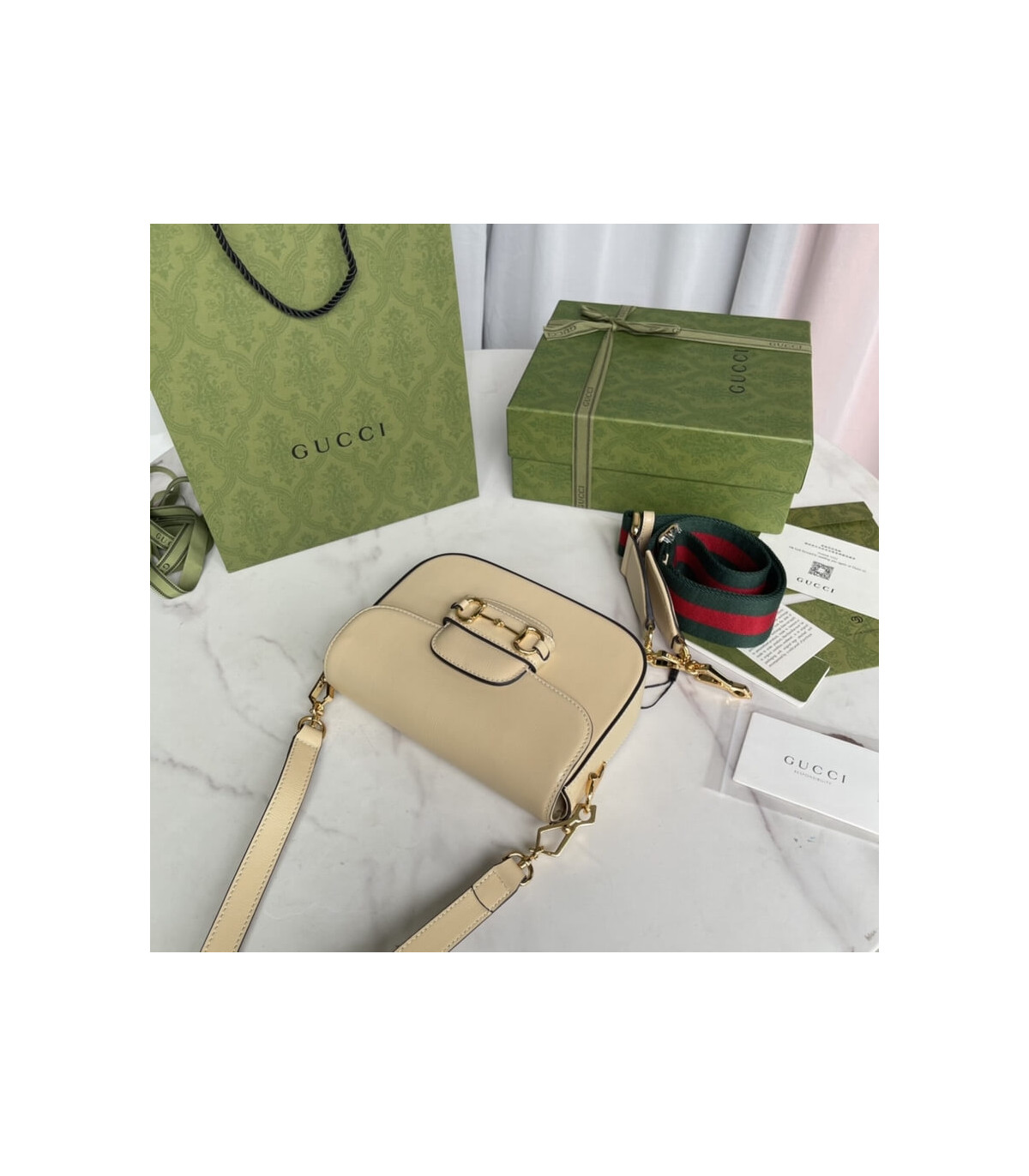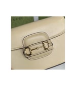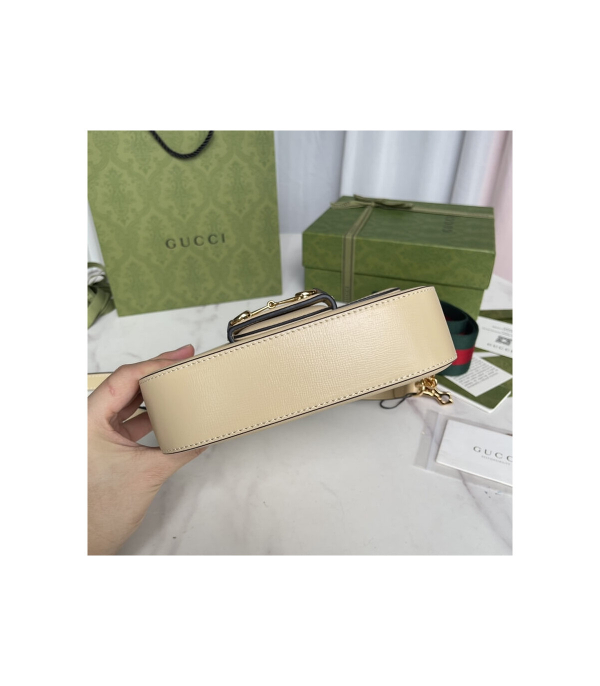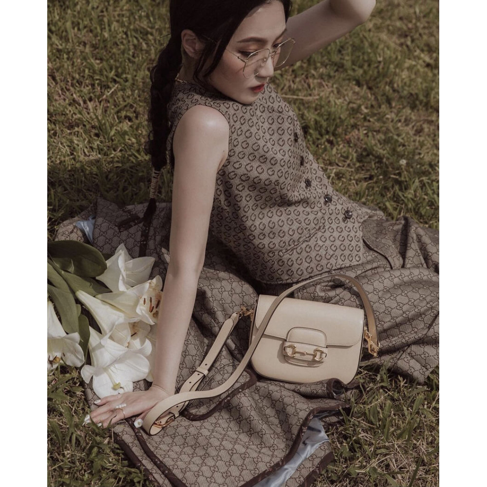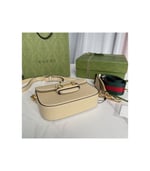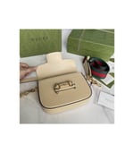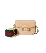 Petite versions of the Gucci Horsebit 1955 add a hybrid twist to the vintage inspired line. Enriched with two different shoulder straps, the mini bag’s character transforms from understated elegance with a tonal leather strap to a strong logo feel thanks to a red and green Web option. The accessory is presented in monogram canvas with a brown leather trim.