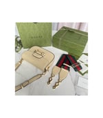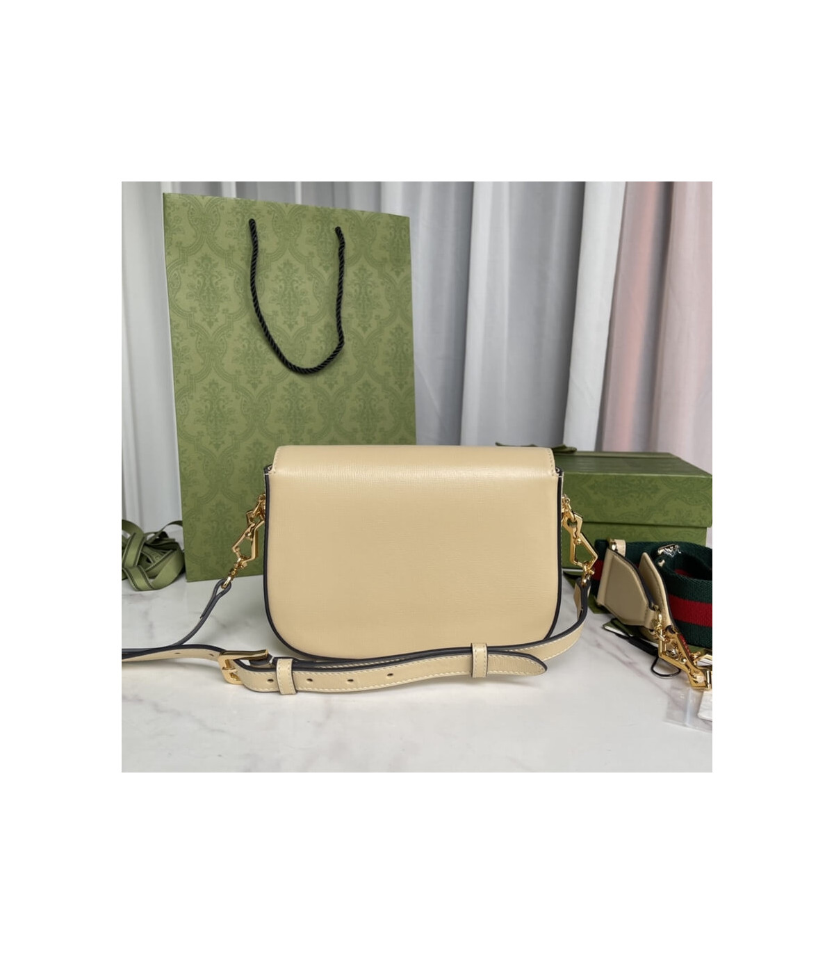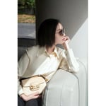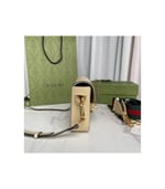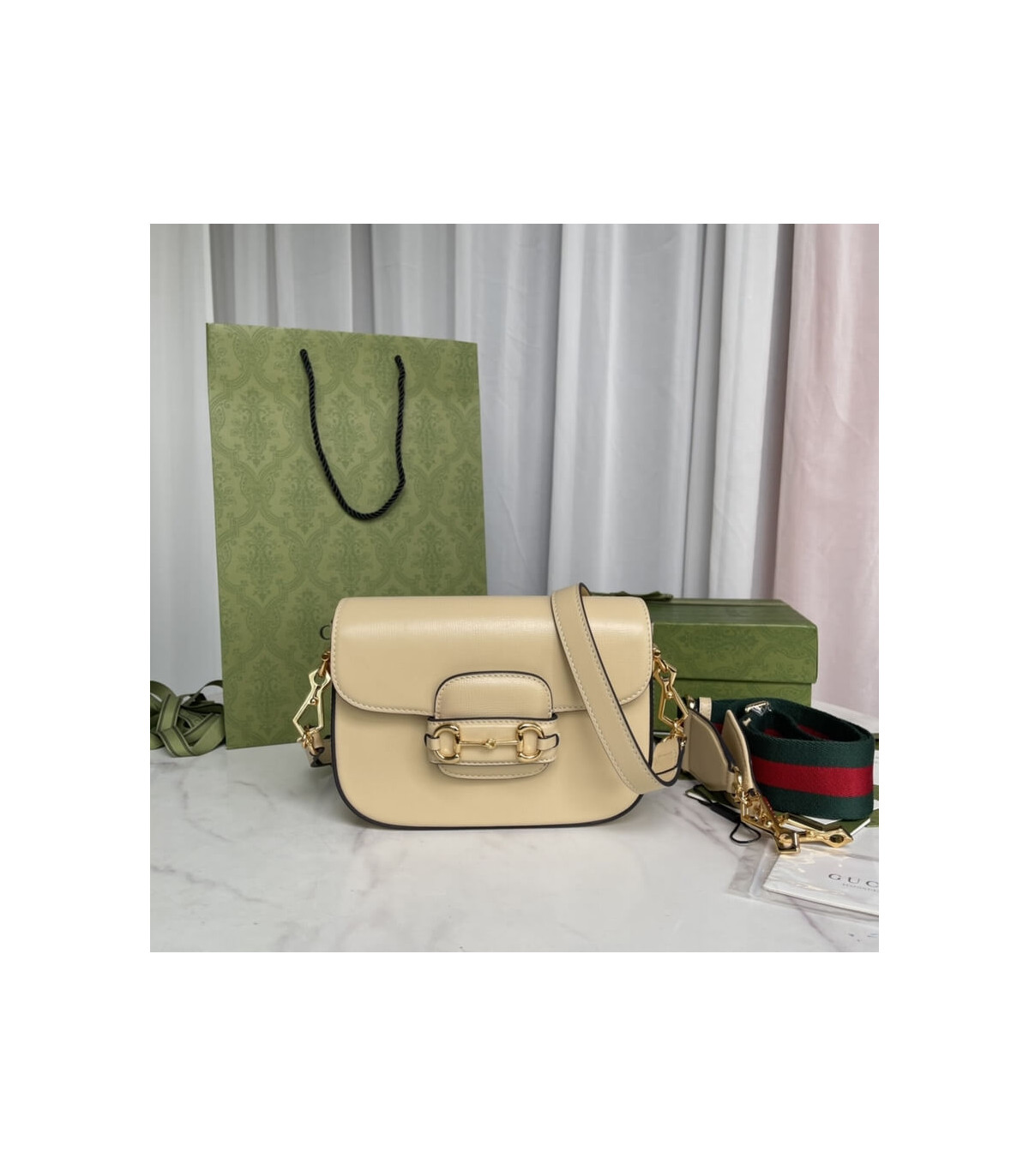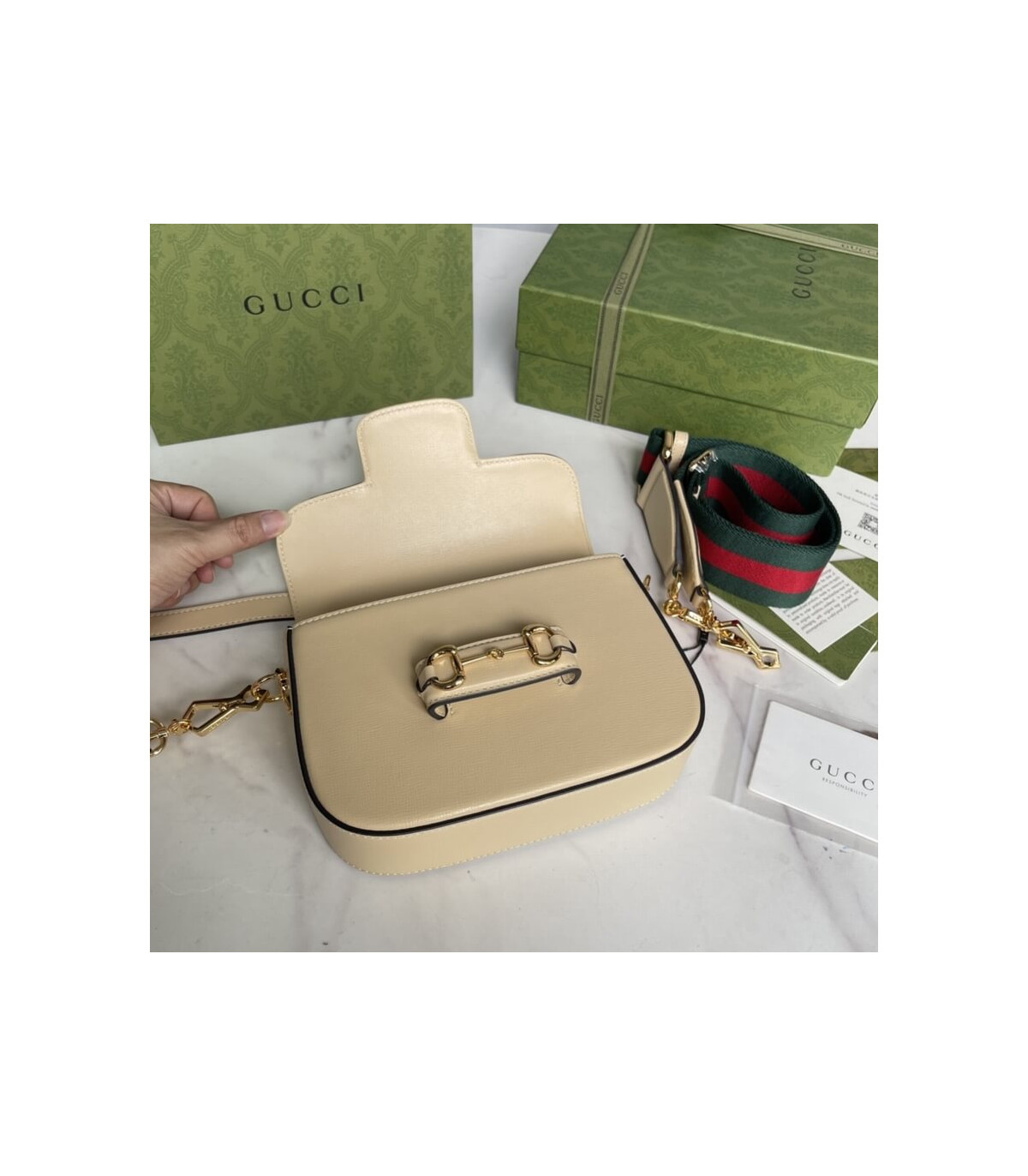 Petite versions of the Gucci Horsebit 1955 add a hybrid twist to the vintage inspired line. Enriched with two different shoulder straps, the mini bag’s character transforms from understated elegance with a tonal leather strap to a strong logo feel thanks to a red and green Web option. The accessory is presented in monogram canvas with a brown leather trim.