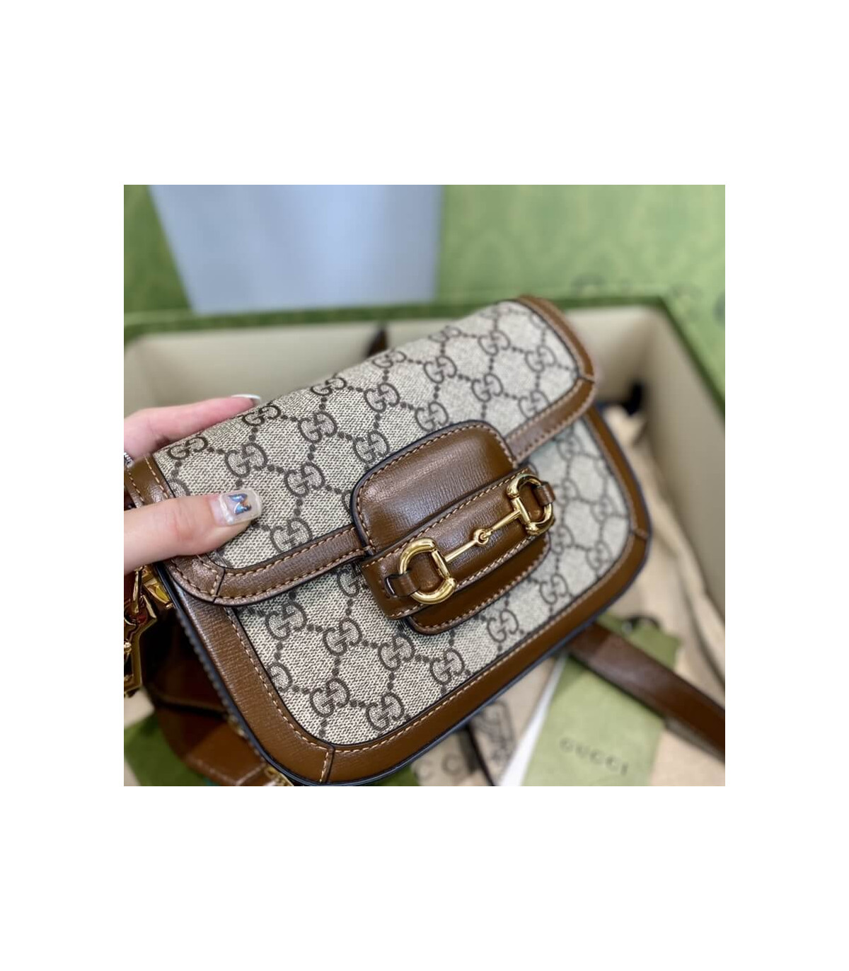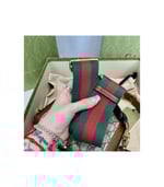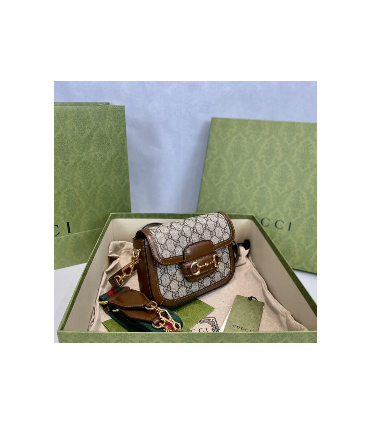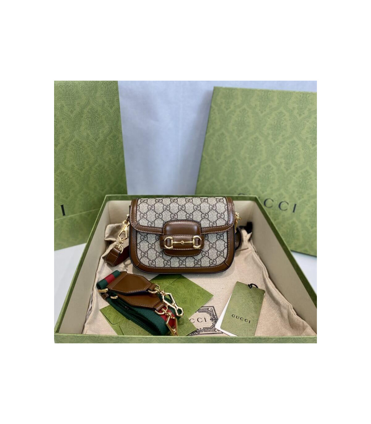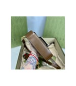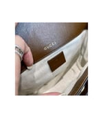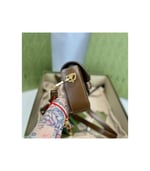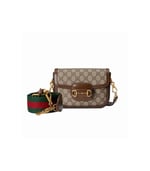 Petite versions of the Gucci Horsebit 1955 add a hybrid twist to the vintage inspired line. Enriched with two different shoulder straps, the mini bag’s character transforms from understated elegance with a tonal leather strap to a strong logo feel thanks to a red and green Web option. The accessory is presented in monogram canvas with a brown leather trim.