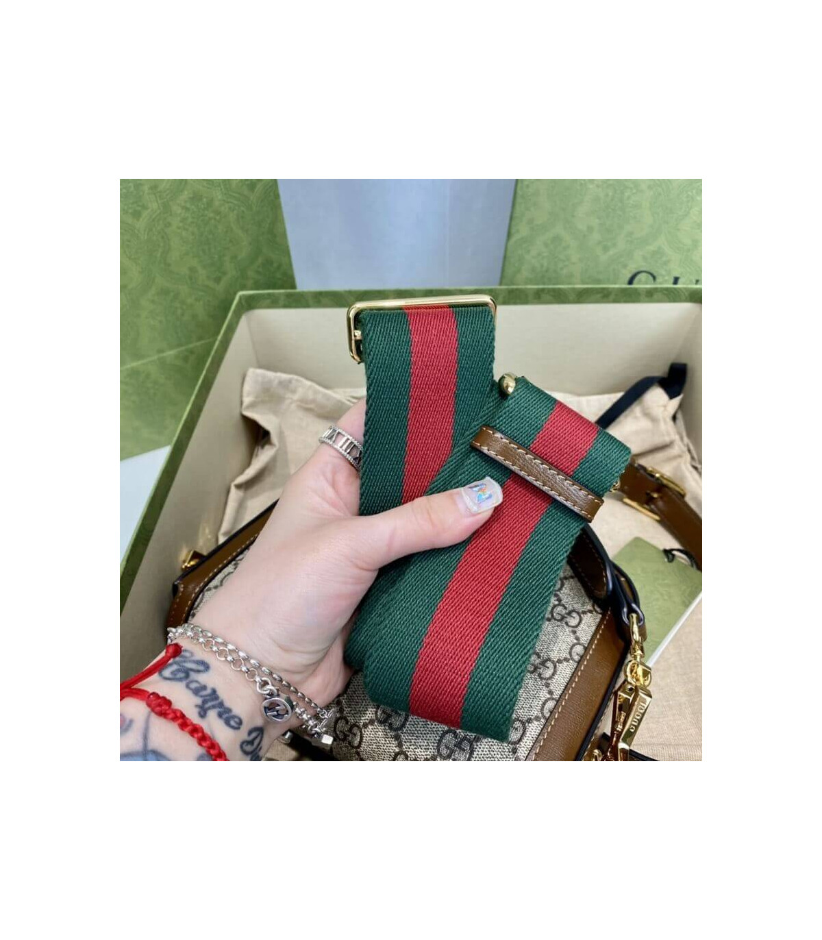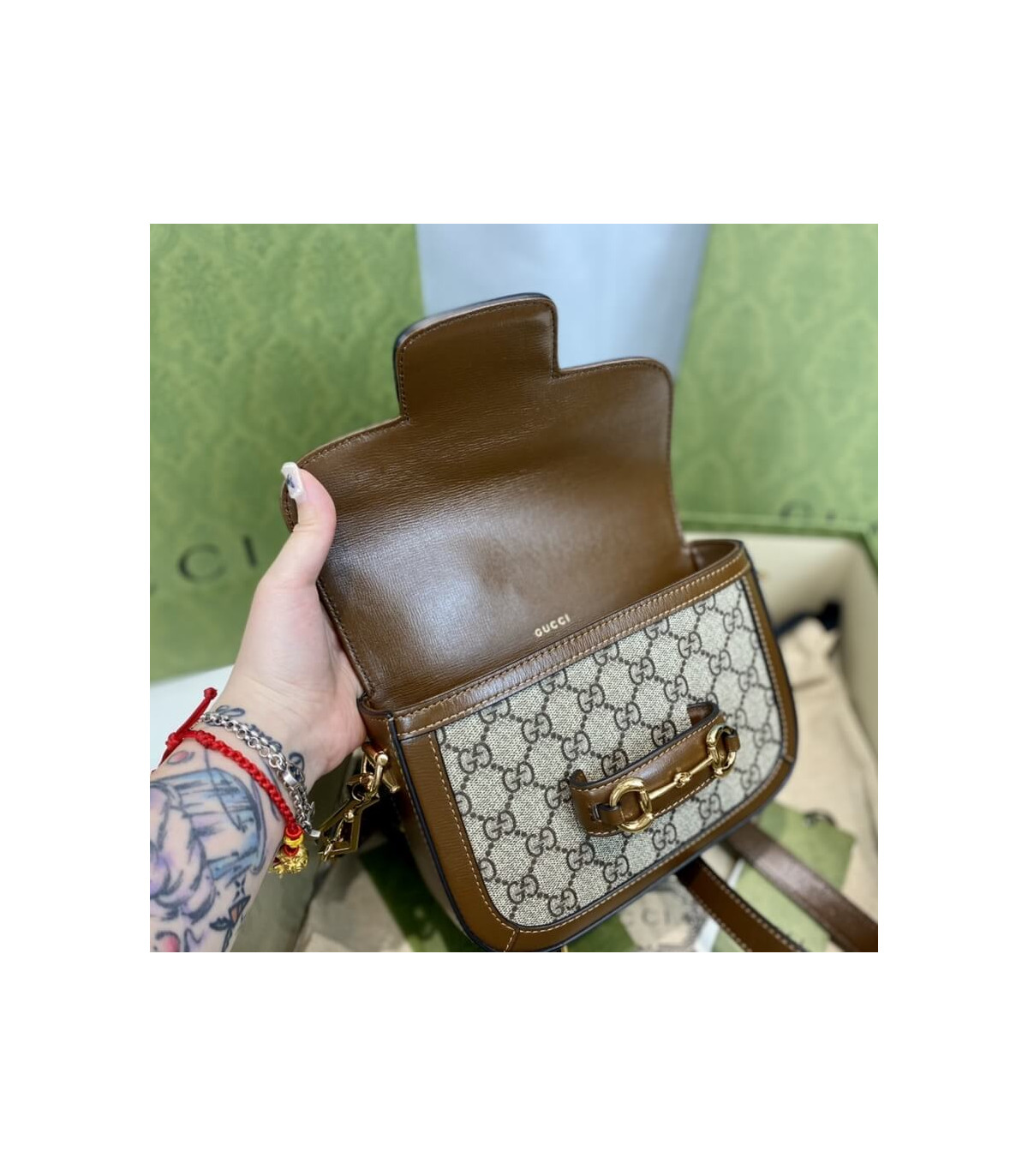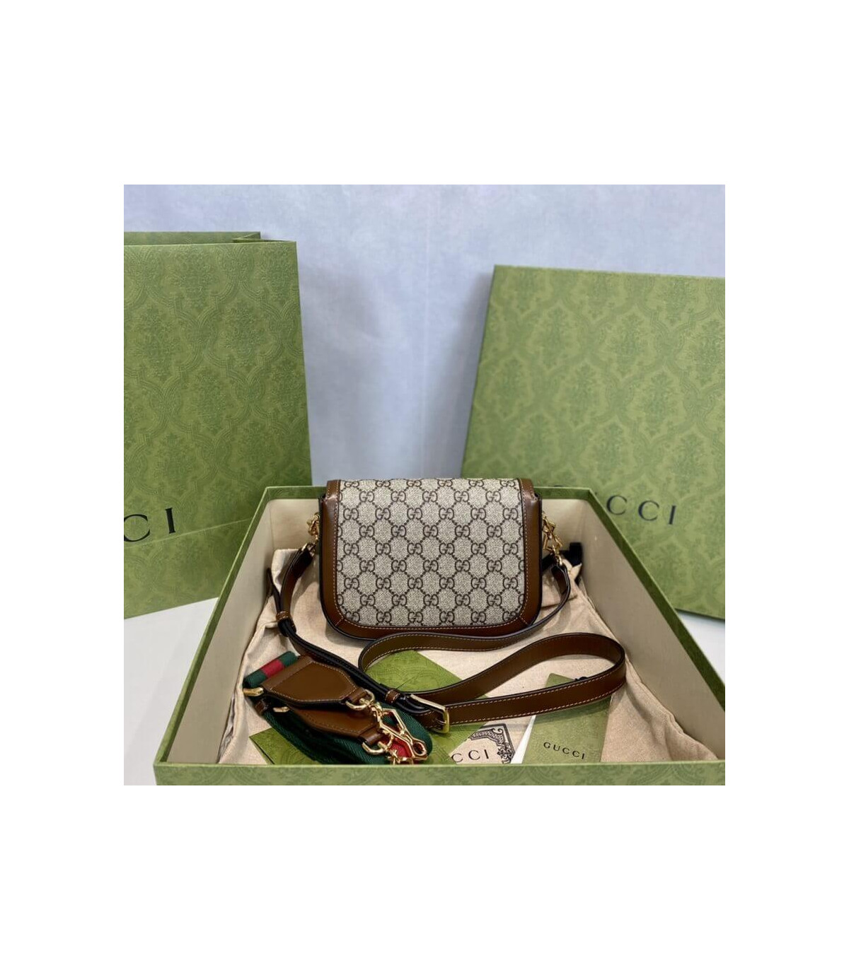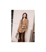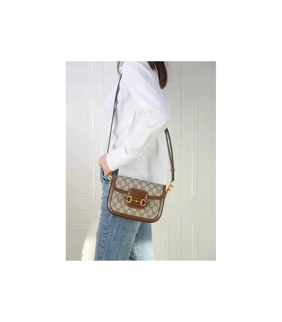 Petite versions of the Gucci Horsebit 1955 add a hybrid twist to the vintage inspired line. Enriched with two different shoulder straps, the mini bag’s character transforms from understated elegance with a tonal leather strap to a strong logo feel thanks to a red and green Web option. The accessory is presented in monogram canvas with a brown leather trim.