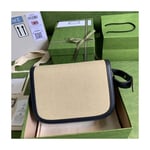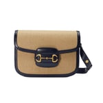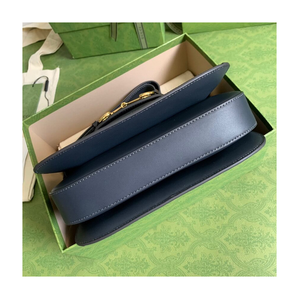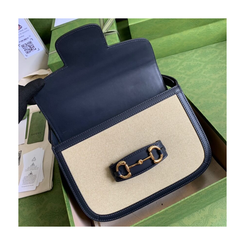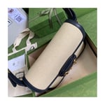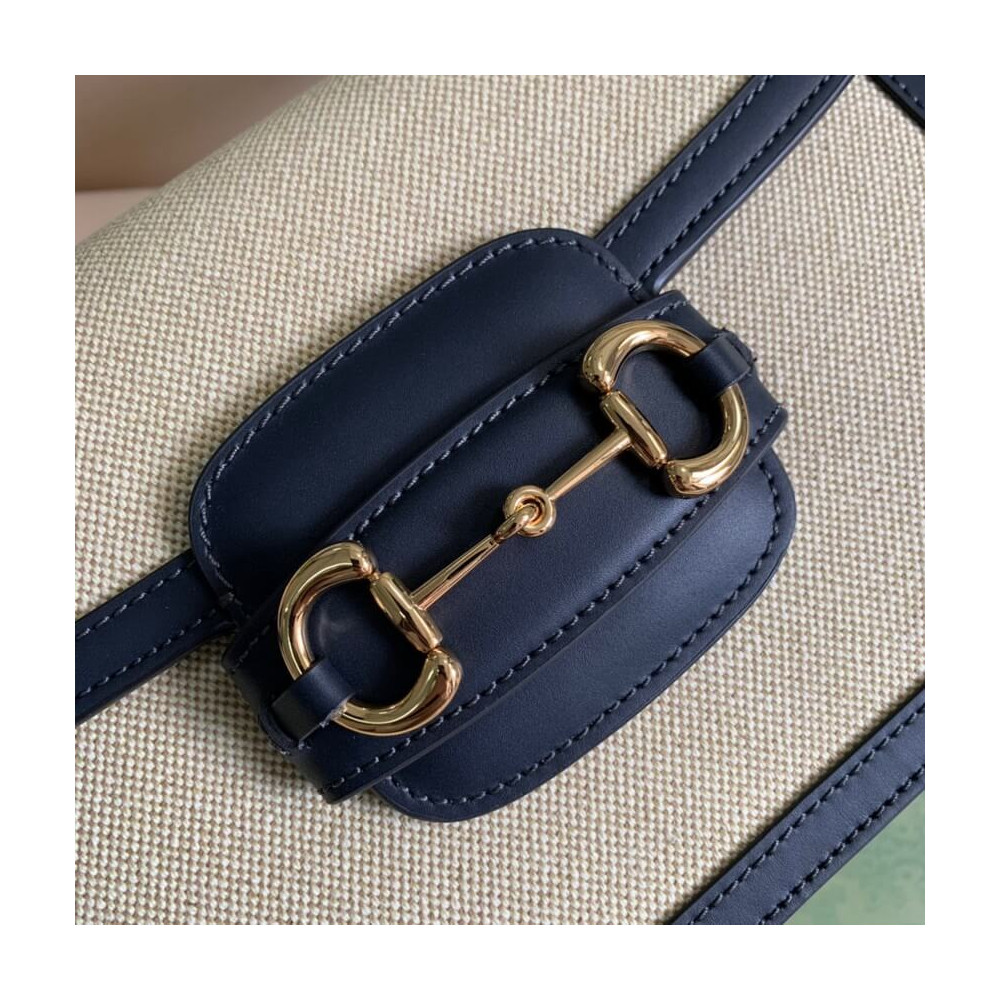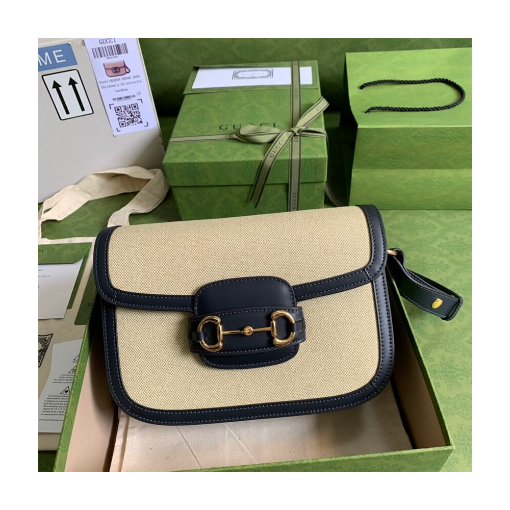 Recreated from an archival design, the Gucci Horsebit 1955 bag is introduced in beige canvas with a vintage effect trimmed with blue leather for Spring Summer 2020. With the same lines and forms first introduced over six decades ago, the accessory unifies the original details with a modern spirit, highlighting the Horsebit. Part of Gucci’s genetic code, the double ring and bar design has been established as one of the most distinctive elements among the House symbols borrowed from the equestrian world. The small flap shoulder bag is completed with a special mechanism that adjusts the length of the shoulder strap so it can be carried on one shoulder or cross body.-?Beige vintage canvas