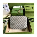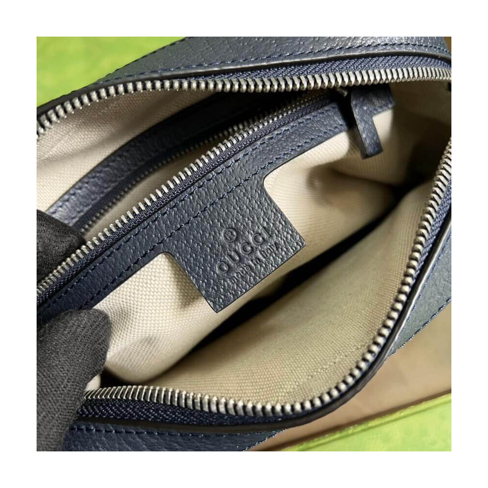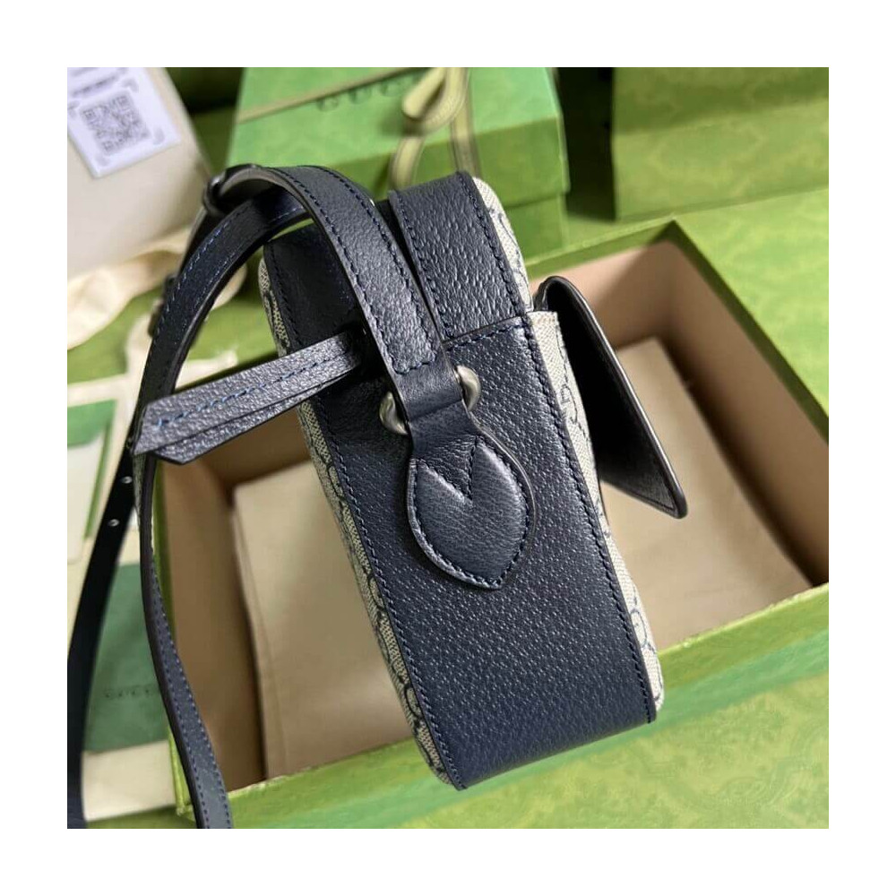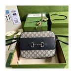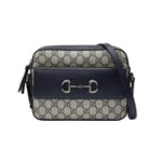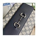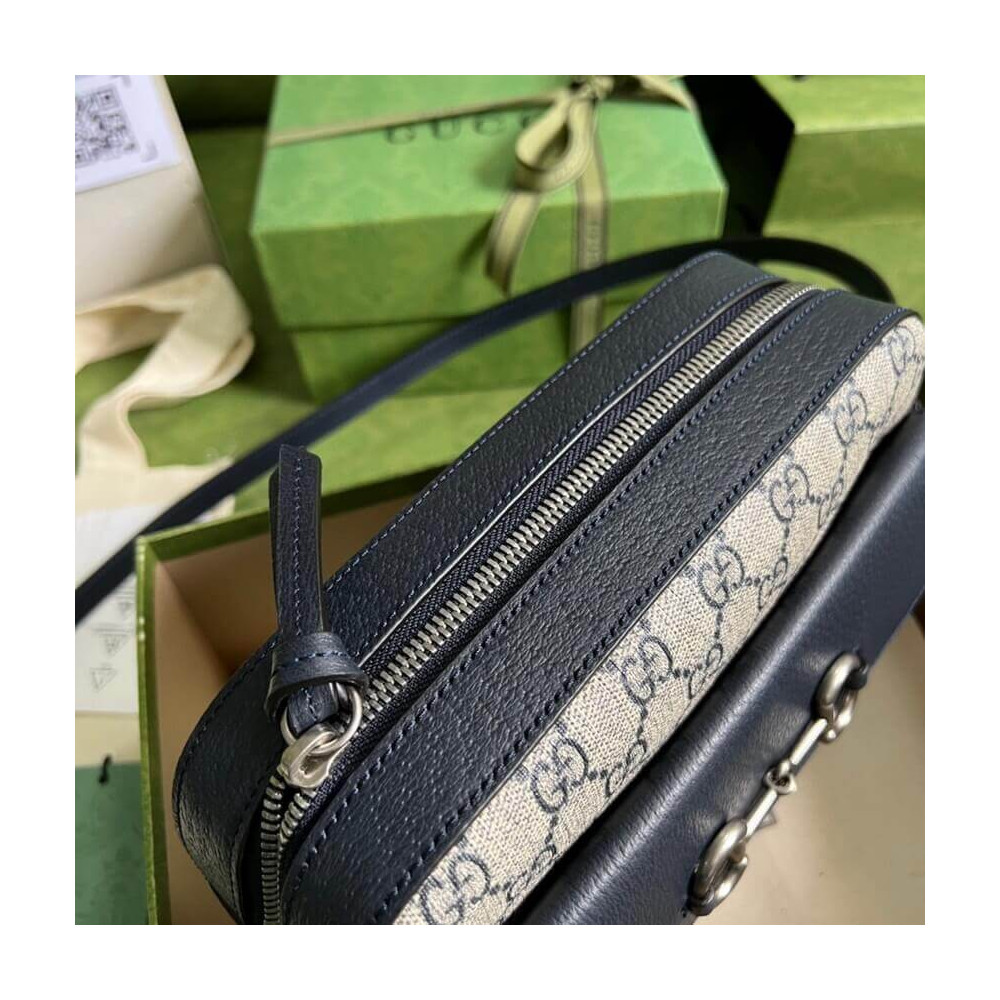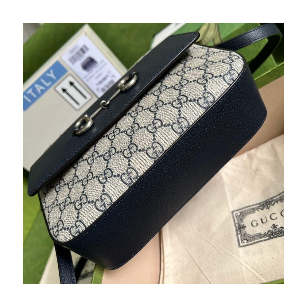 Mirroring the material’s historic origins, GG Supreme is introduced in a timeless mix of blue and beige for Gucci Love Parade. With a low environmental impact, the canvas has come to the front of each collection decade after decade to become a hallmark of the House. Here, the classic palette defines this small-sized Gucci Horsebit 1955 bag.