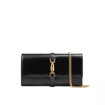 A refined twist on the iconic Jackie line, this continental wallet in smooth black calfskin features a gold-toned piston closure and delicate chain strap―allowing it to double as a mini bag. The compact interior offers functional organization with card slots, compartments, and a zip coin pocket.
