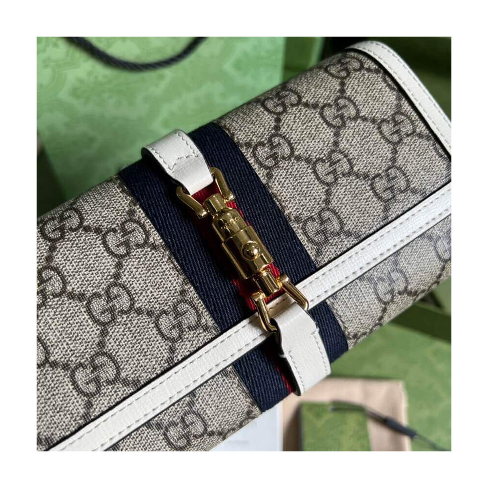 A modern reinterpretation of a classic, this Jackie 1961 chain wallet features a slim silhouette in GG Supreme canvas with striking white leather trim. The gold-toned piston closure and blue-red Web stripe honor Gucci heritage, while the chain strap allows it to double as a stylish mini bag.
