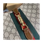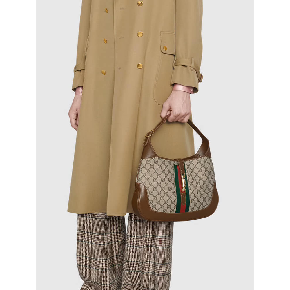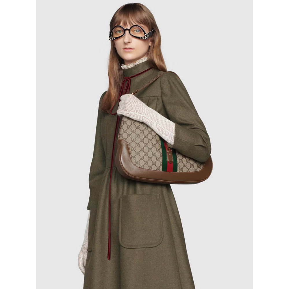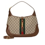 A refined take on a timeless icon, this Jackie 1961 medium shoulder bag is crafted in beige/ebony GG Supreme canvas with brown leather trim and the signature green-red Web stripe. Gold-toned piston hardware and a detachable shoulder strap offer both classic and contemporary styling.