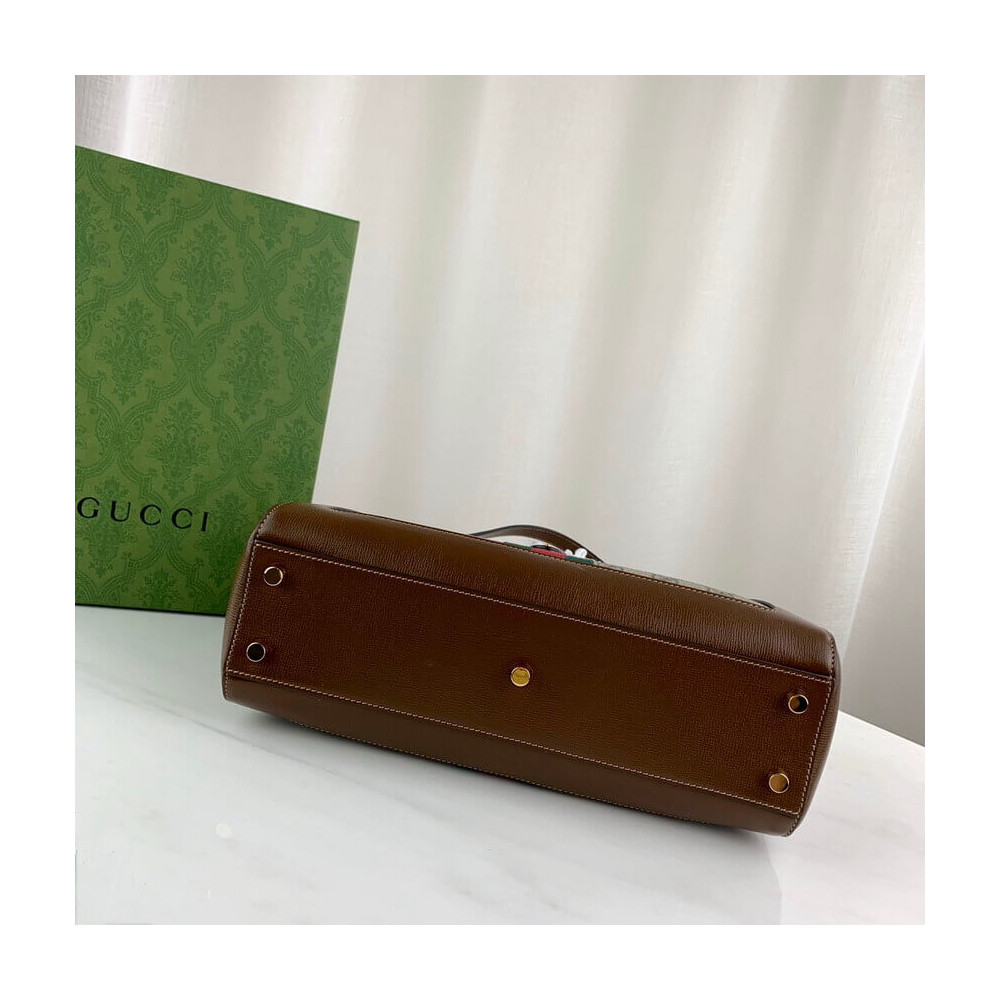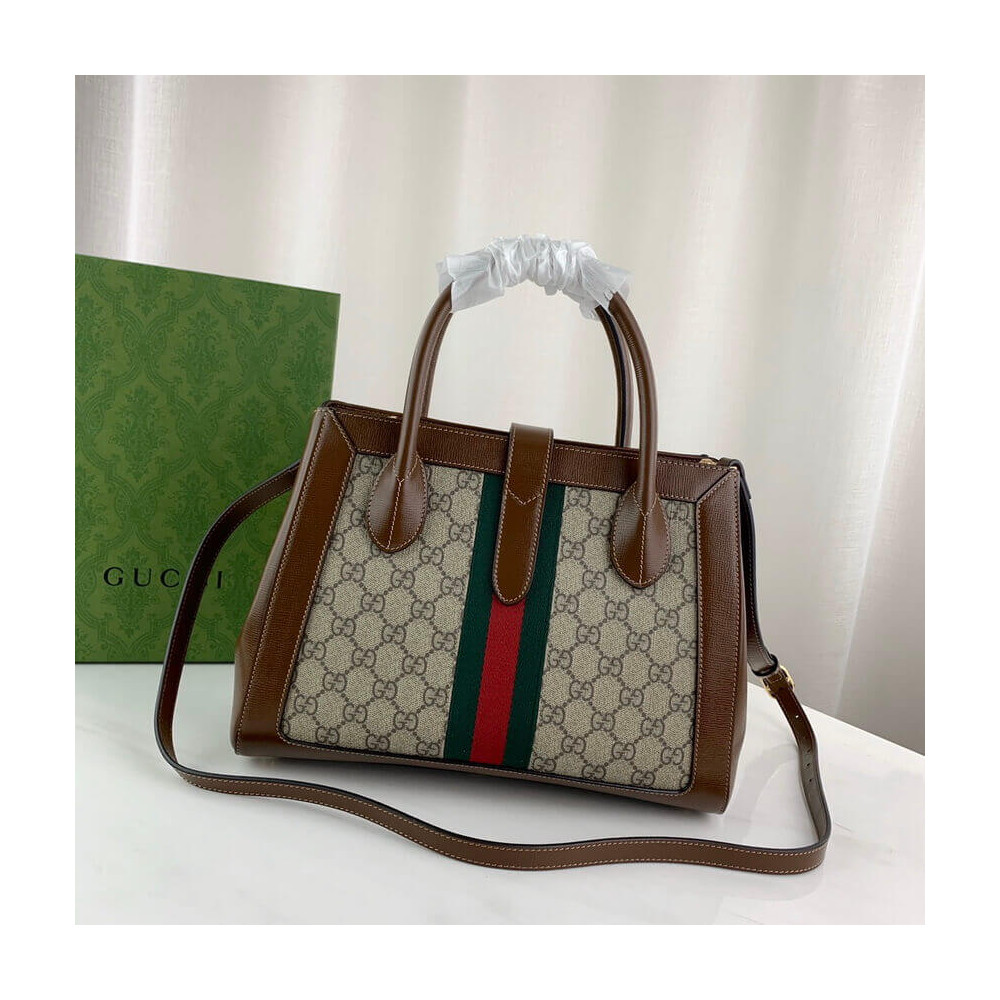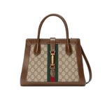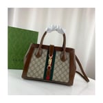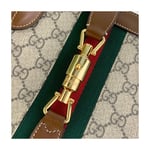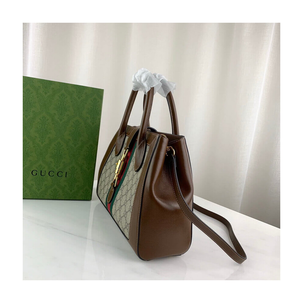 Gucci Jackie 1961 Medium Tote �C GG Supreme Canvas | 1:1 Rep Crafted from beige and ebony GG Supreme canvas with brown leather trim, this Jackie 1961 medium tote features the signature piston closure and green-red Web detail. A detachable shoulder strap adds versatility to this timeless design.