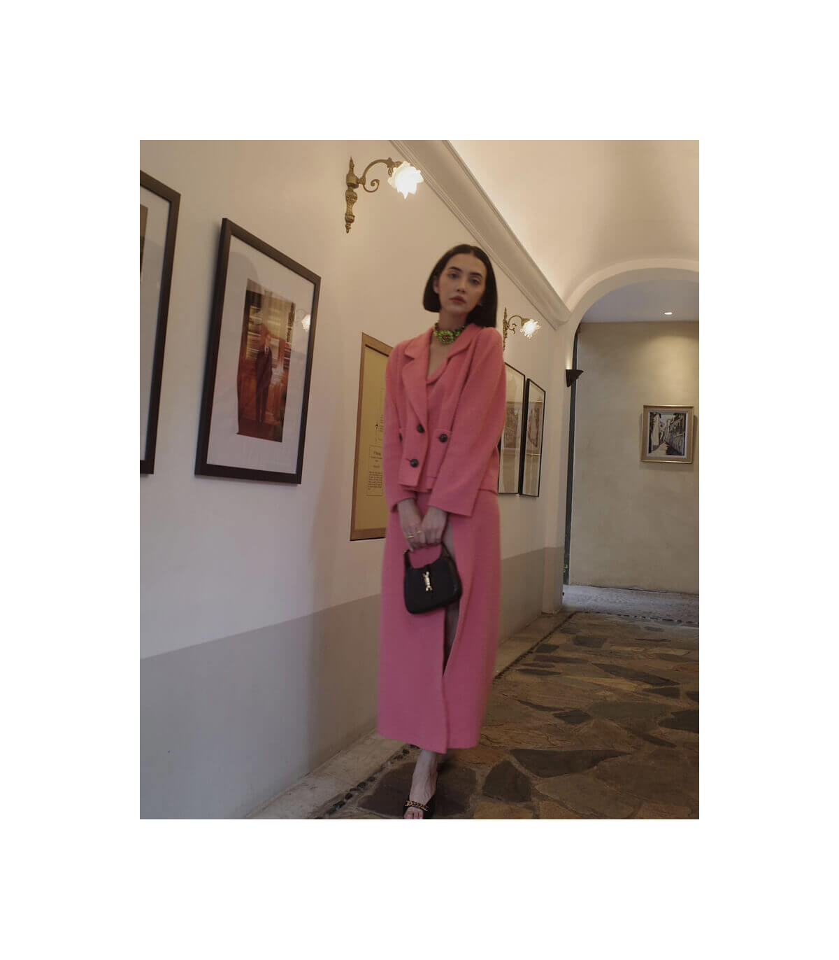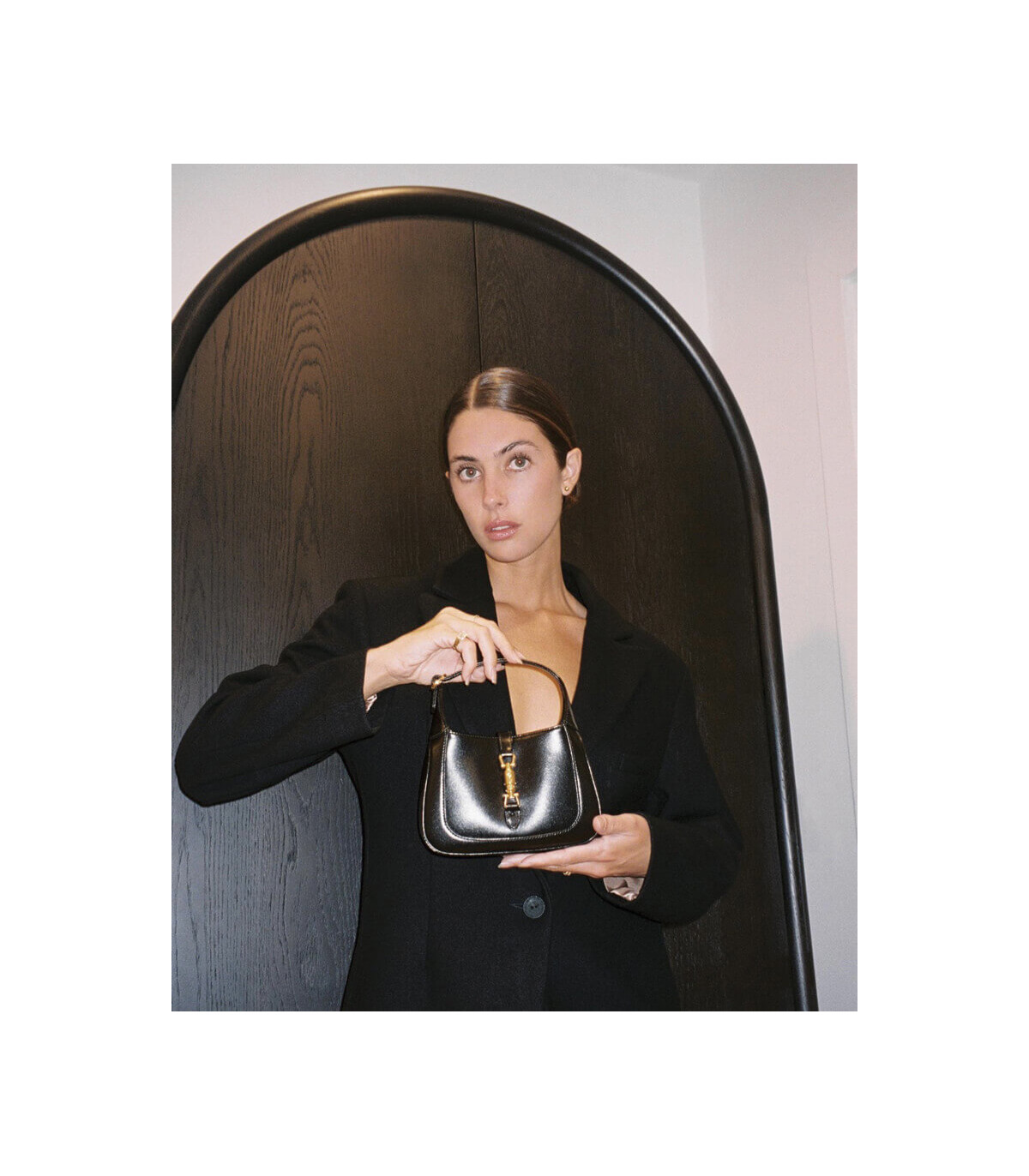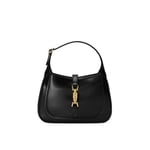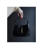 A reimagined icon, the Jackie 1961 mini bag returns in smooth black leather with gold-toned piston closure. The design includes a detachable shoulder strap, allowing for versatile styling―from top handle to crossbody. A compact silhouette with timeless appeal.