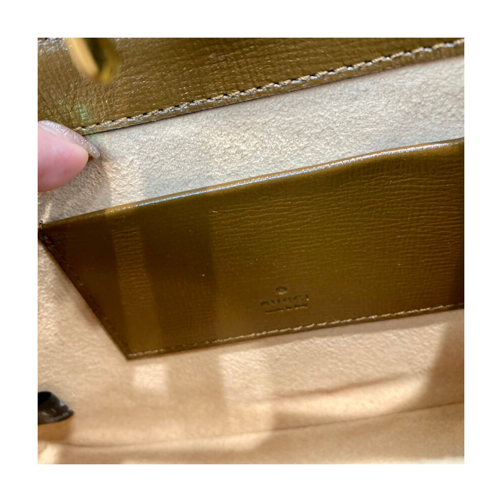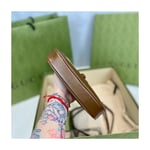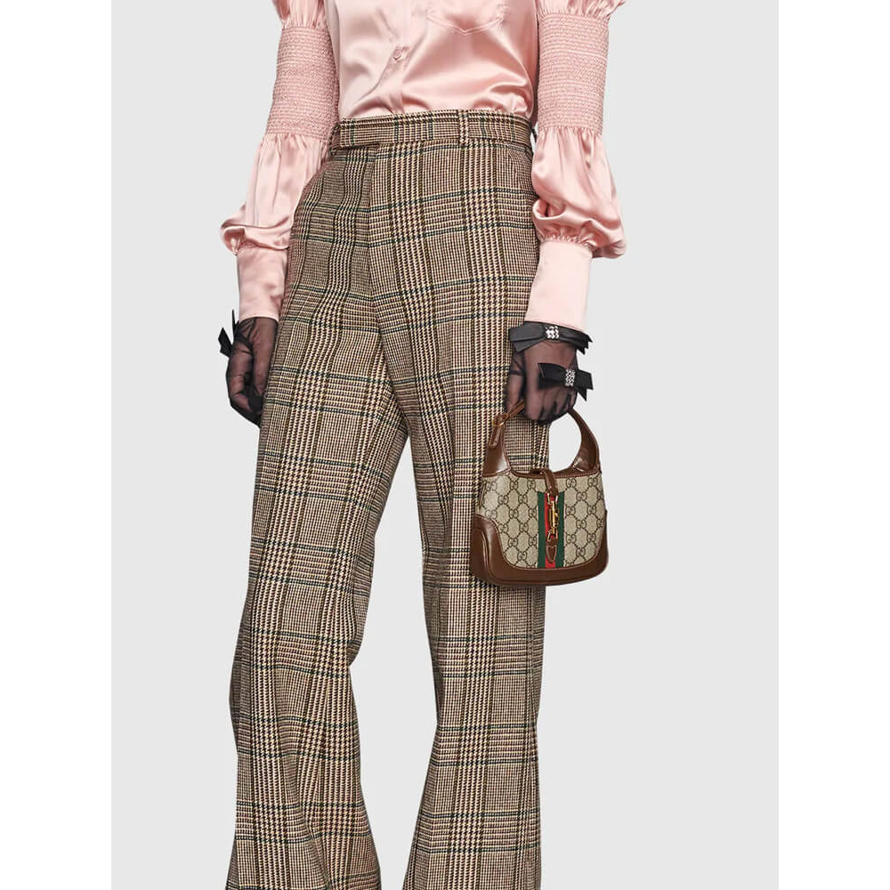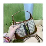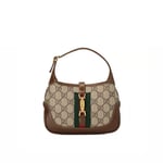 A timeless icon reimagined, the Jackie 1961 mini shoulder bag is crafted from beige/ebony GG Supreme canvas with brown leather trim and green-red Web detail. Featuring a signature gold-toned piston closure and detachable shoulder strap, this compact piece offers multiple ways to wear―from top handle to crossbody.