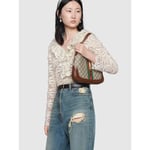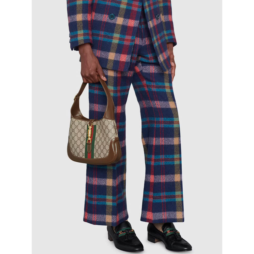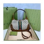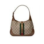 A timeless silhouette reimagined, this Jackie 1961 small bag is crafted from beige/ebony GG Supreme canvas with brown leather trim and iconic green-red Web detail. The gold-toned piston closure and detachable shoulder strap allow for top handle, shoulder, or crossbody styling.