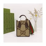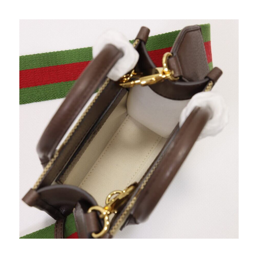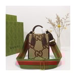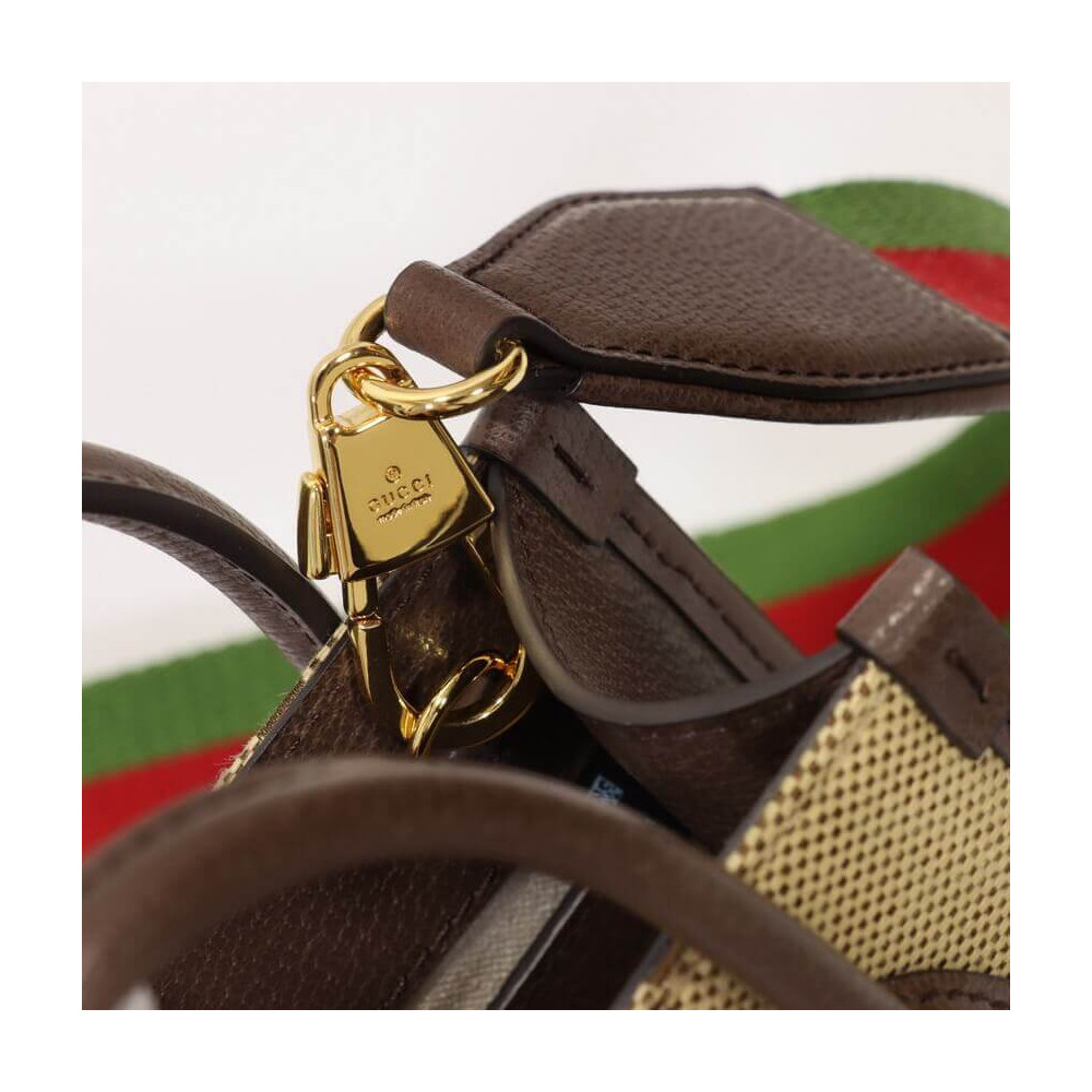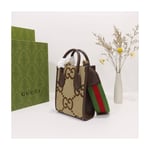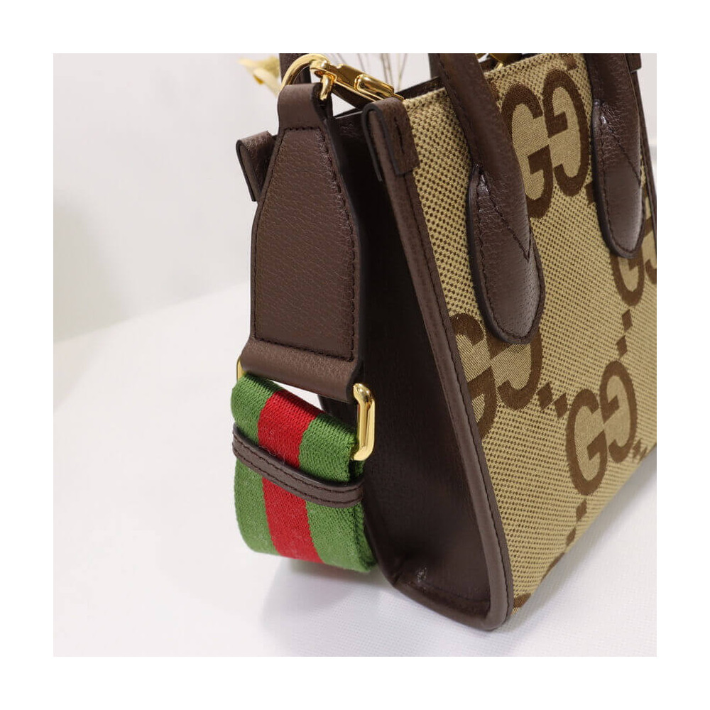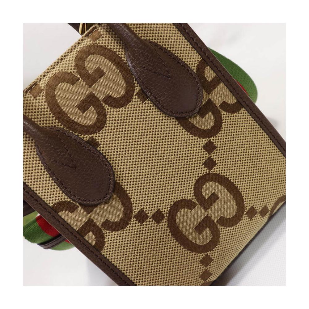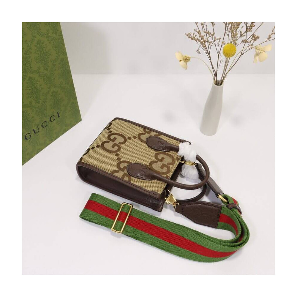First seen as part of Gucci Aria, the jumbo version of the emblematic GG motif returns atop signature luggage pieces, imbuing each design with a pronounced logo feel. This mini tote bag is accentuated by the signature green and red House Web, a contemporary take on a Gucci archival belt buckle from the ’70s.