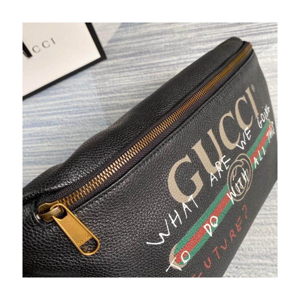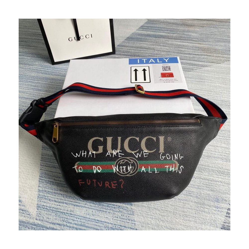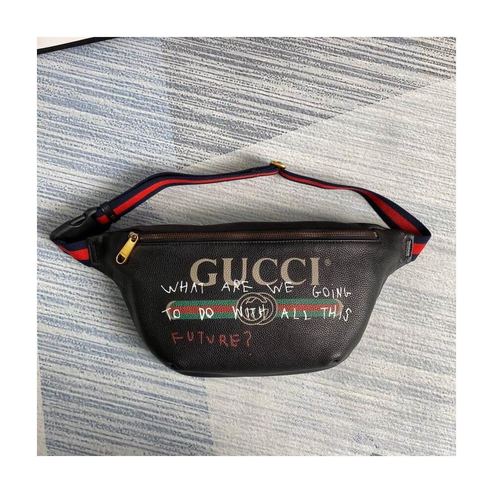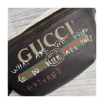 For Fall Winter 2017, artist Coco Capitán collaborated with Gucci on a special range of accessories and ready-to-wear that feature her signature phrases. The ironic and witty handwritten aphorisms appear over the Gucci vintage logo and bring together Coco Capitán’s offbeat sense of humour with the eclectic House aesthetic. This leather belt bag is printed with the phrase “What are we going to do with all this future?”