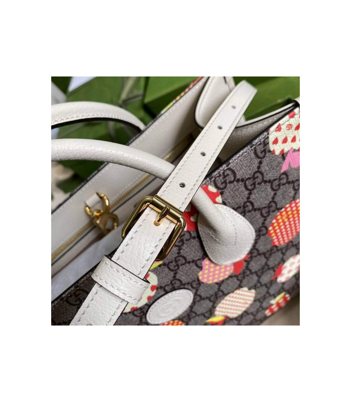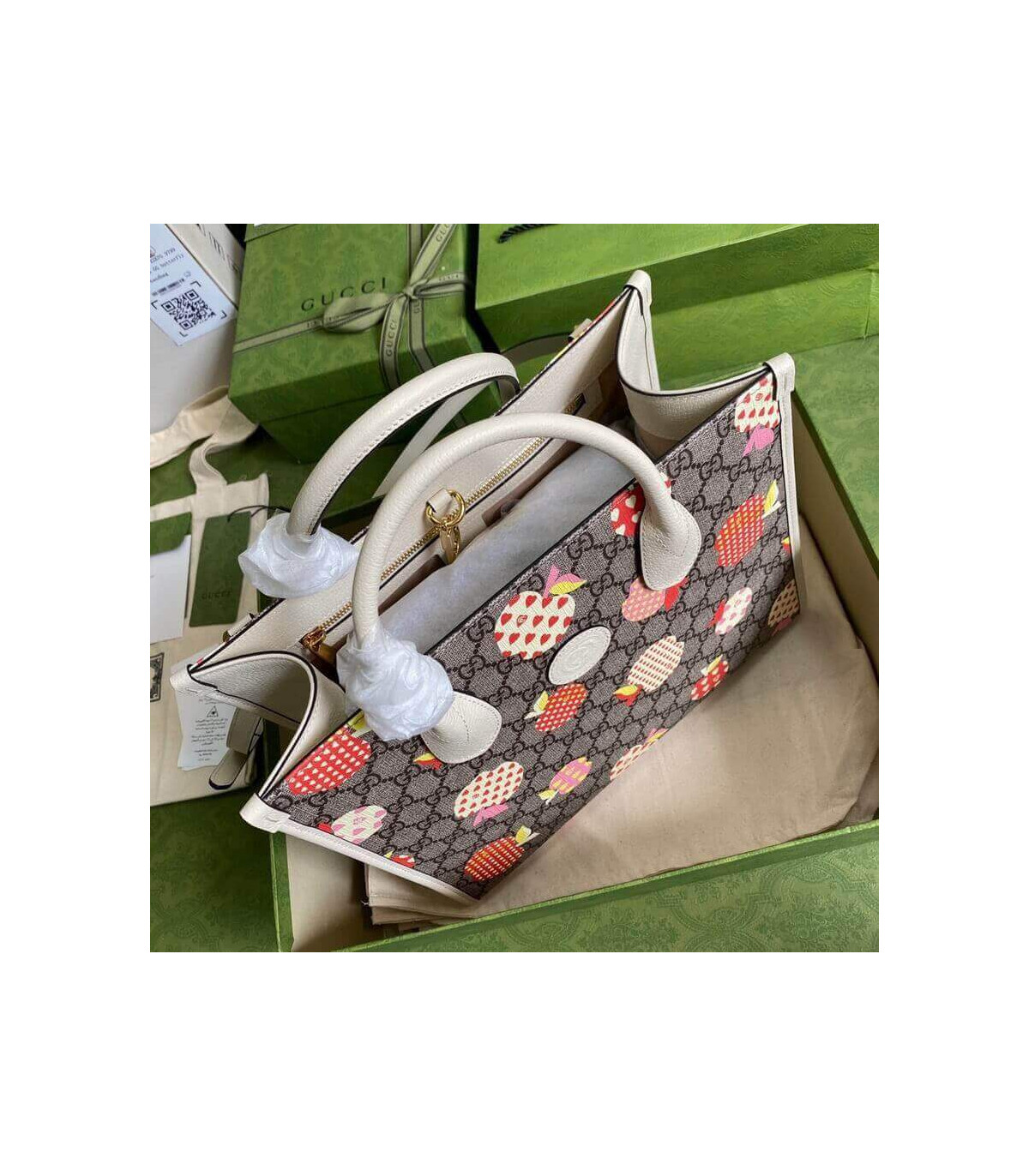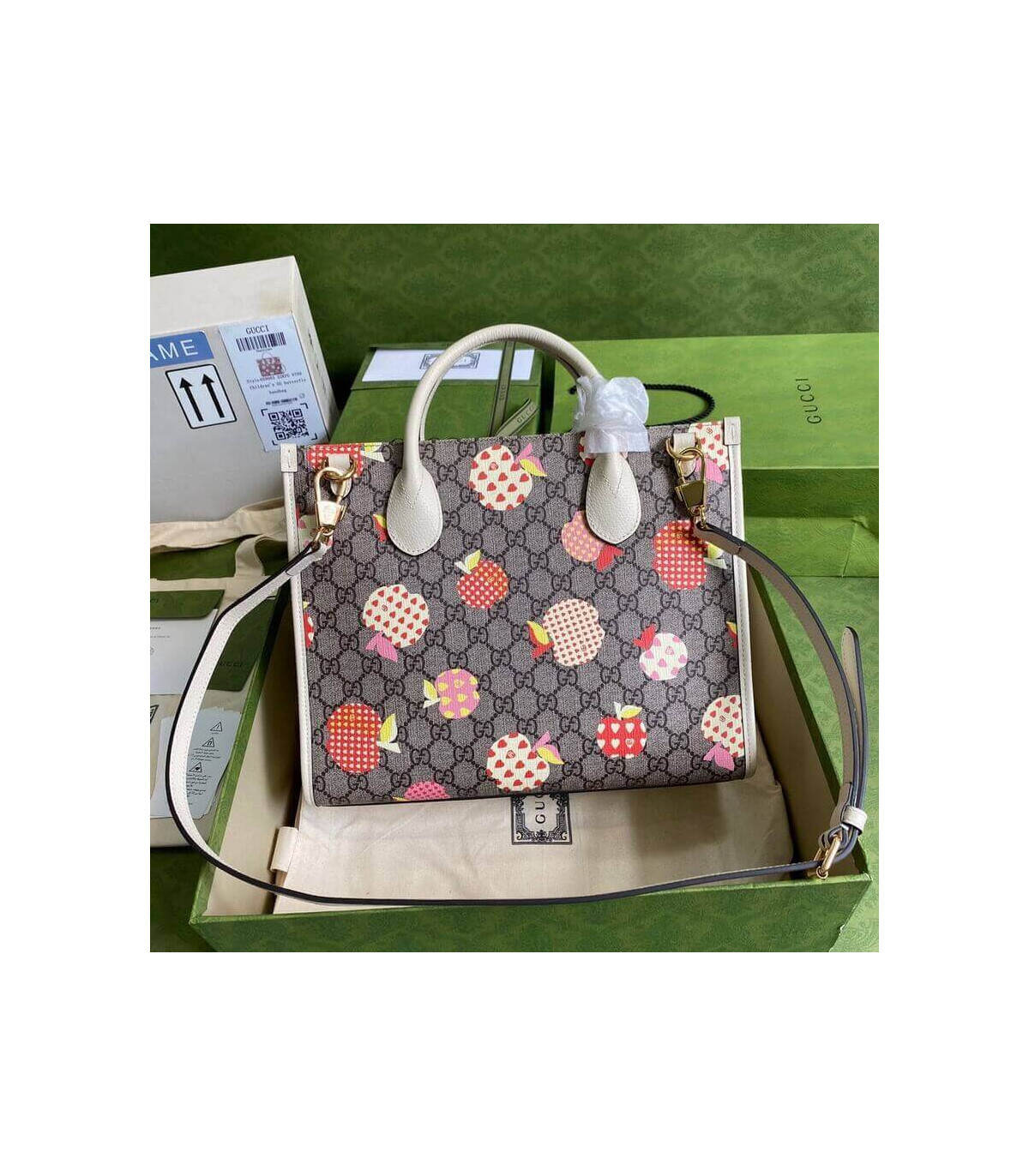 An emblem of the Gucci’s playful spirit, fruits and vegetables have become contemporary House codes that animate the latest collections. Speaking to this theme, this small tote is defined by a whimsical apple motif.