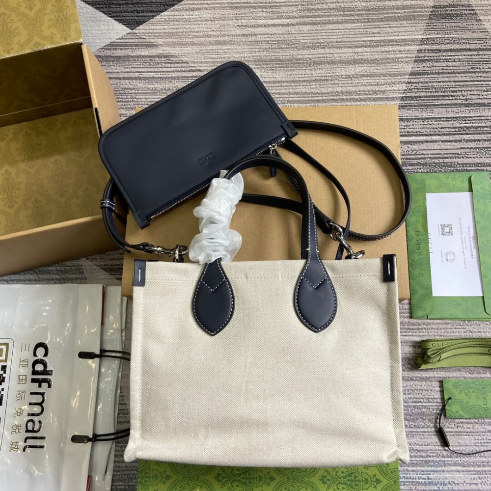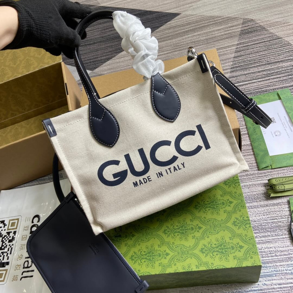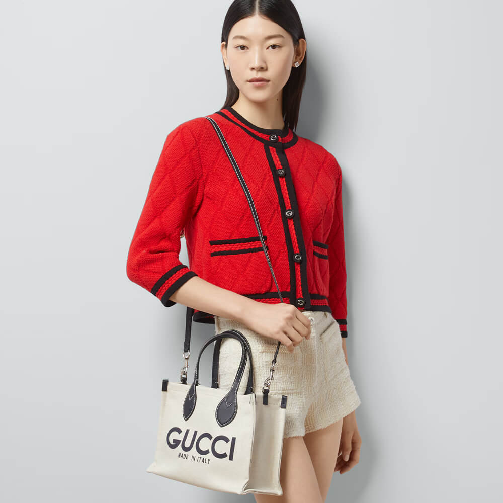 Well-known prints of the House constantly evolve to tell a unique narrative. An essential storytelling element of the Cruise 2024 collection, the ‘Gucci Made in Italy’ print defines this beige canvas tote bag with a light brown trim and GG Supreme lining.