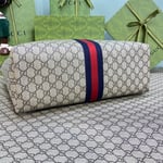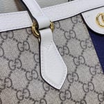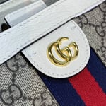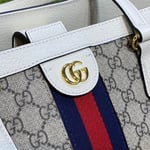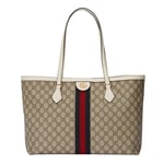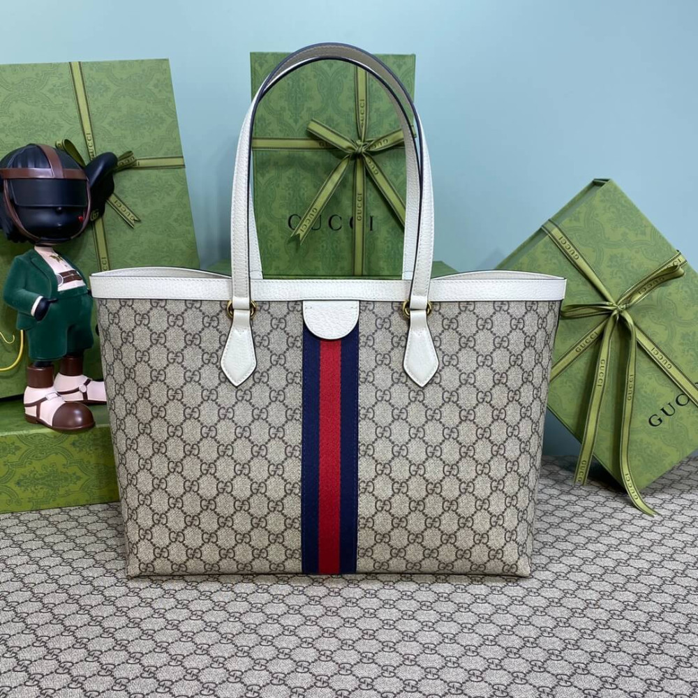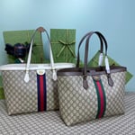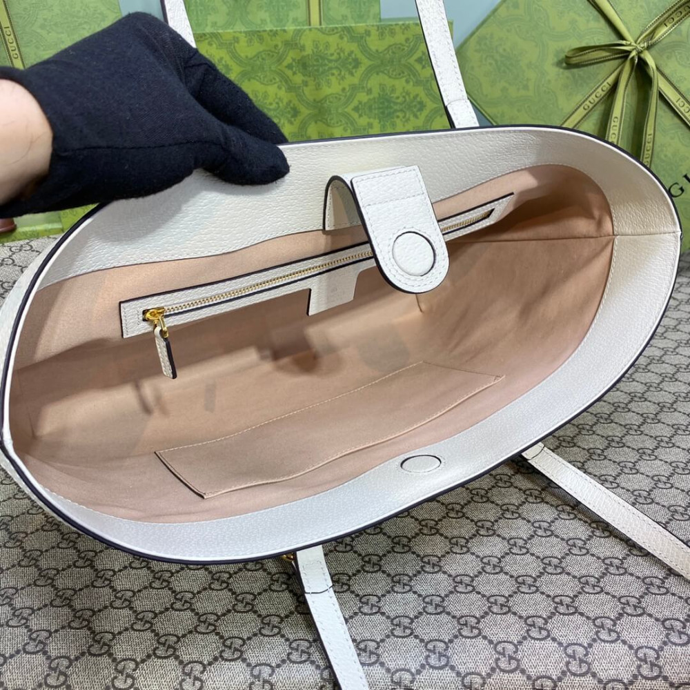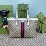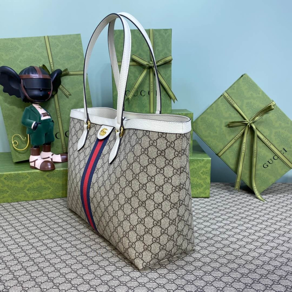 A classic combination of the House’s most defining codes―the GG motif and Web stripe―the world of Ophidia continues to evolve, incorporating new shapes and silhouettes each season. With recognizable design elements in a practical new shape, this new medium sized tote is trimmed with textured leather and topped with Double G hardware. Thanks to its long leather handles, the style can also be carried as a shoulder bag.