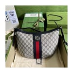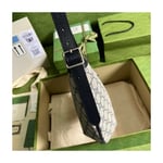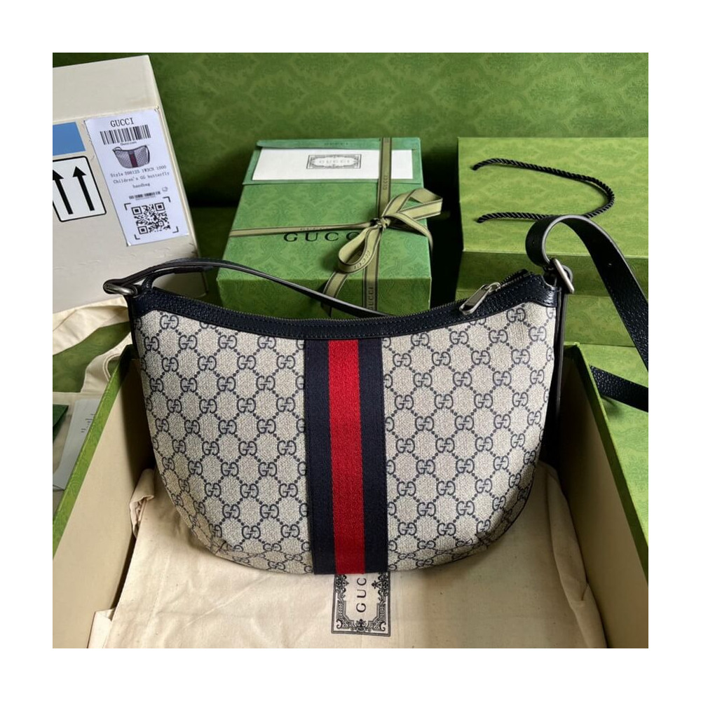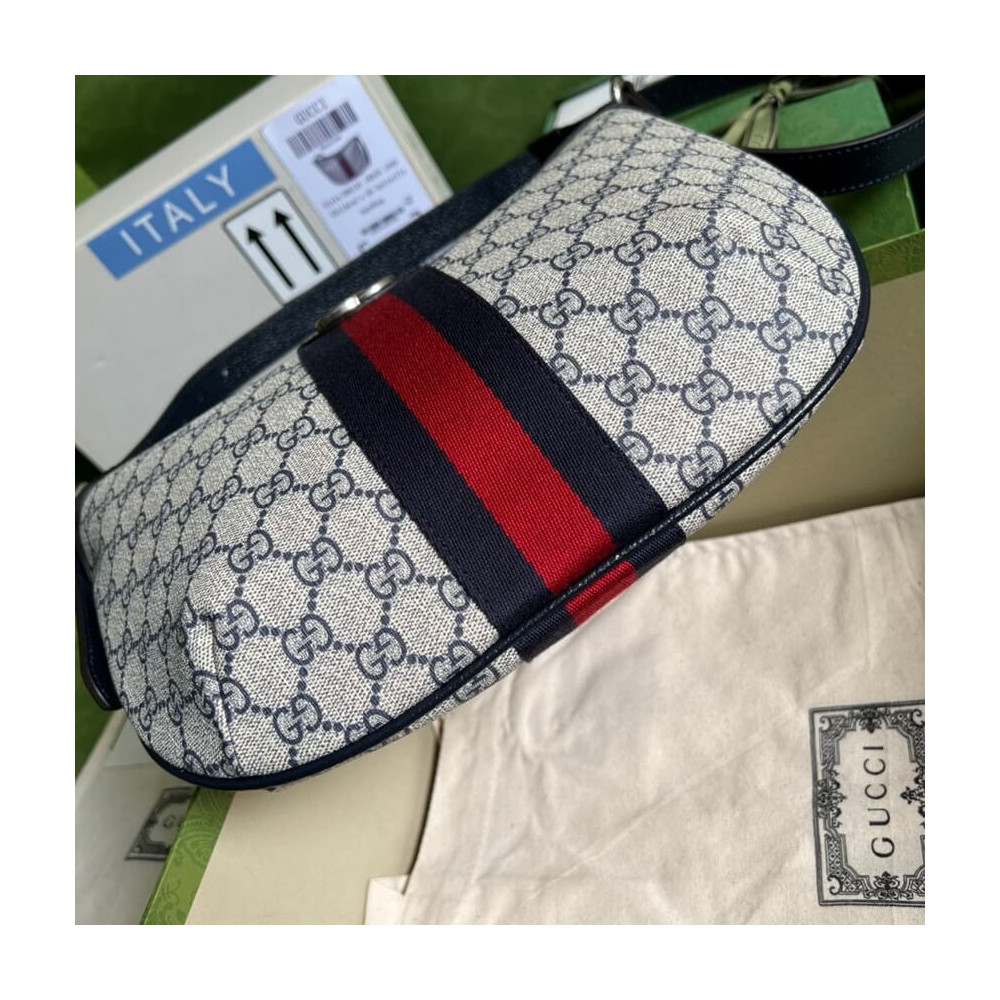Mirroring the material’s historic origins, GG Supreme is introduced in a timeless mix of blue and beige for Gucci Love Parade. With a low environmental impact, the canvas has come to the front of each collection decade after decade to become a hallmark of the House. Here, the classic palette defines this Ophidia shoulder bag.