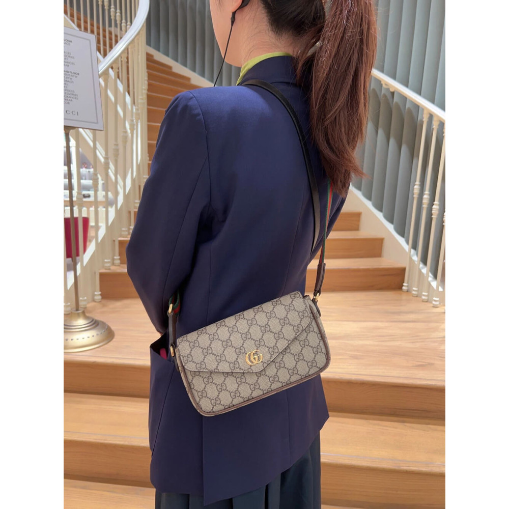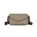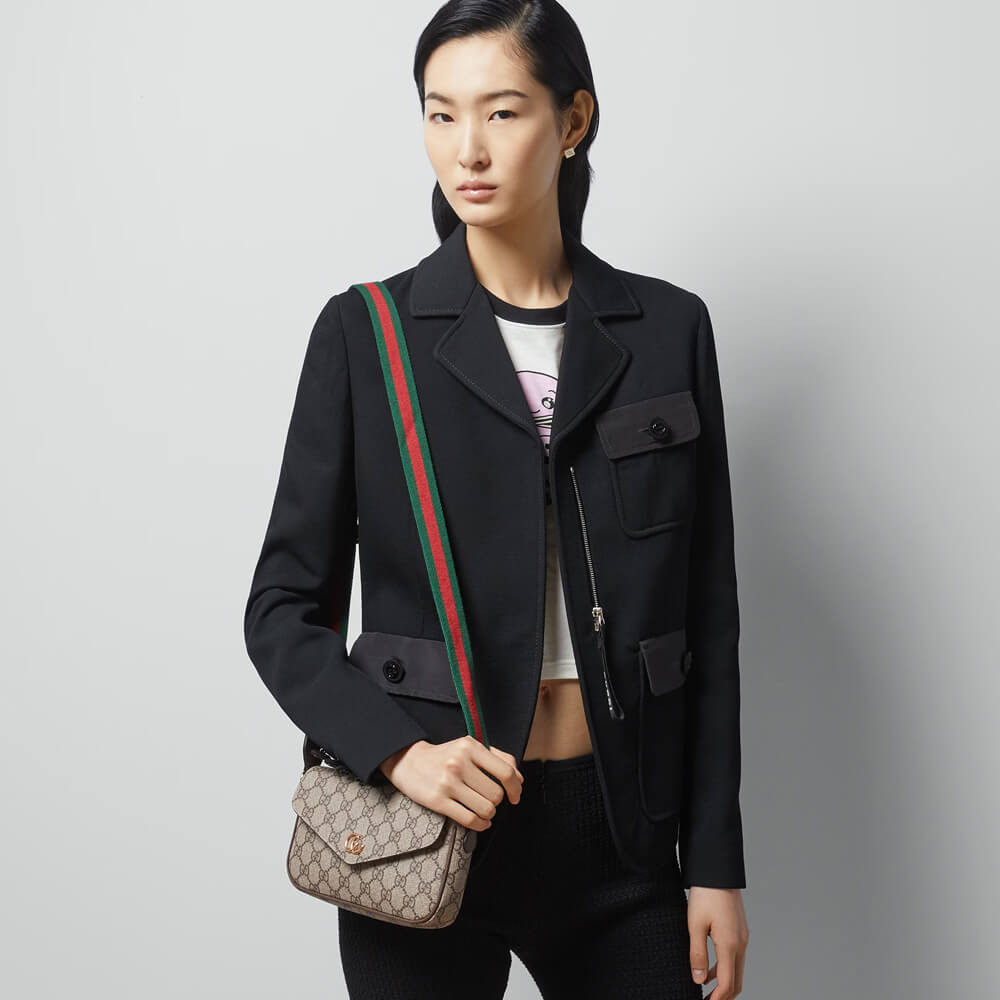 The world of Ophidia continues to evolve, incorporating new shapes and materials each season. Crafted from beige and ebony GG Supreme canvas, this mini bag is further enriched by the Double G hardware and a Web shoulder strap.