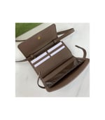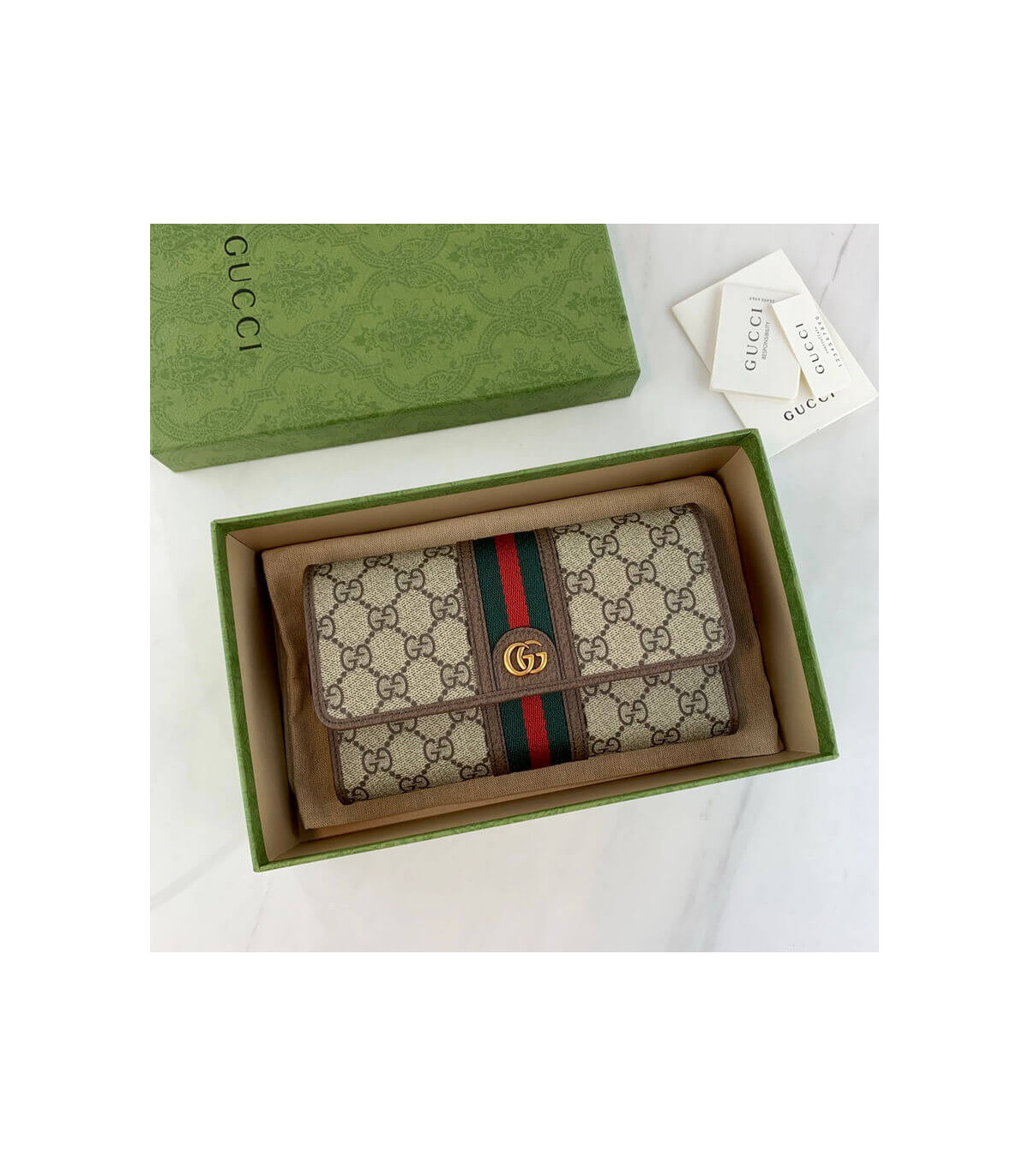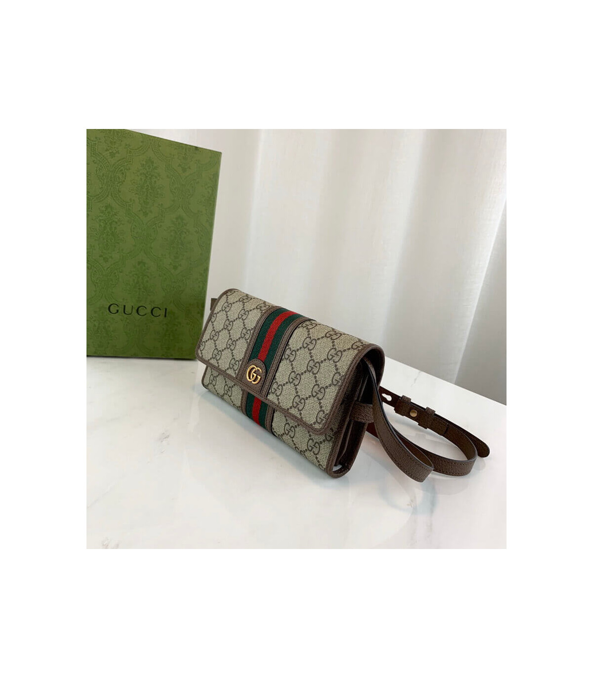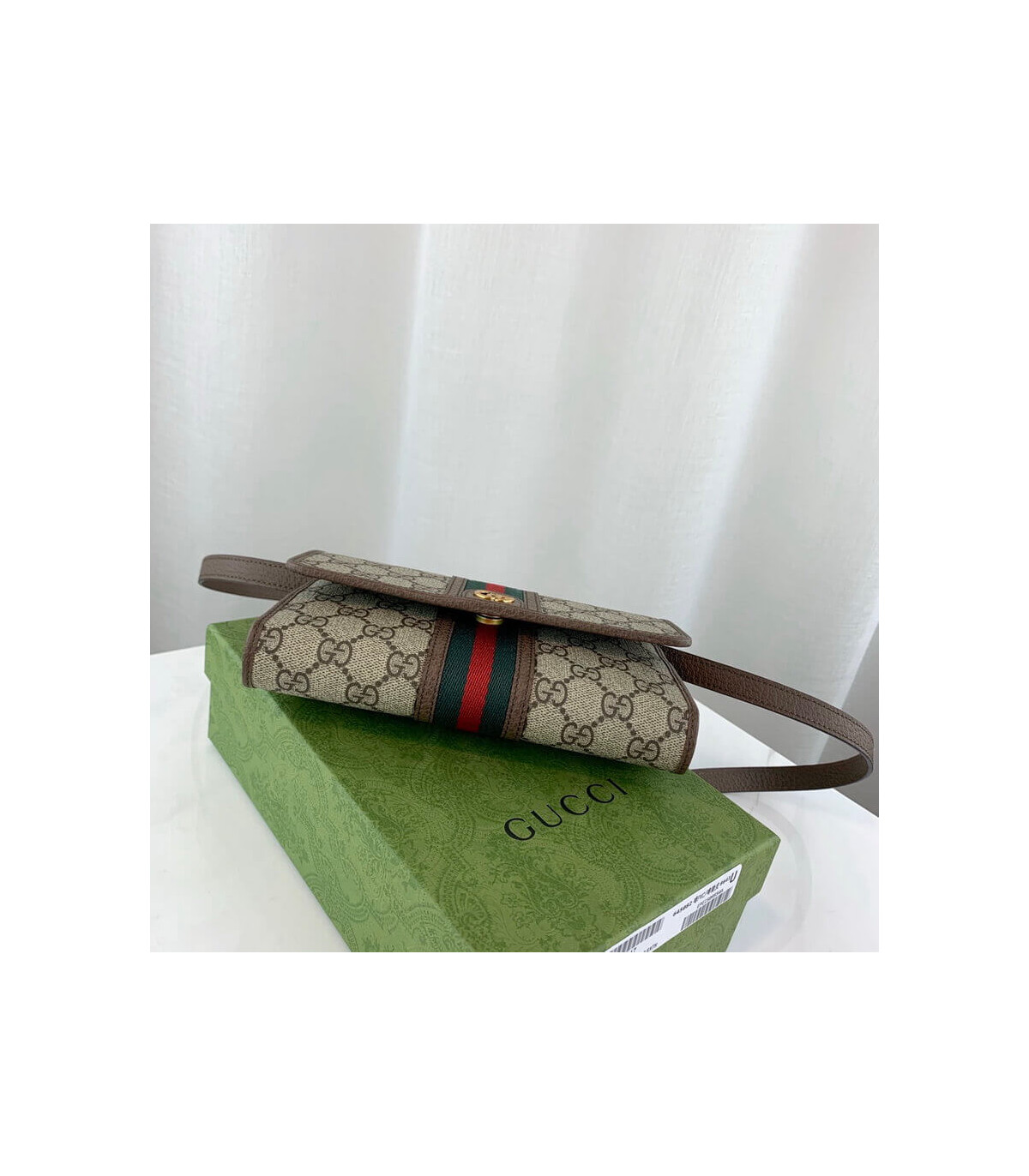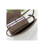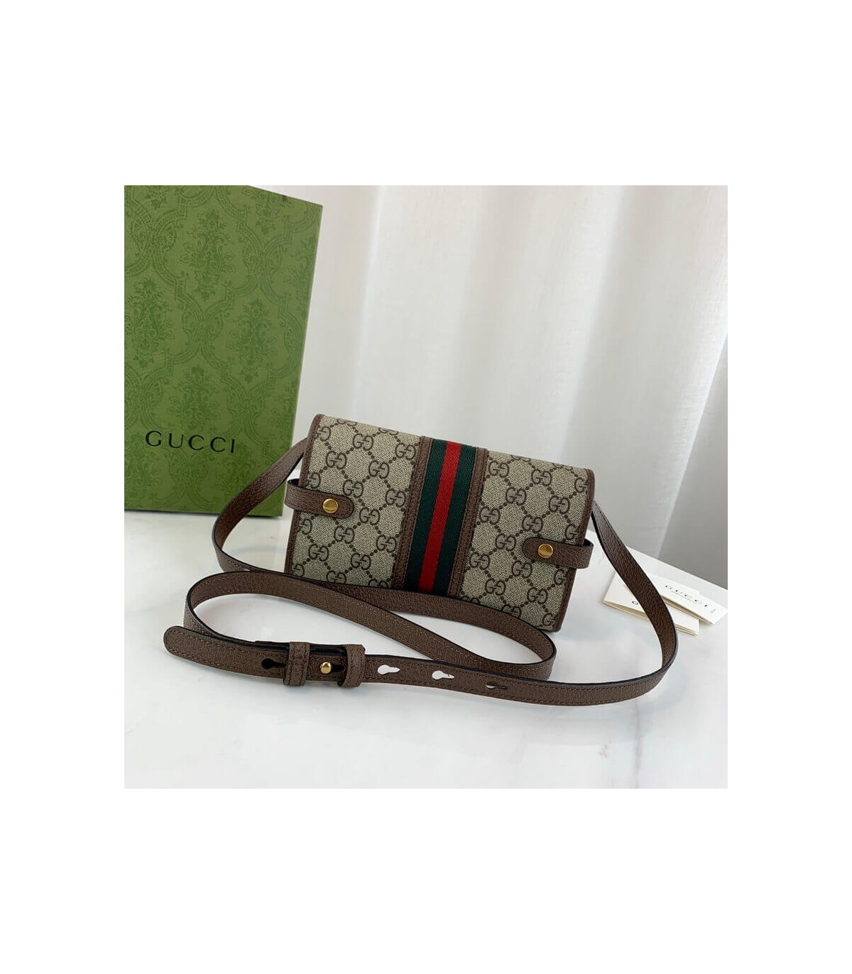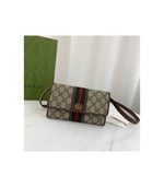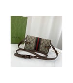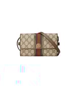The world of Ophidia evolves with the introduction of a mini bag crafted in the House’s signature monogram canvas with inlaid green and red Web stripe. The accessory is enhanced by the Double G, an archival Gucci code from the ’70s