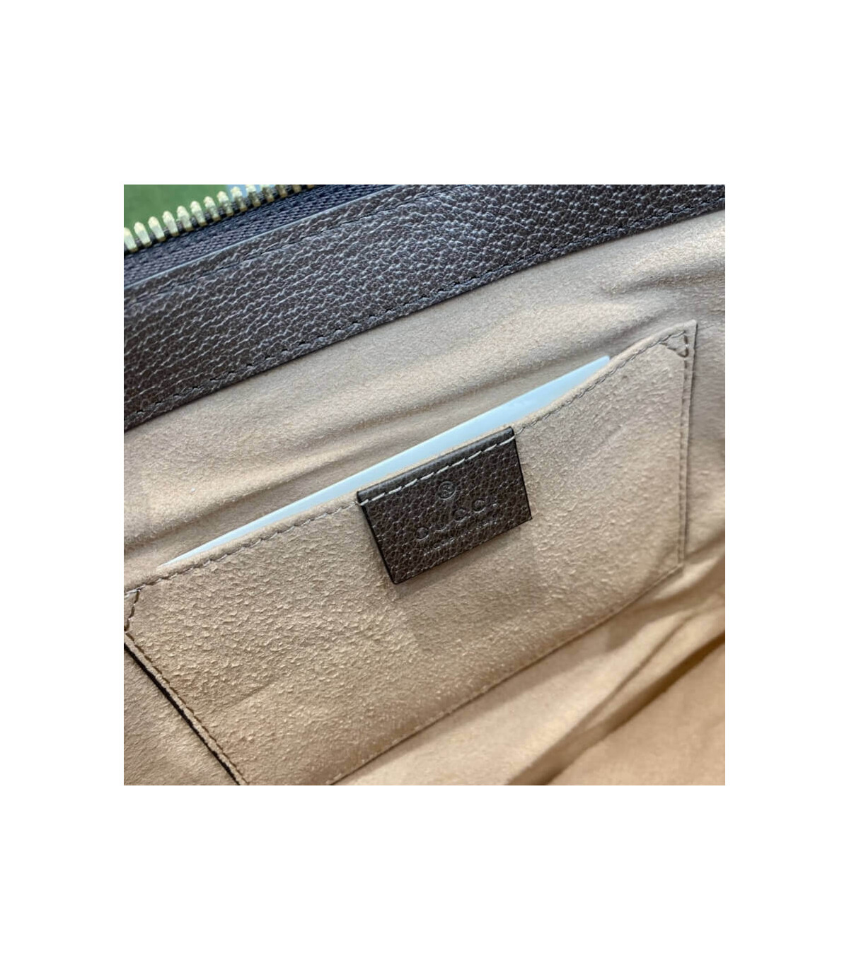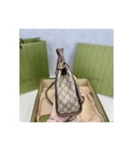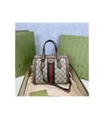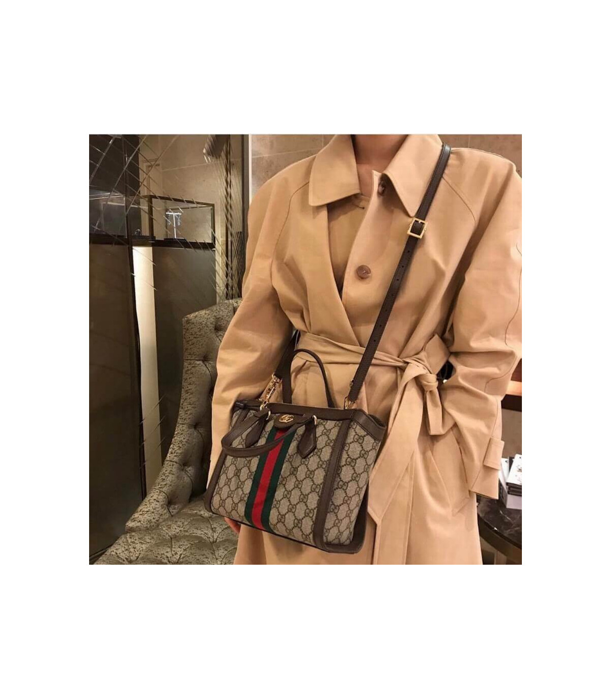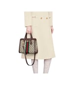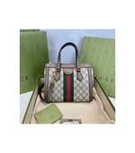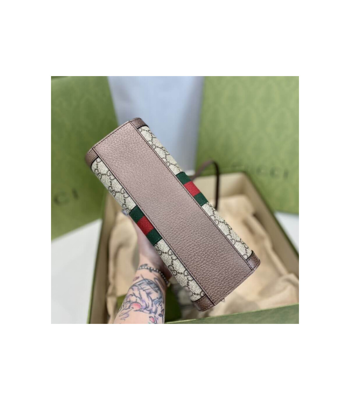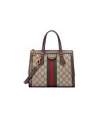 The world of Ophidia evolves with the introduction of a small top handle tote with a detachable shoulder strap. Crafted in GG Supreme canvas with inlaid green and red Web stripe, the accessory is enhanced by a petite play on the Double G, an archival Gucci code from the ’70s that appears atop a leather tab detail and on the zipper pull.