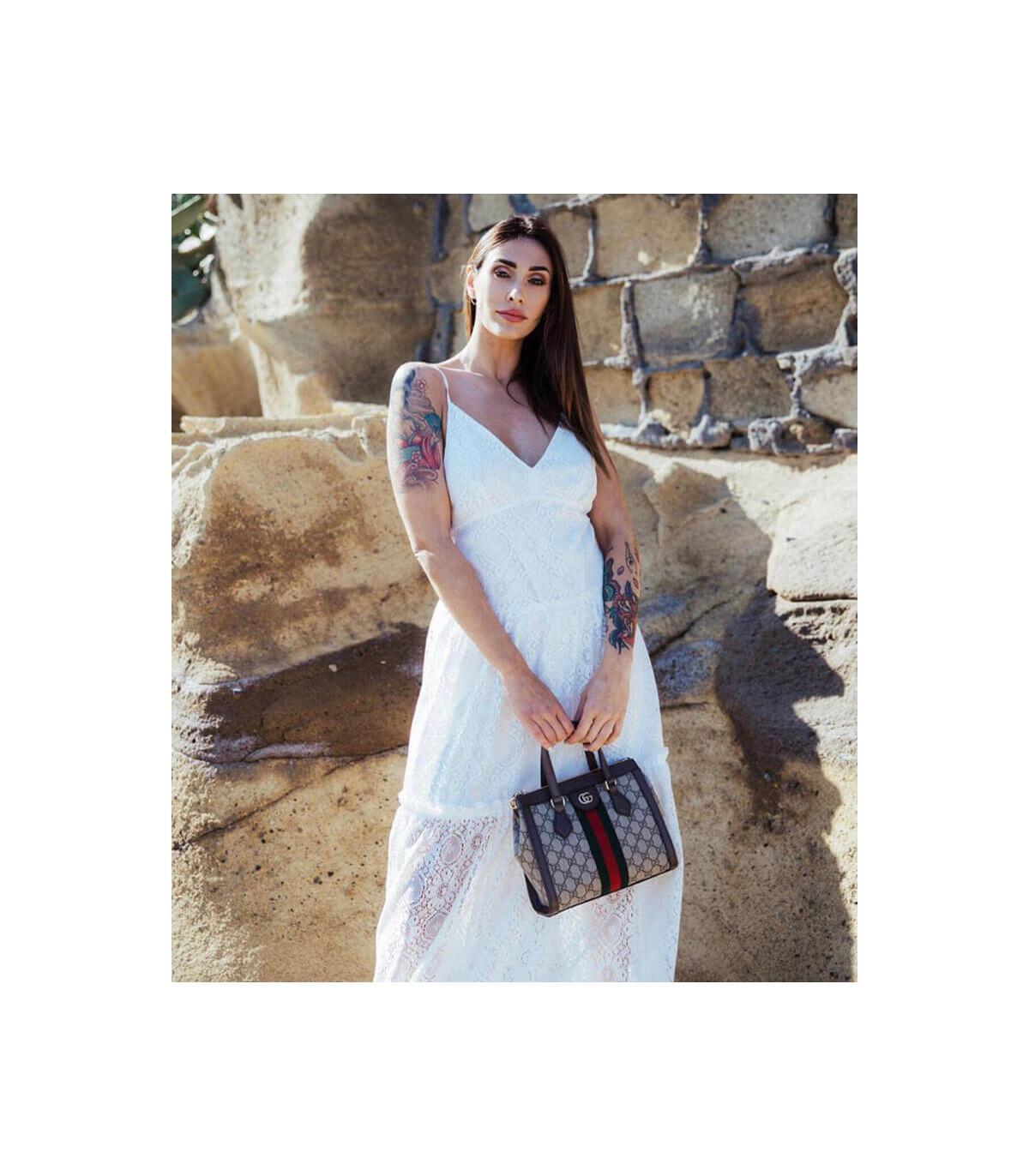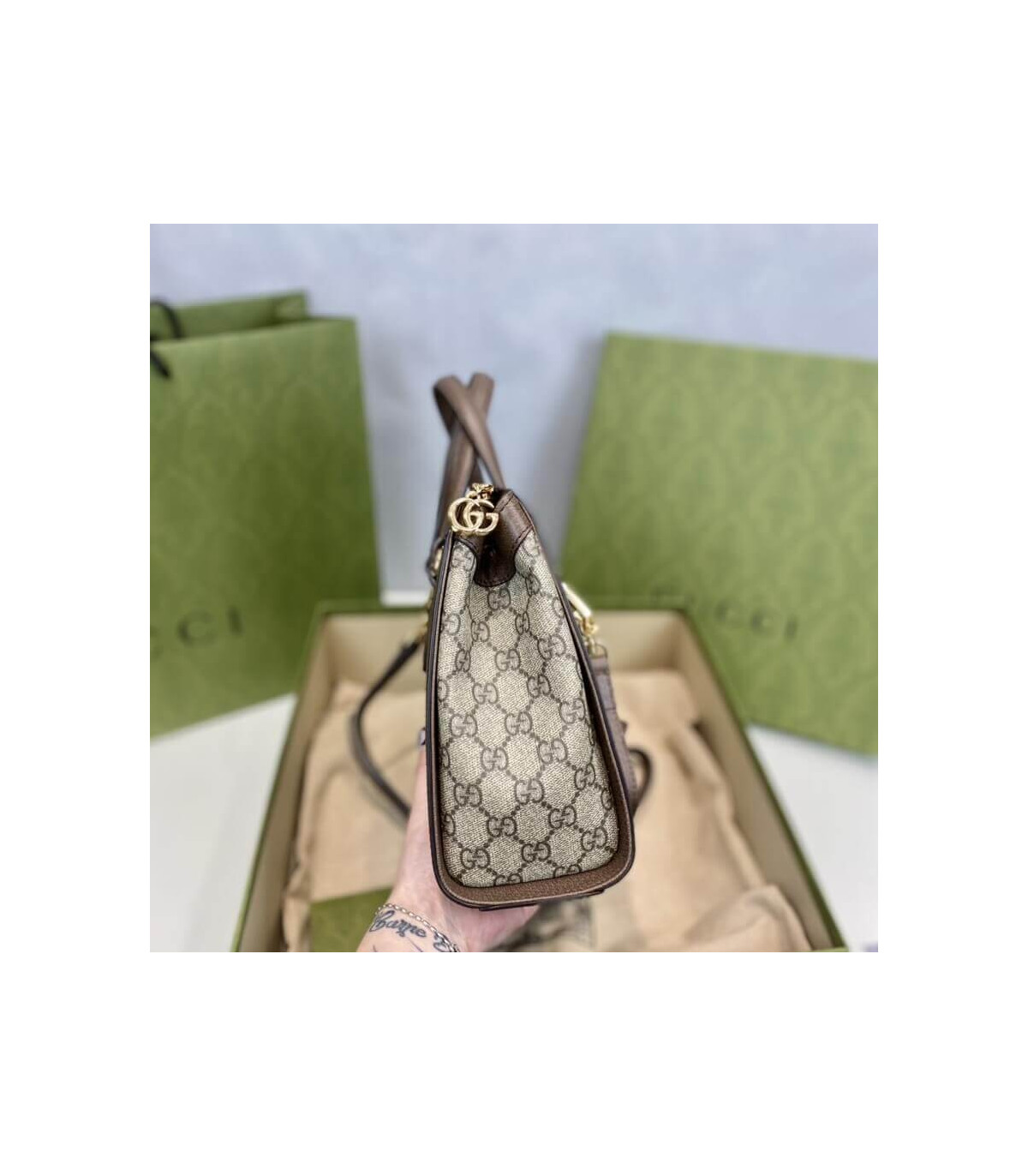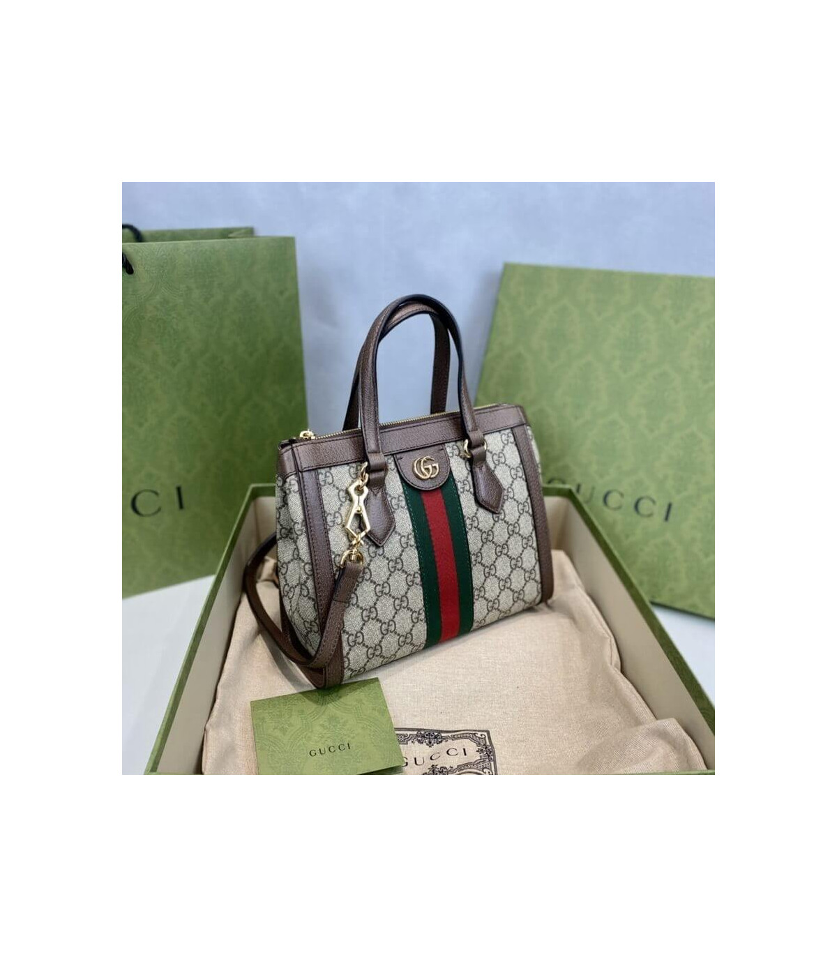 The world of Ophidia evolves with the introduction of a small top handle tote with a detachable shoulder strap. Crafted in GG Supreme canvas with inlaid green and red Web stripe, the accessory is enhanced by a petite play on the Double G, an archival Gucci code from the ’70s that appears atop a leather tab detail and on the zipper pull.
