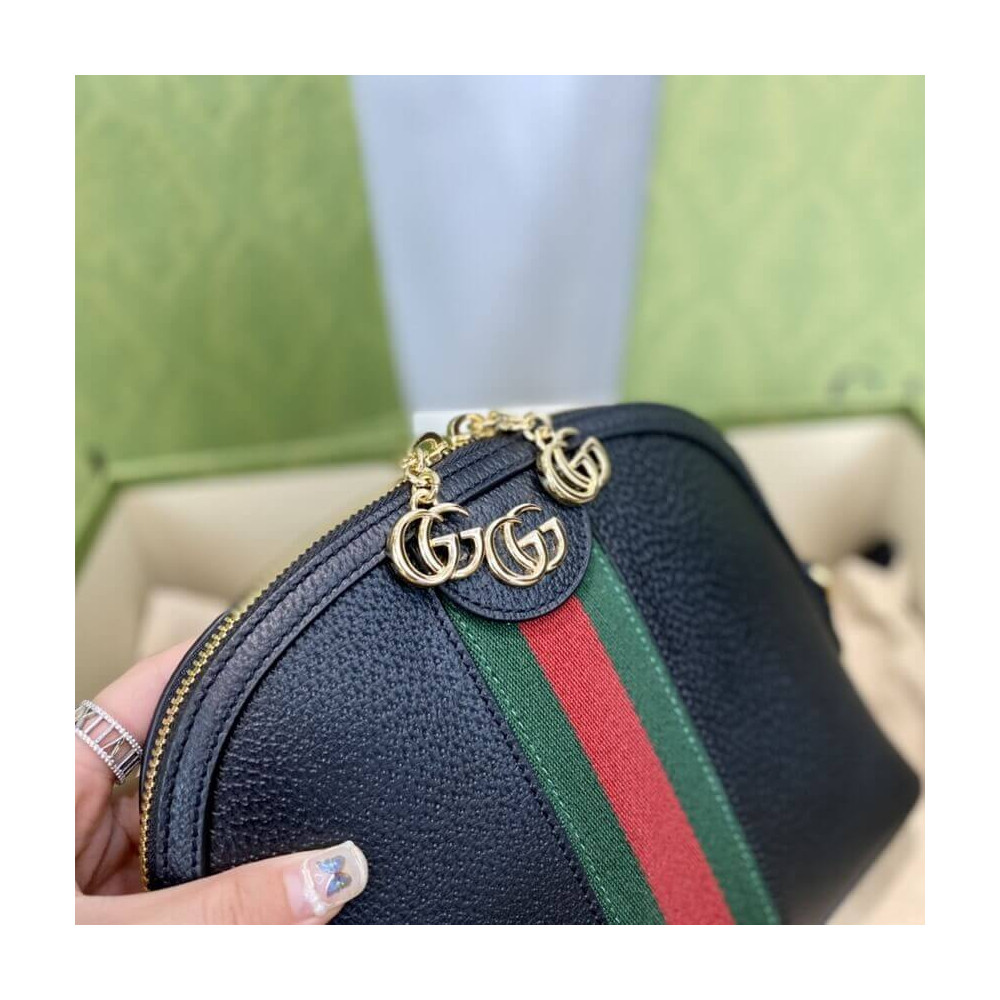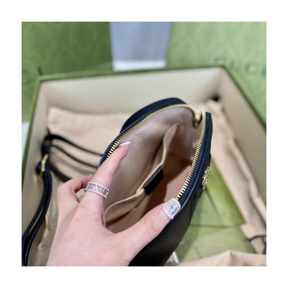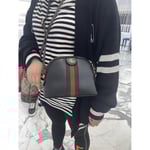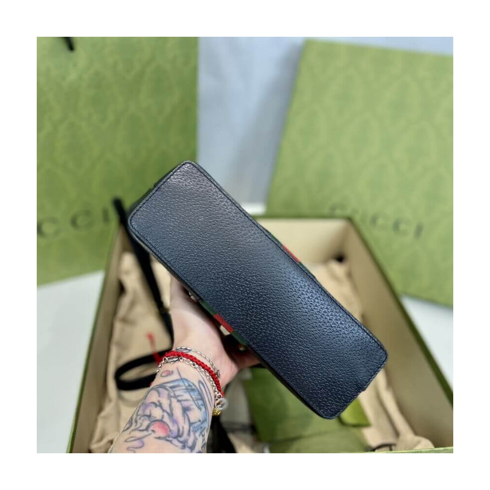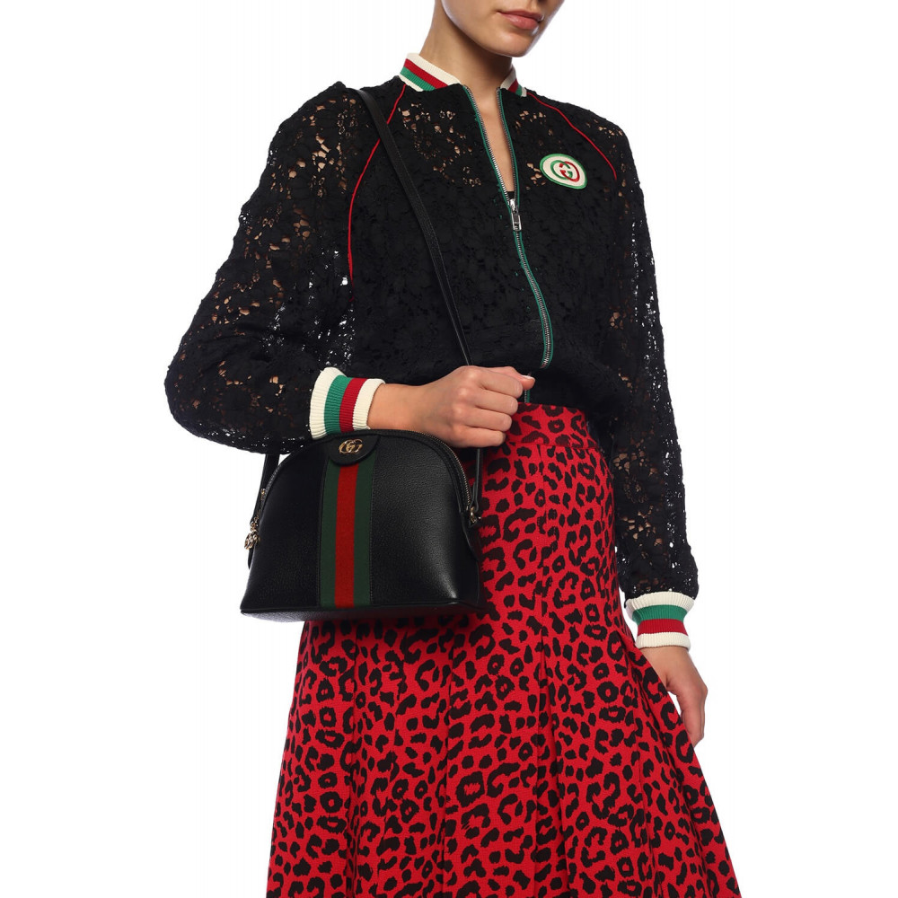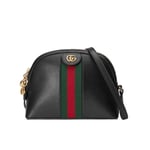 The rounded top Ophidia shoulder bag is introduced in a new iteration for Pre-Fall 2019, crafted from black leather with inlaid green and red Web stripe. The coveted style is defined by small Double G details at the front tab and zipper pulls―a contemporary take on a Gucci archival belt buckle from the ’70s, repurposed into a precious petite variation.