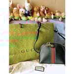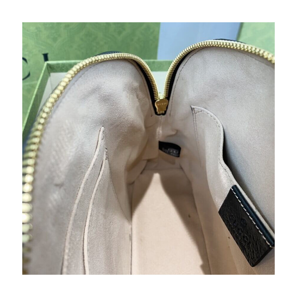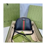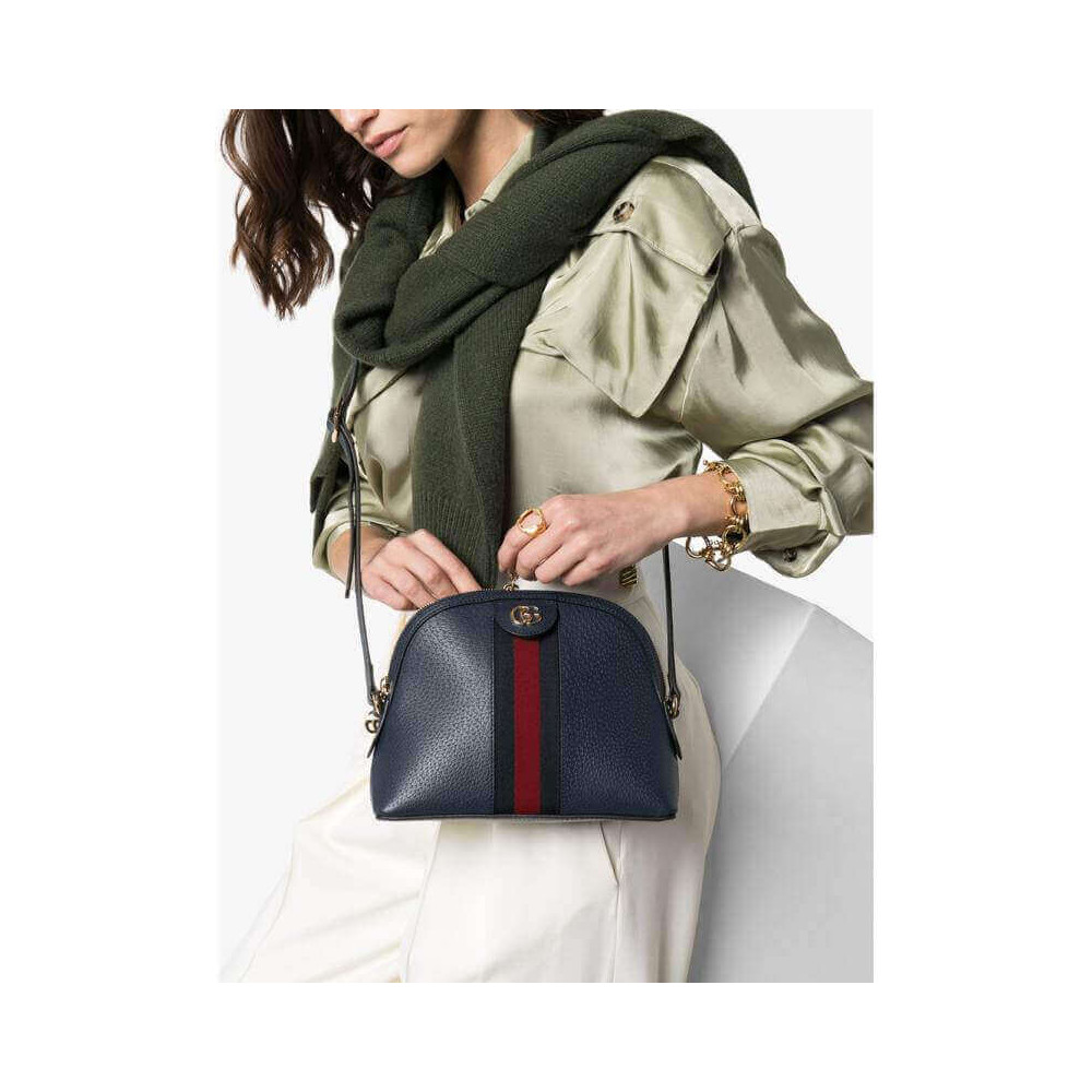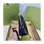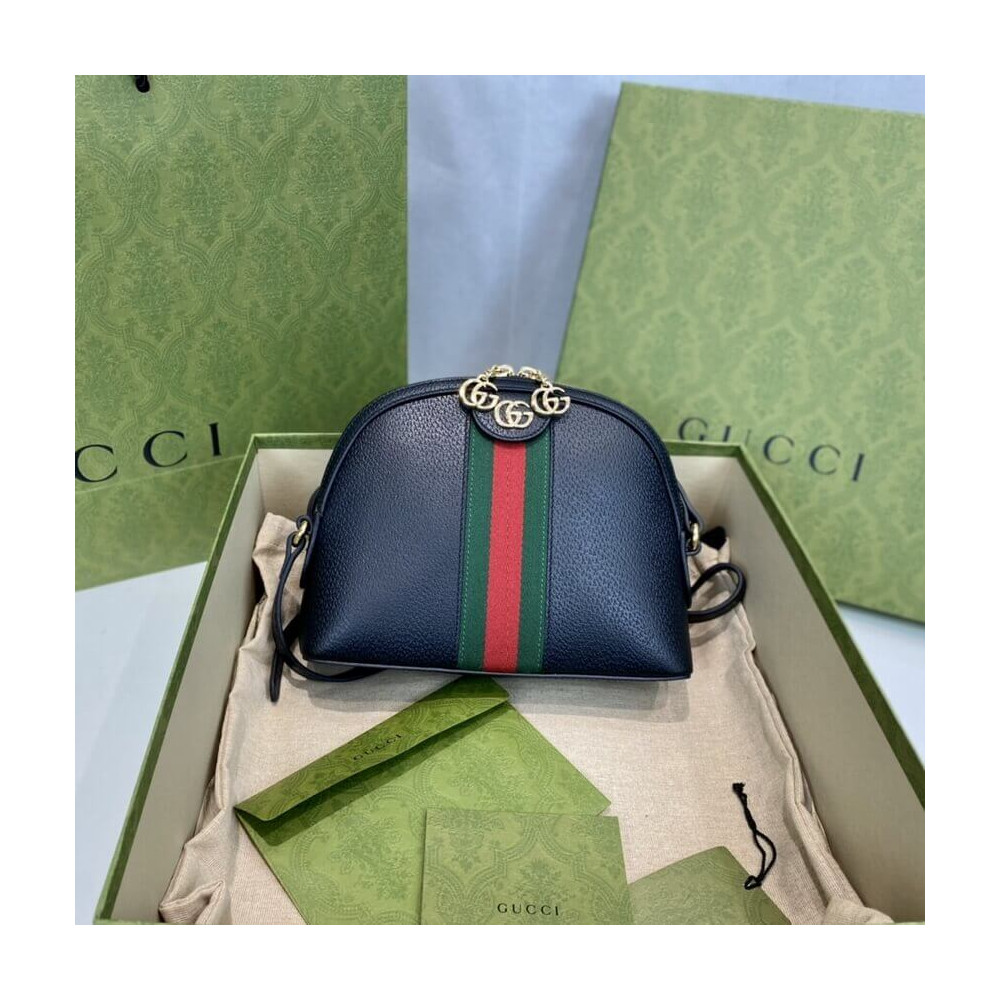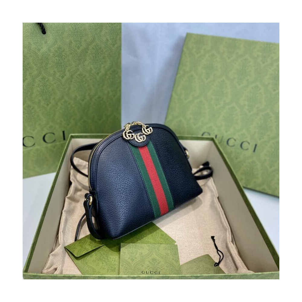 The rounded top Ophidia shoulder bag is introduced in a new iteration for Pre-Fall 2019, crafted from black leather with inlaid green and red Web stripe. The coveted style is defined by small Double G details at the front tab and zipper pulls―a contemporary take on a Gucci archival belt buckle from the ’70s, repurposed into a precious petite variation.