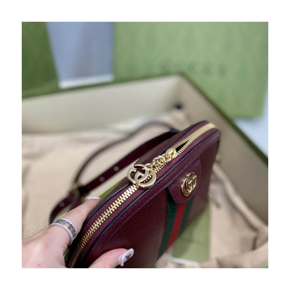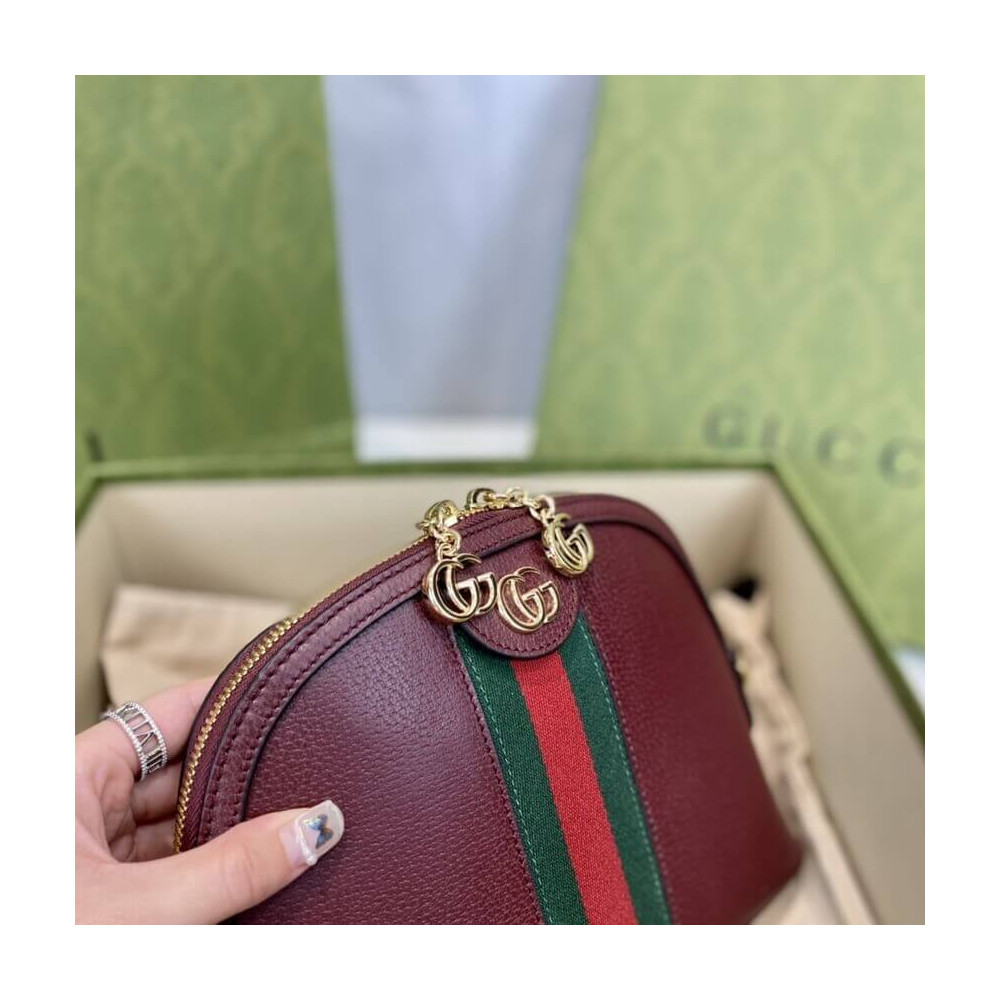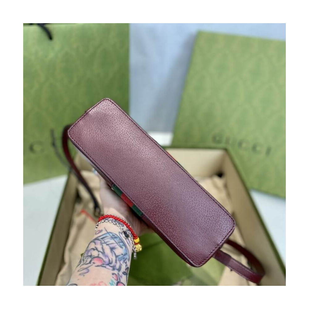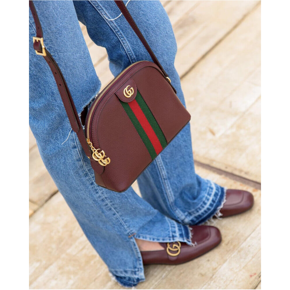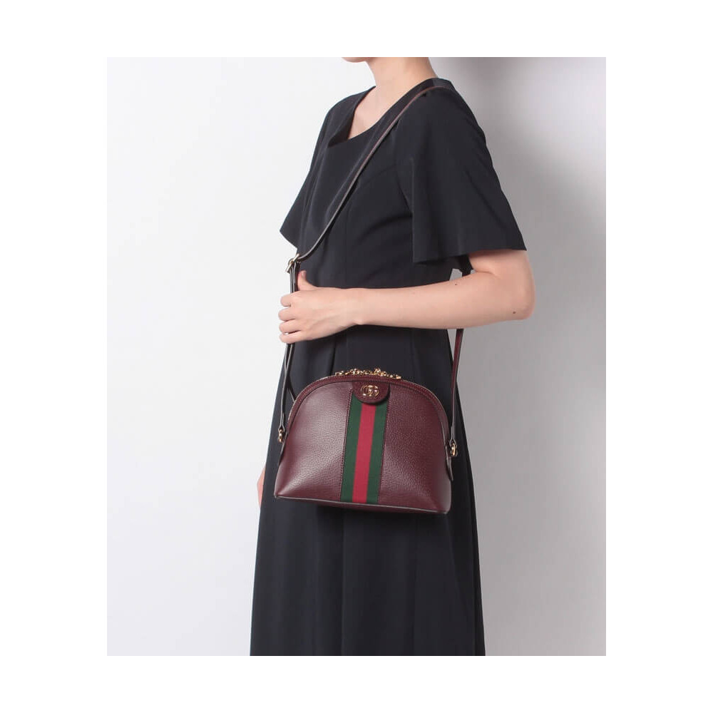 The rounded top Ophidia shoulder bag is introduced in a new iteration for Pre-Fall 2019, crafted from black leather with inlaid green and red Web stripe. The coveted style is defined by small Double G details at the front tab and zipper pulls―a contemporary take on a Gucci archival belt buckle from the ’70s, repurposed into a precious petite variation.