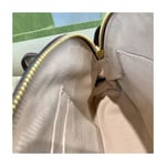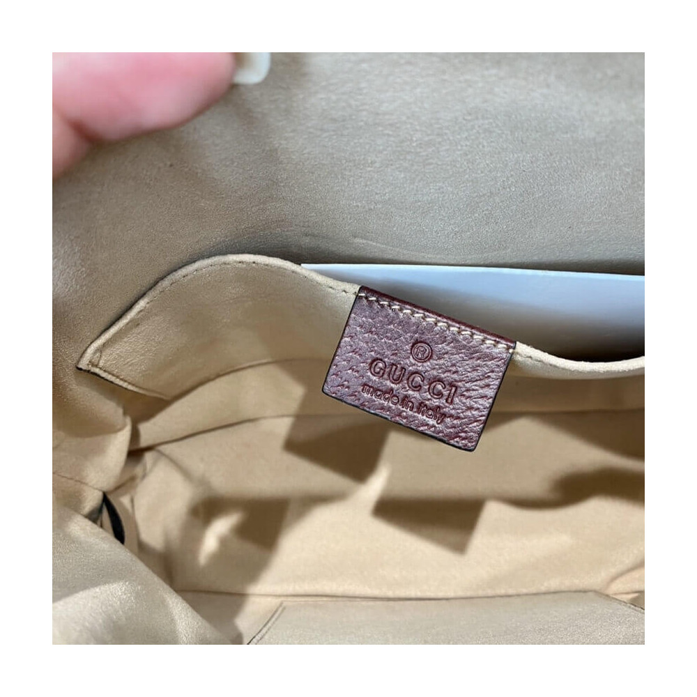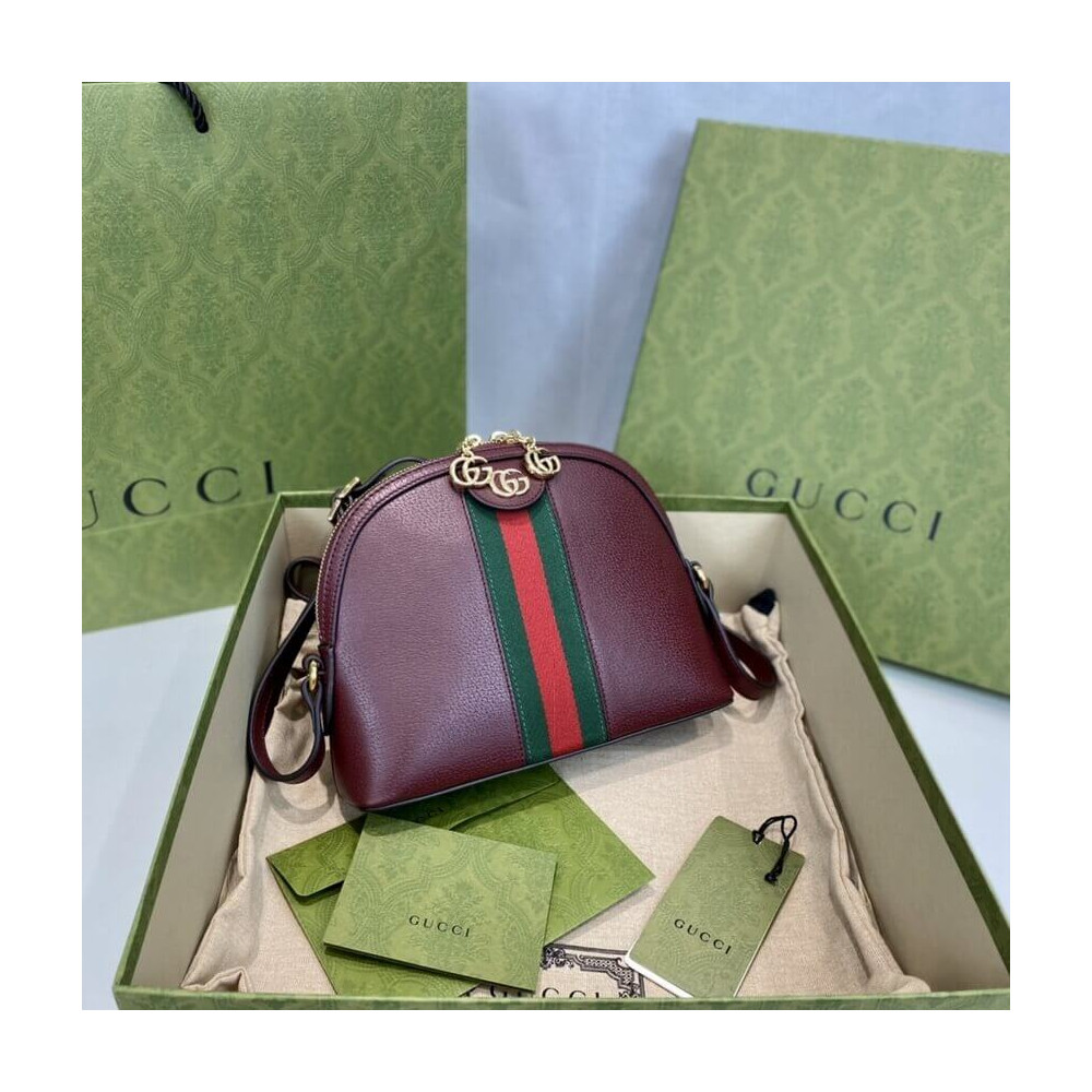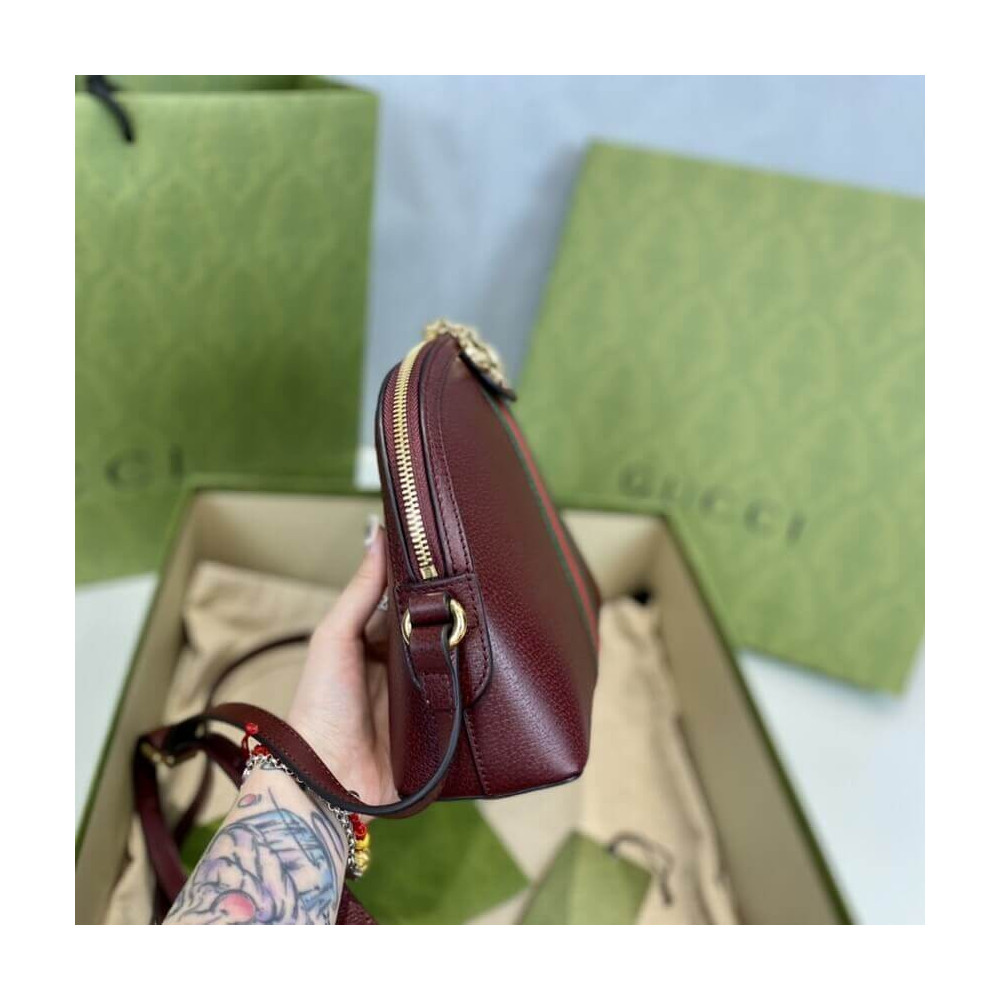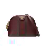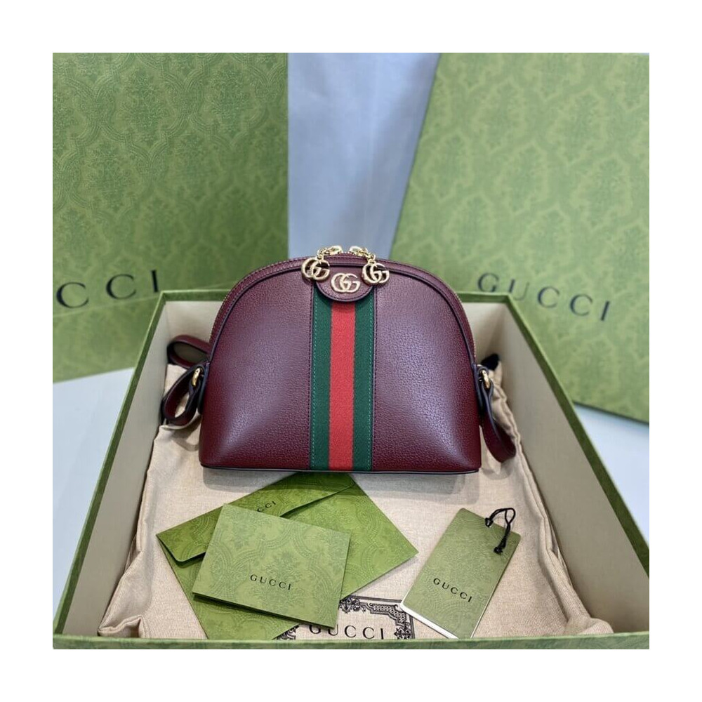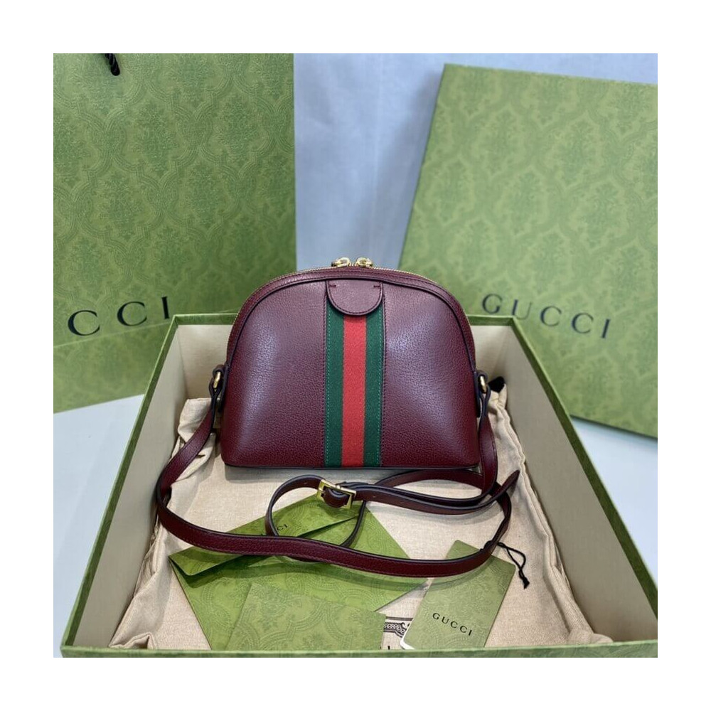 The rounded top Ophidia shoulder bag is introduced in a new iteration for Pre-Fall 2019, crafted from black leather with inlaid green and red Web stripe. The coveted style is defined by small Double G details at the front tab and zipper pulls―a contemporary take on a Gucci archival belt buckle from the ’70s, repurposed into a precious petite variation.