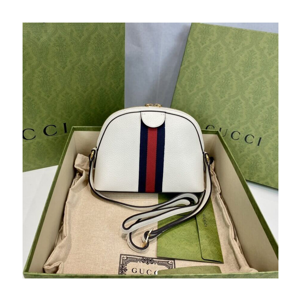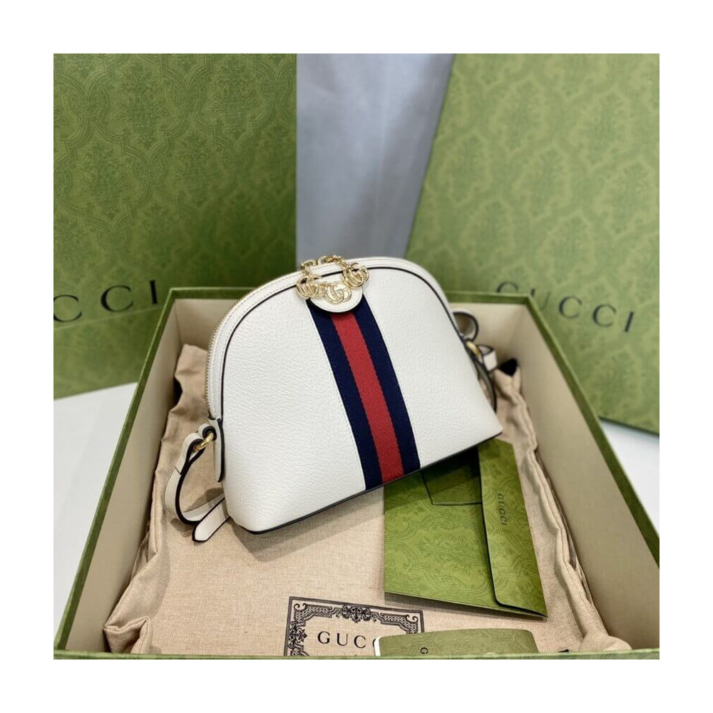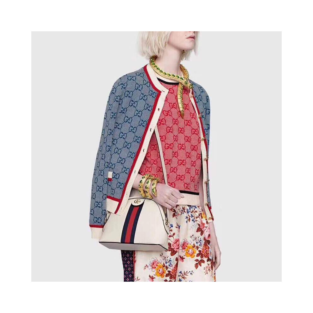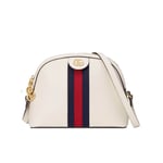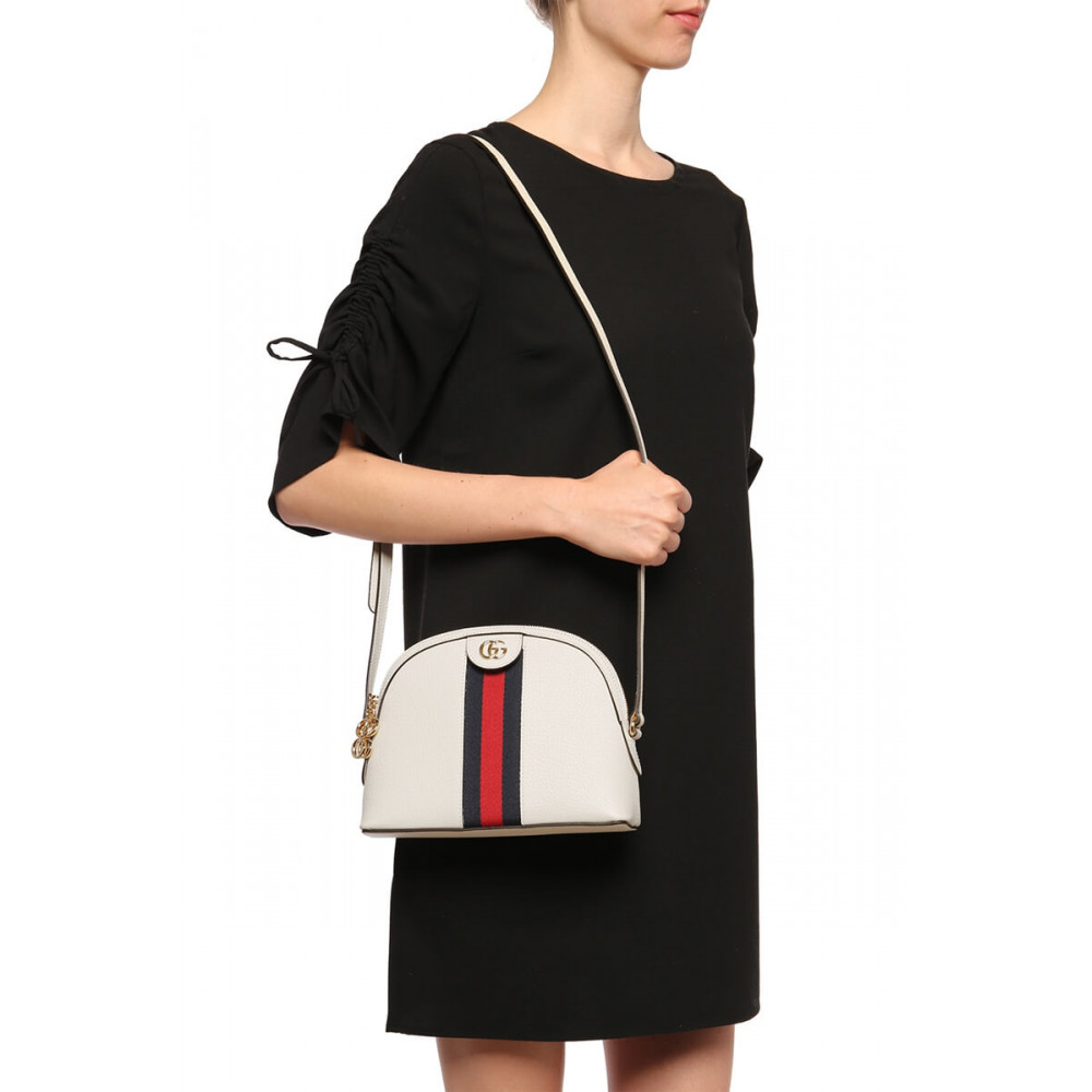 The rounded top Ophidia shoulder bag is introduced in a new iteration for Pre-Fall 2019, crafted from black leather with inlaid green and red Web stripe. The coveted style is defined by small Double G details at the front tab and zipper pulls―a contemporary take on a Gucci archival belt buckle from the ’70s, repurposed into a precious petite variation.