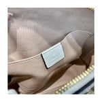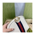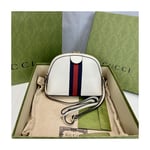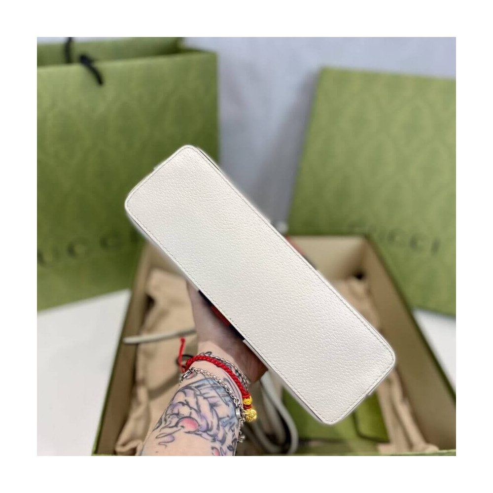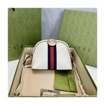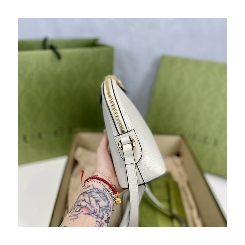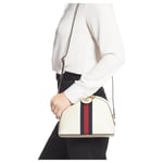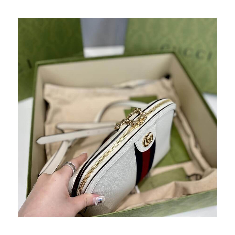 The rounded top Ophidia shoulder bag is introduced in a new iteration for Pre-Fall 2019, crafted from black leather with inlaid green and red Web stripe. The coveted style is defined by small Double G details at the front tab and zipper pulls―a contemporary take on a Gucci archival belt buckle from the ’70s, repurposed into a precious petite variation.