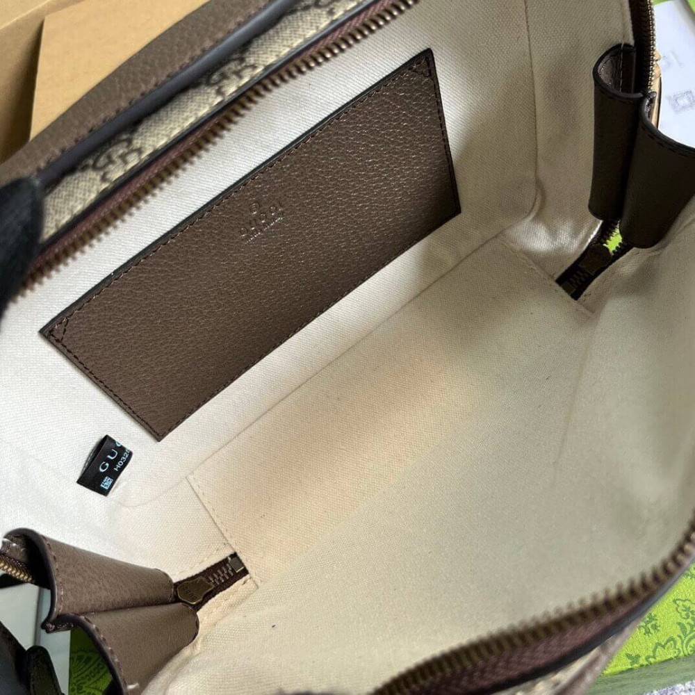 The Ophidia line continues to be one of Gucci signature handbags. New silhouettes are introduced each season, providing versatile travel accessories to suit any destination. The Double G and Web stripe remain integral to the design, presented atop this shoulder bag alongside the signature GG Supreme canvas in beige and ebony.