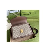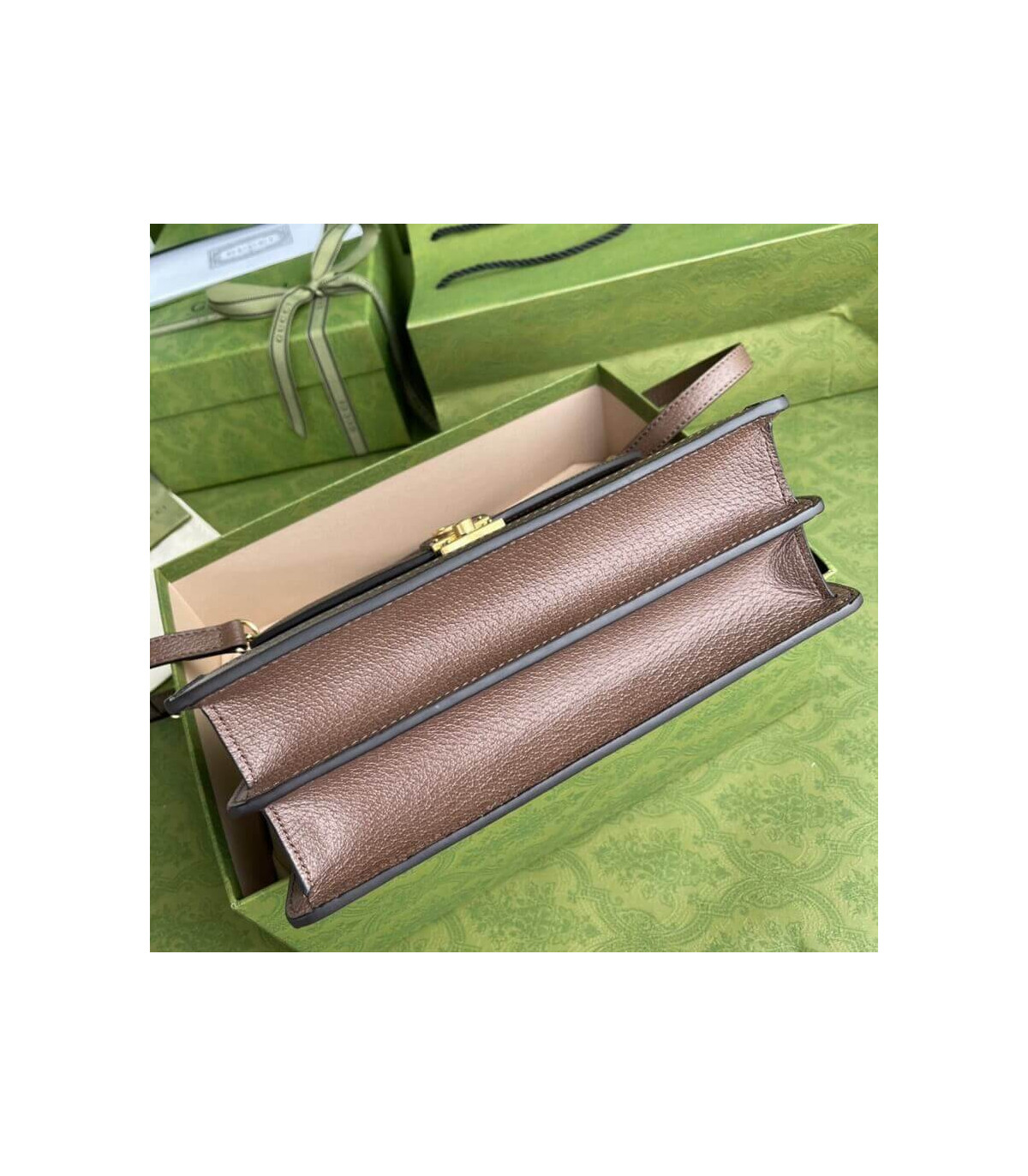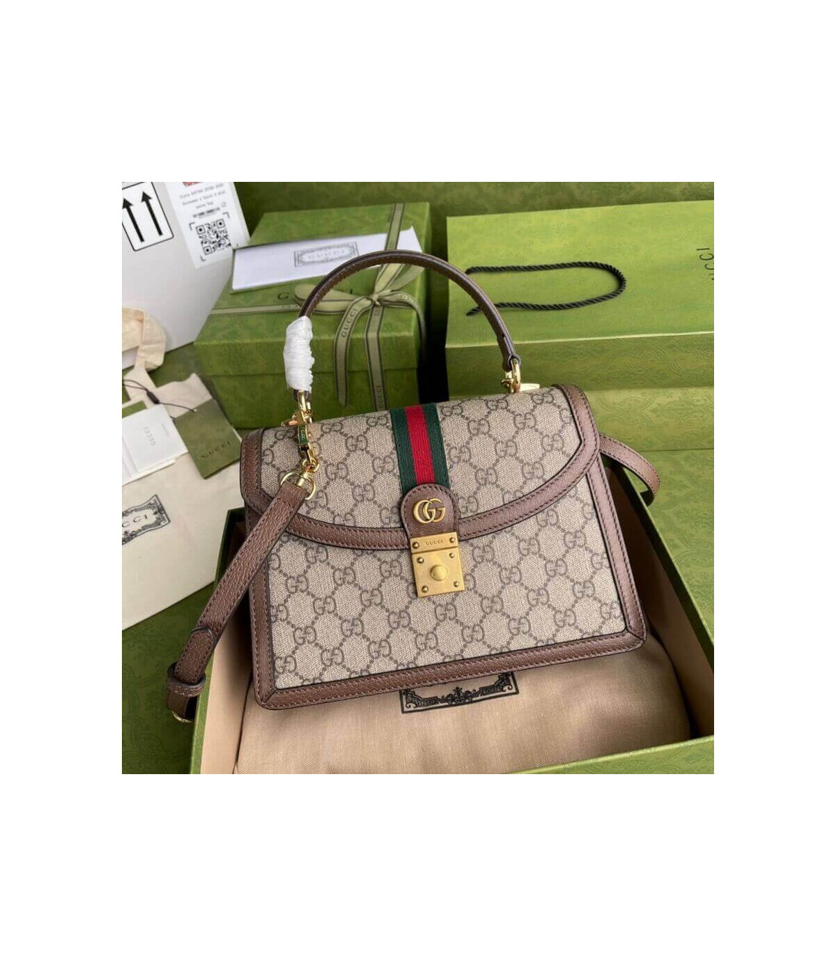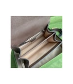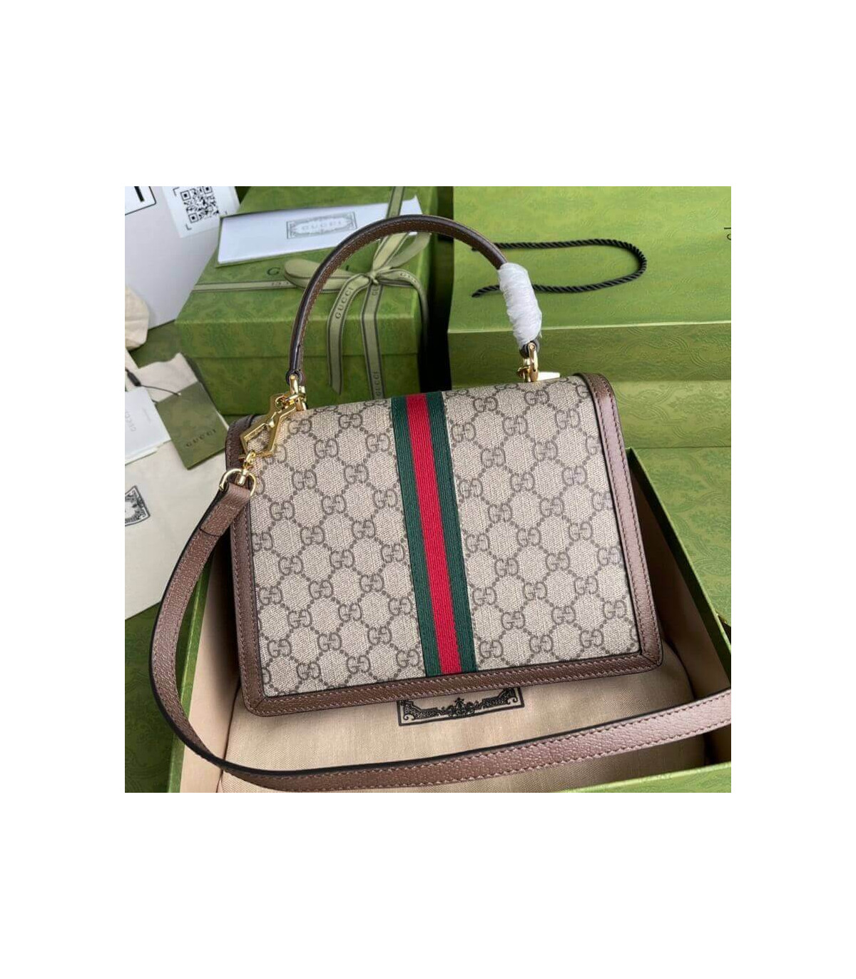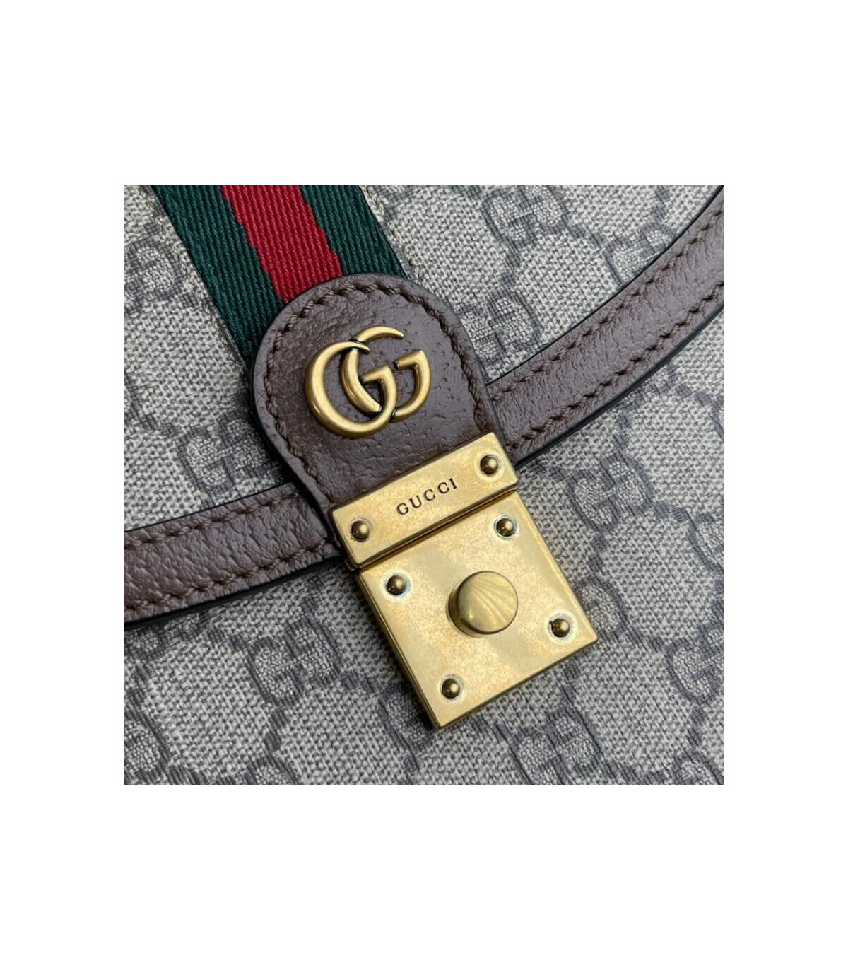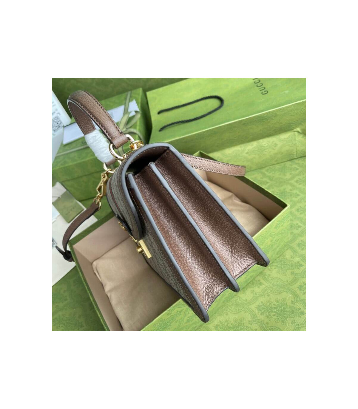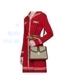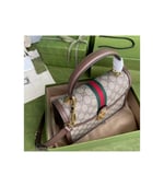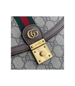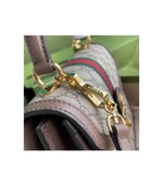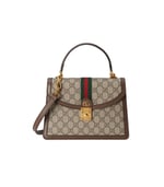 The world of Ophidia continues to evolve with new iterations each season. The top handle bag is presented as part of the Epilogue collection with a detachable shoulder strap. The vintage influenced square shape is accentuated by the House Web stripe and Double G hardware―a contemporary take on a Gucci archival belt buckle from the ’70s. Crafted from the House’s monogram canvas, the style has a strong logo feel.