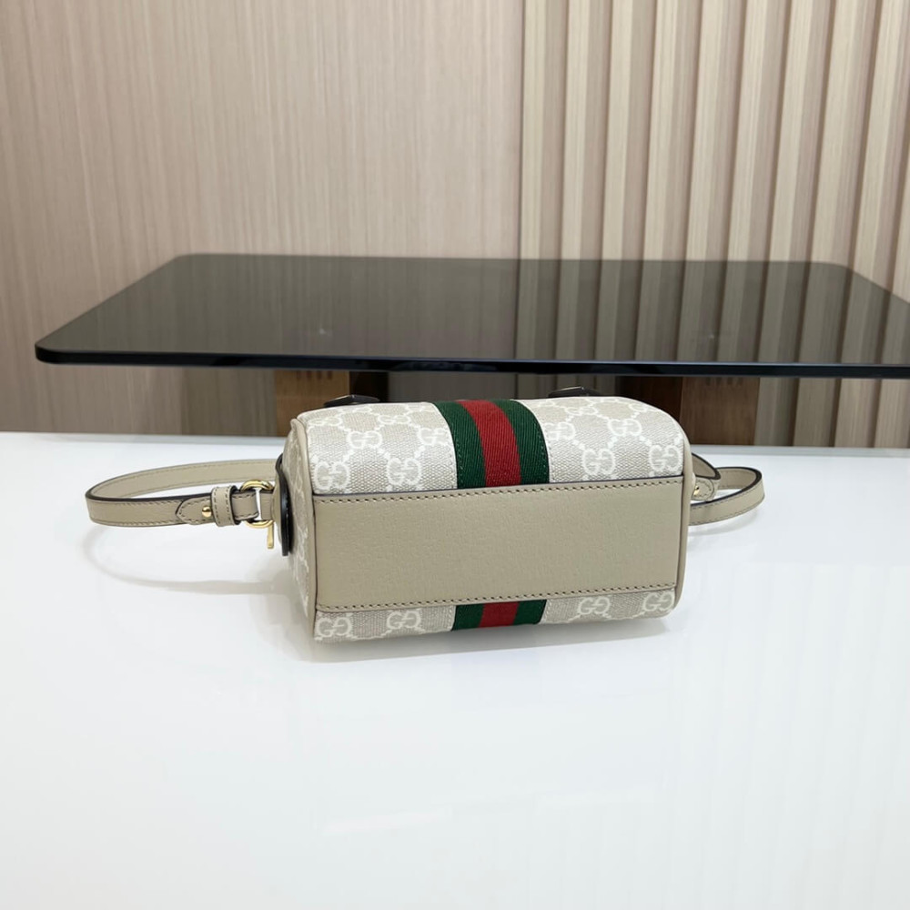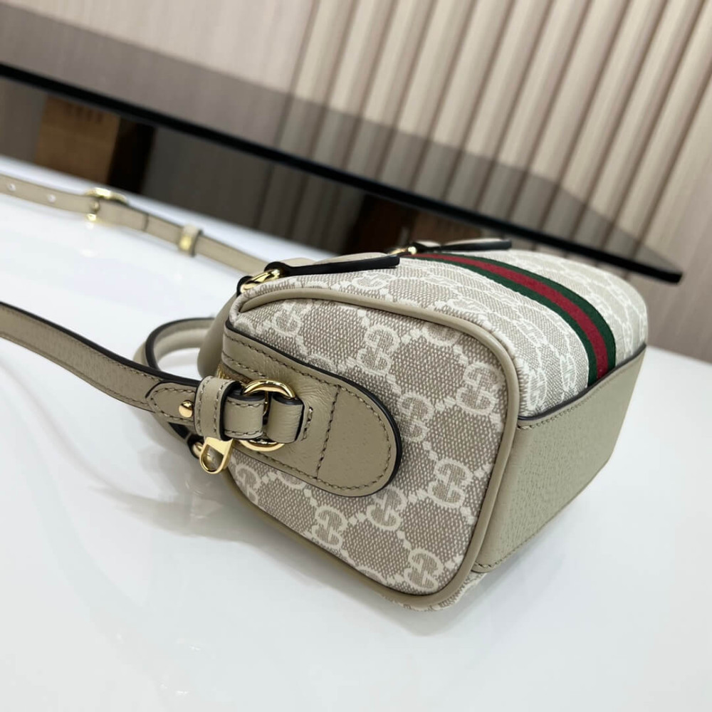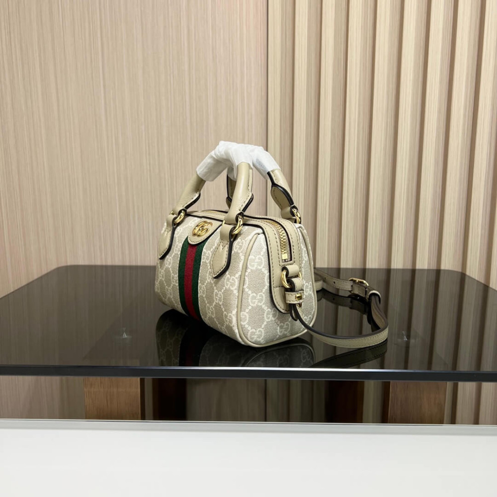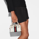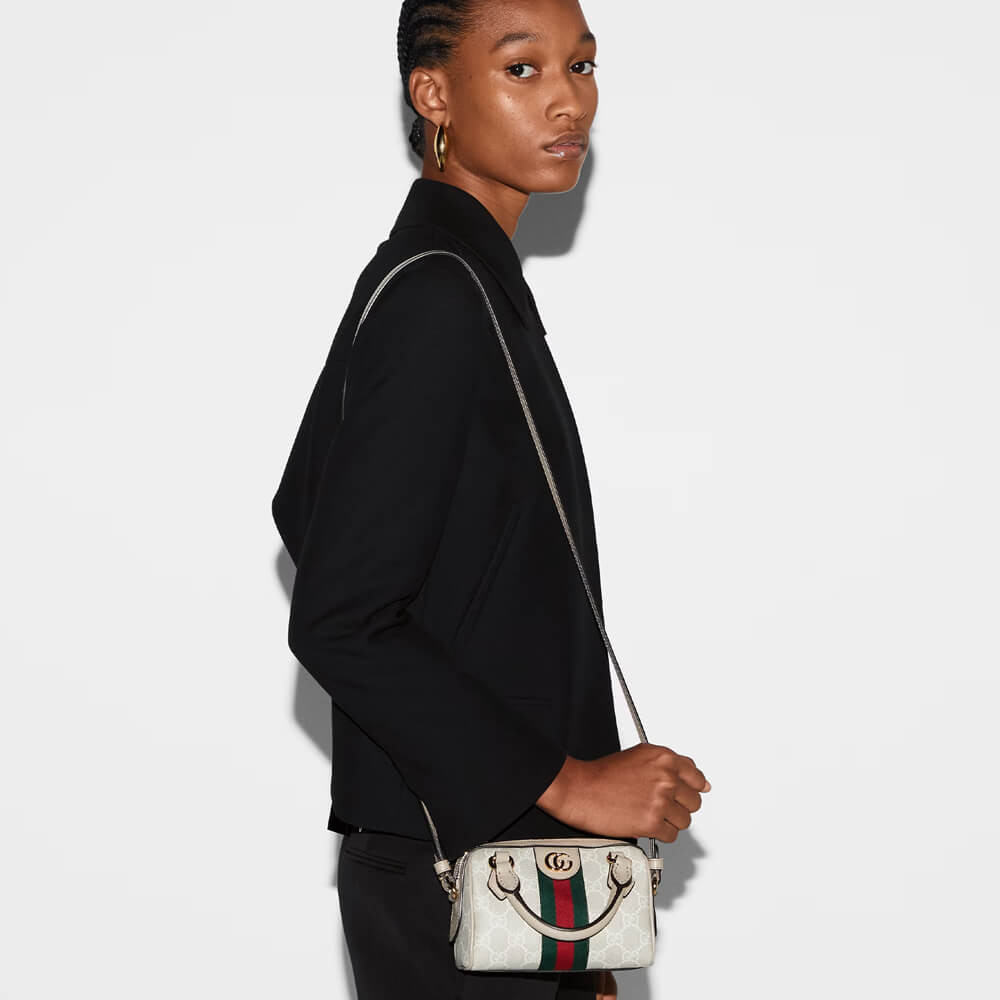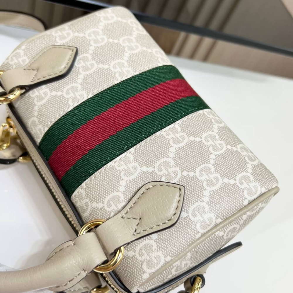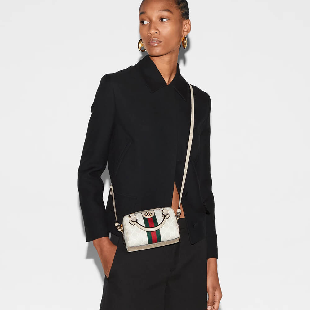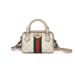 The Ophidia line is enriched by the introduction of the boston mini bag. Crafted from beige and ebony GG Supreme canvas, the accessory is enriched by the Double G hardware and a Web stripe. A detachable shoulder strap completes the design.