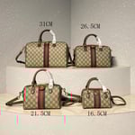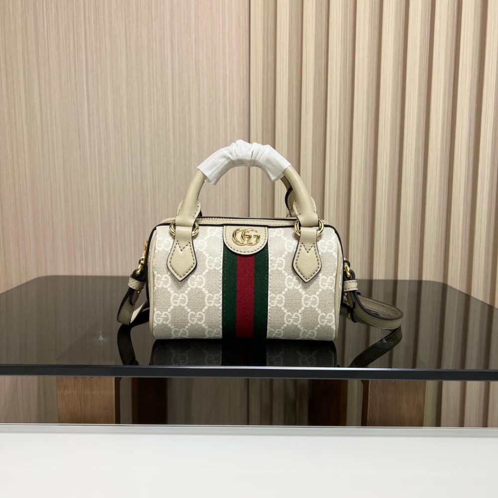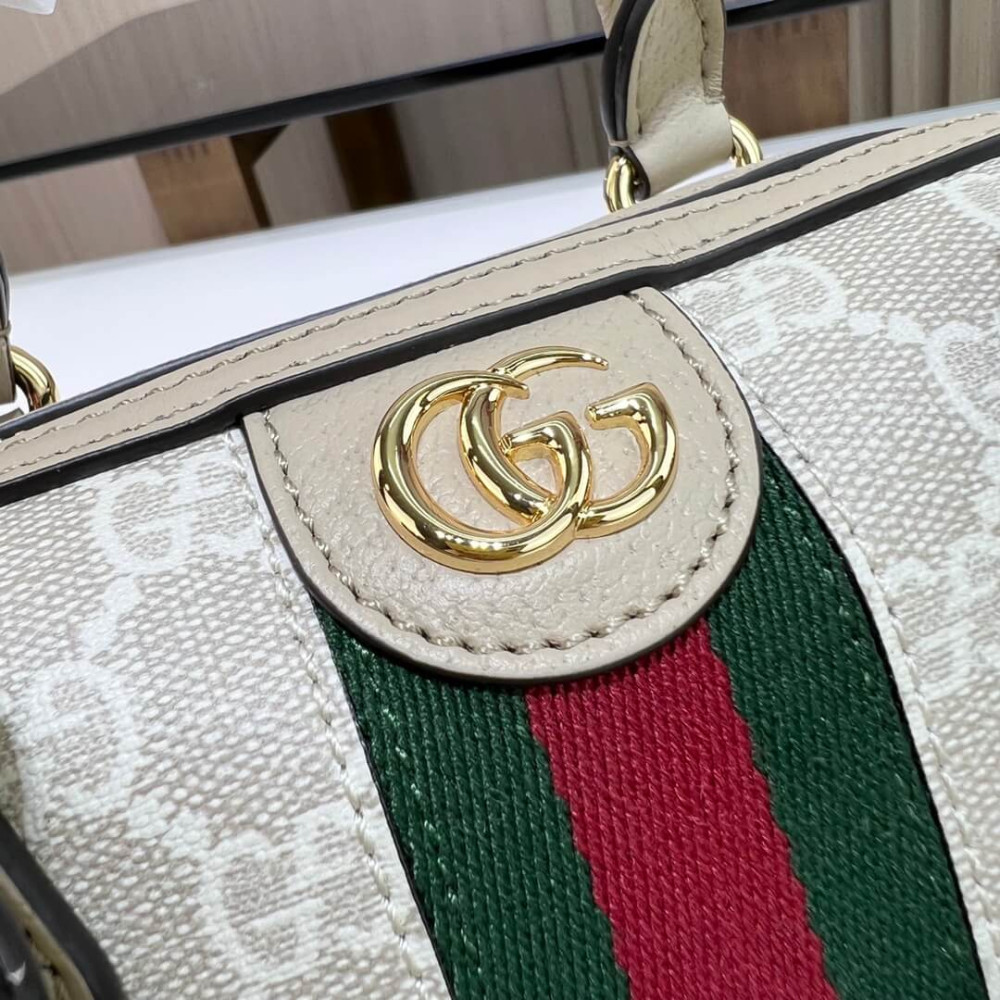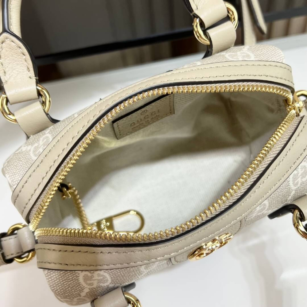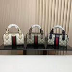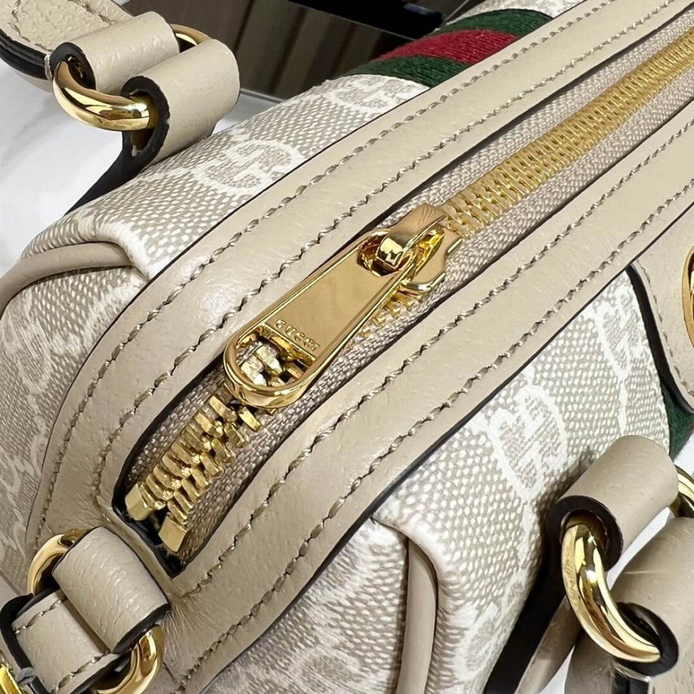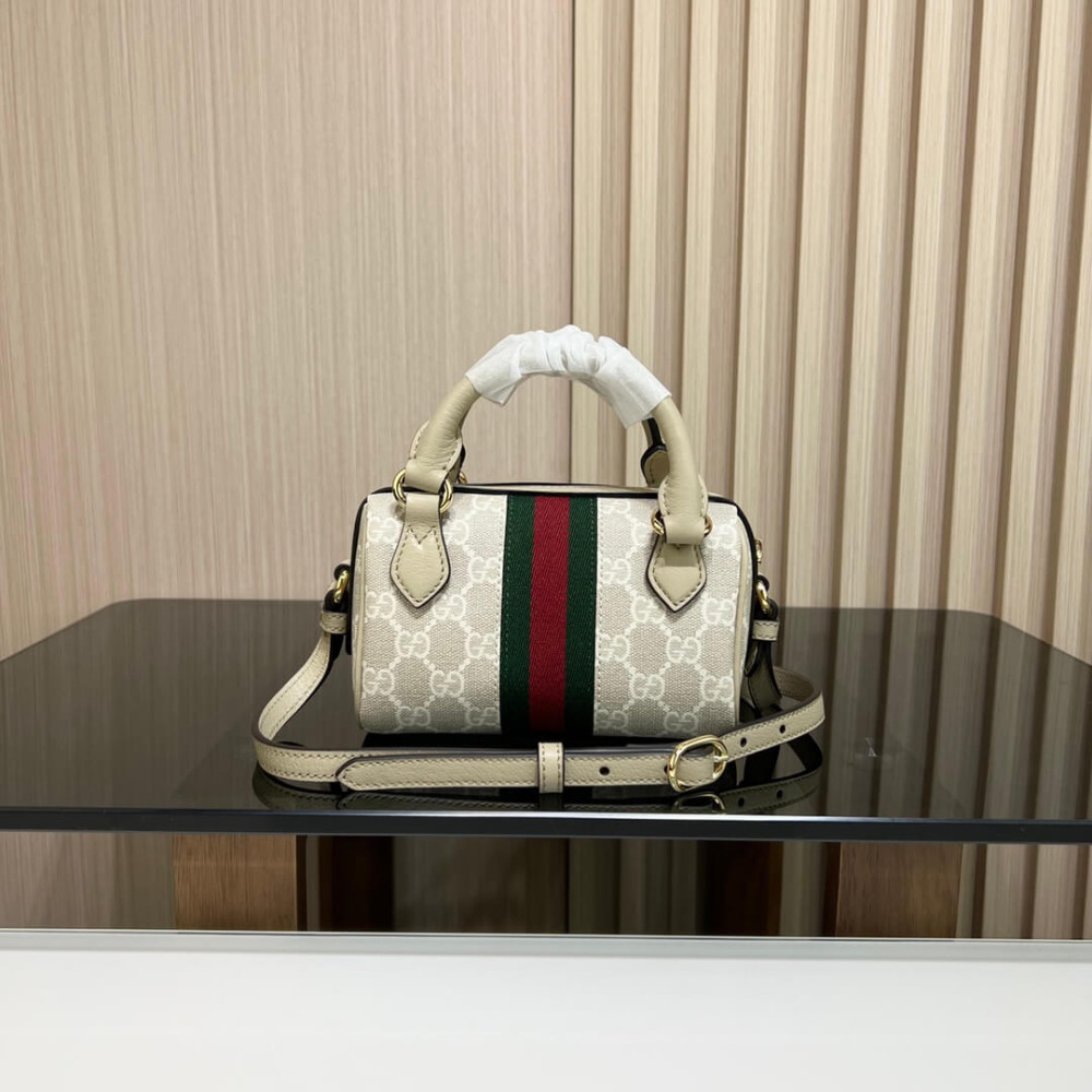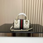 The Ophidia line is enriched by the introduction of the boston mini bag. Crafted from beige and ebony GG Supreme canvas, the accessory is enriched by the Double G hardware and a Web stripe. A detachable shoulder strap completes the design.