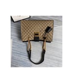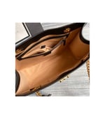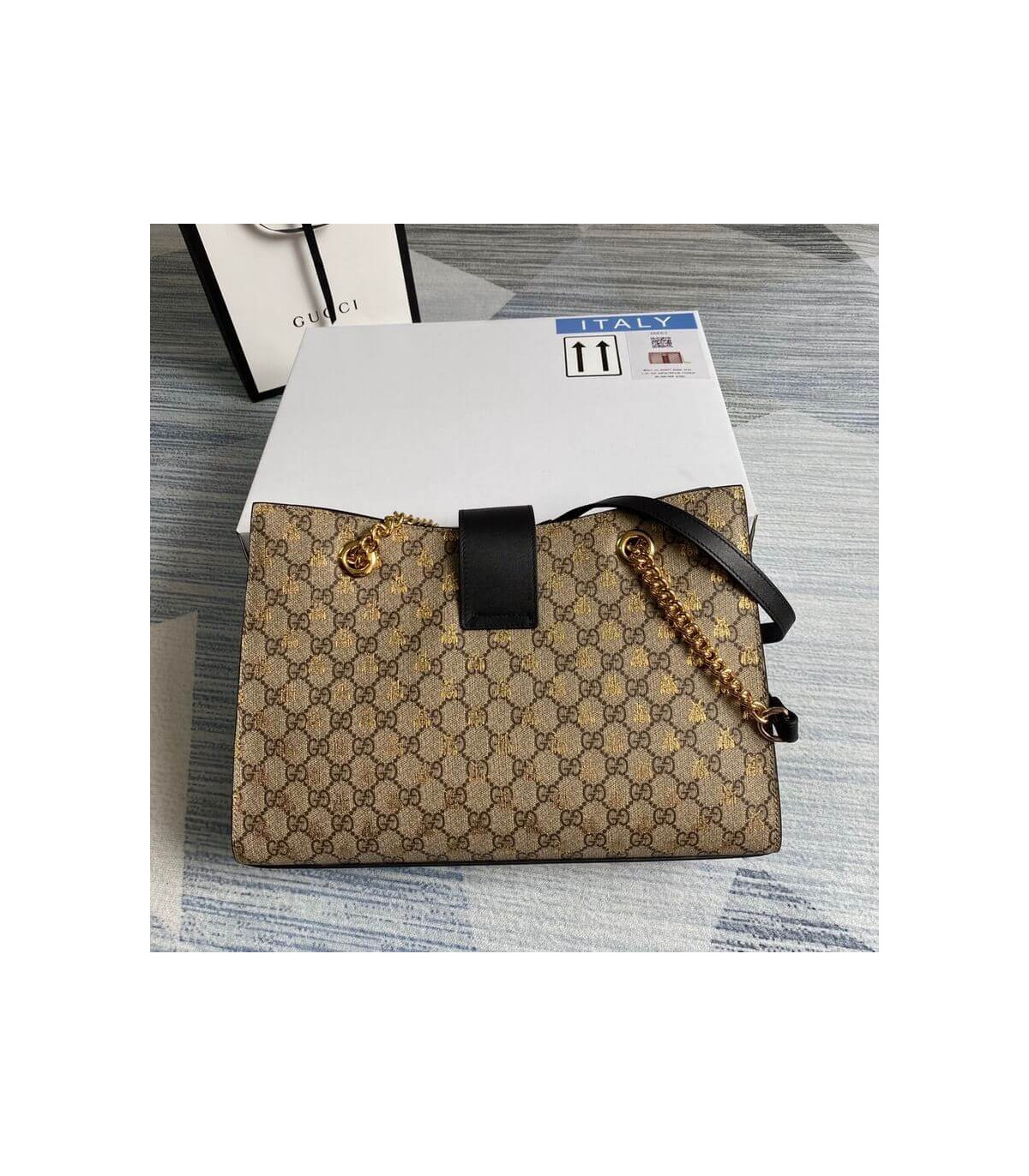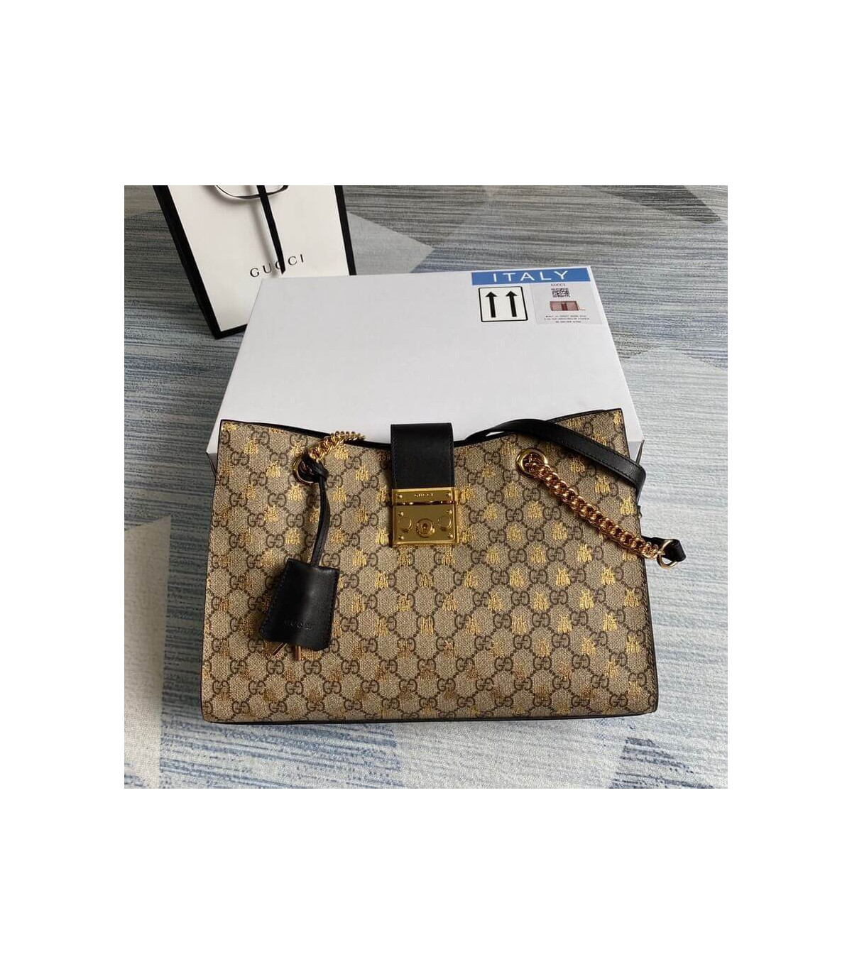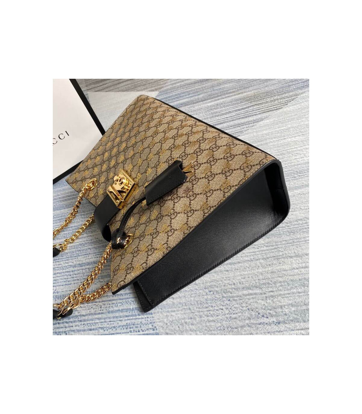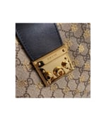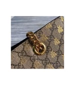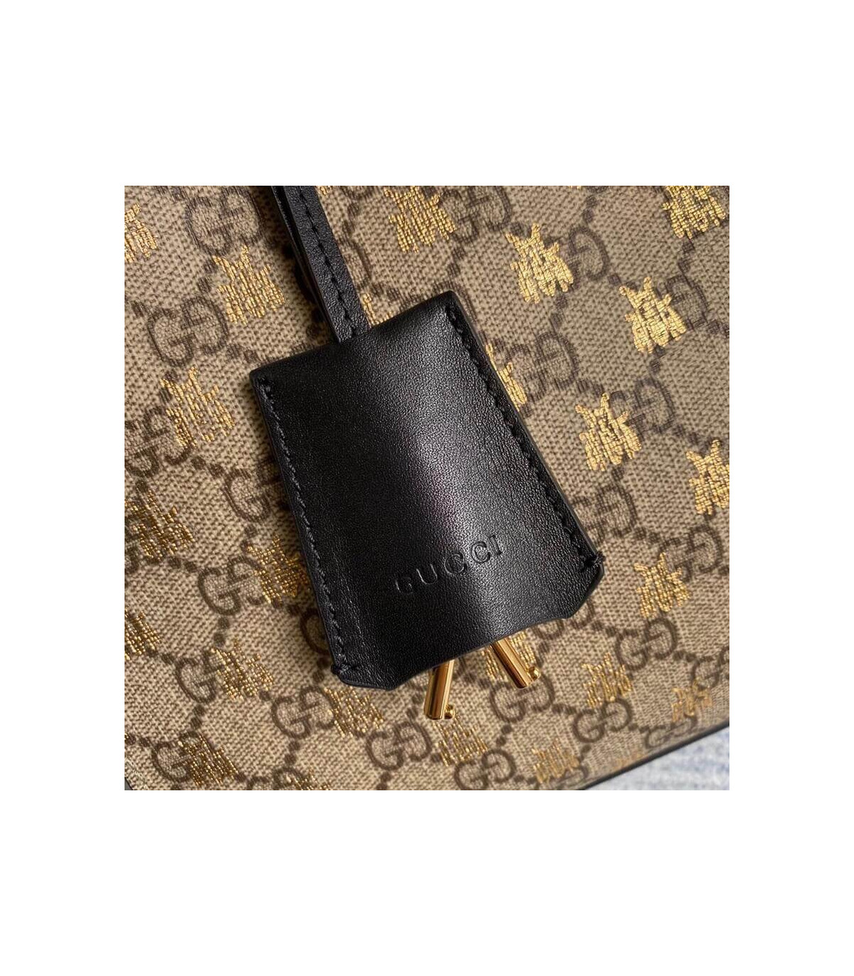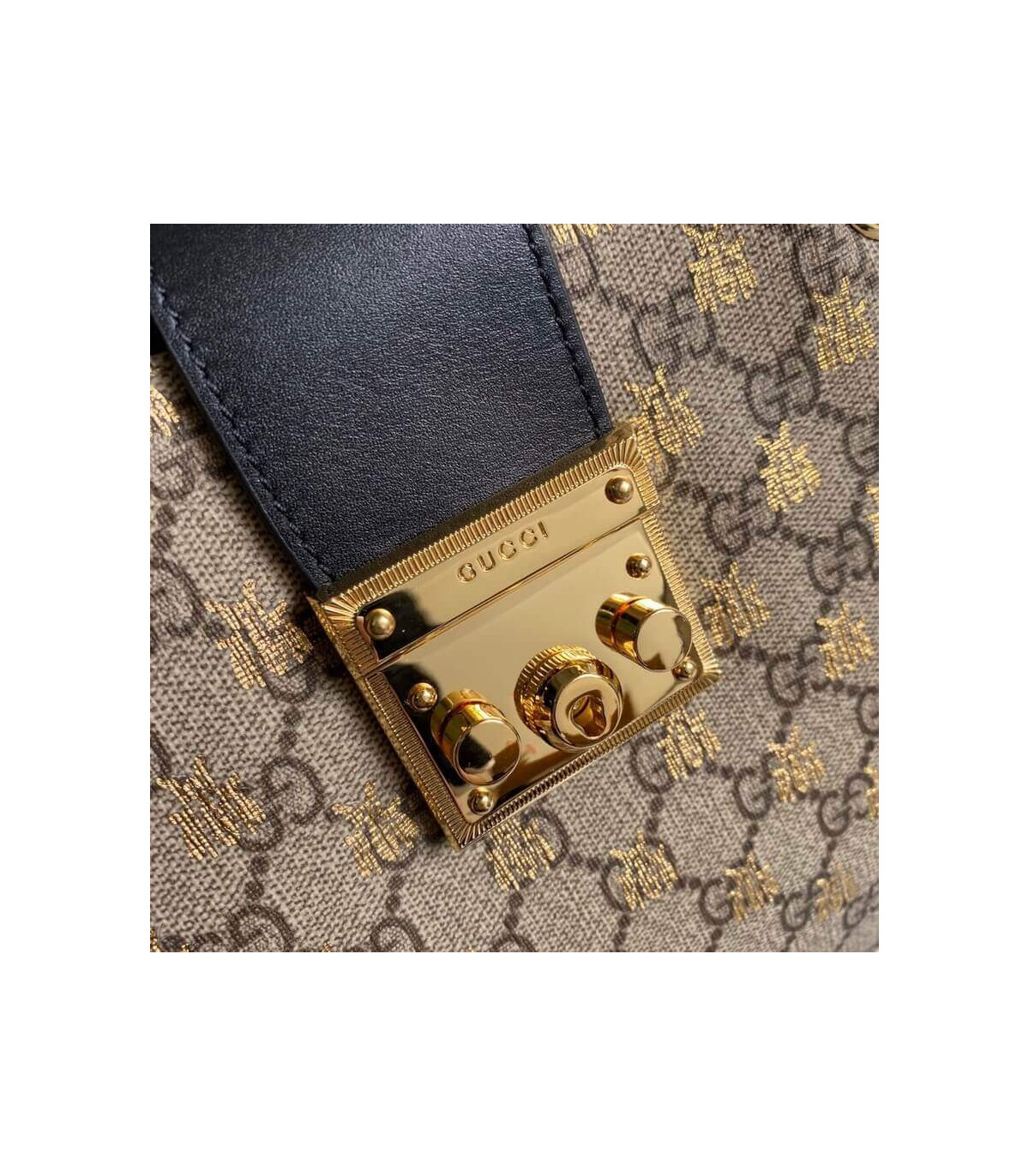A structured shoulder bag in the GG motif, enriched with allover gold printed bees―a historical symbol from the House archives, first introduced in the 1970s. The strap secures with a key lock closure pulled straight from the archives with the key placed in a detachable leather key case.