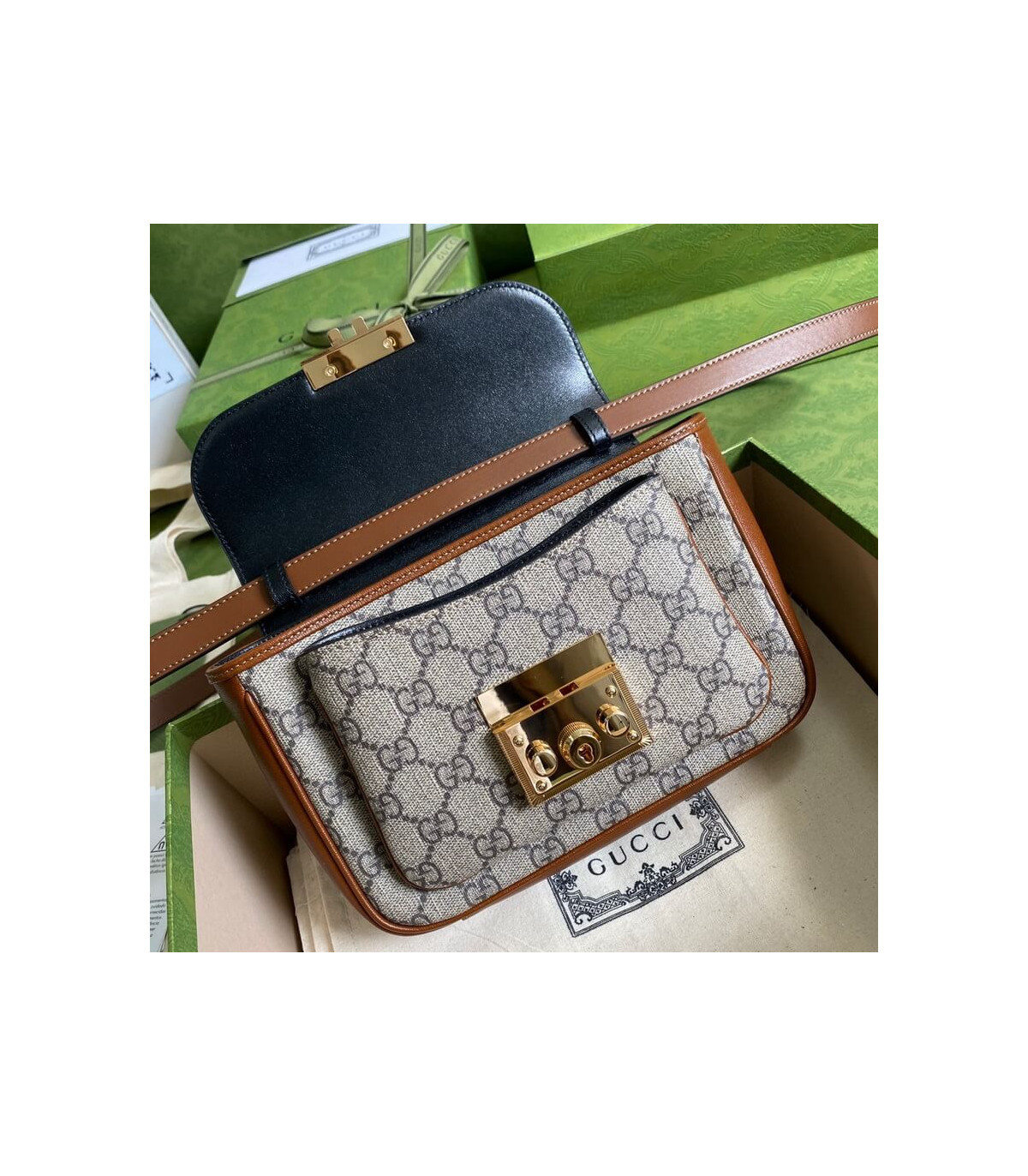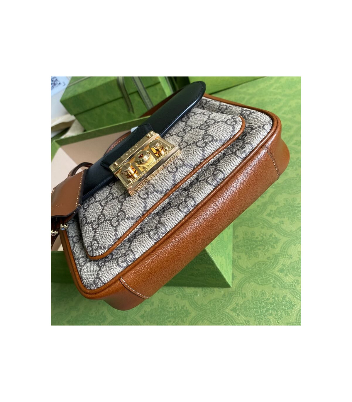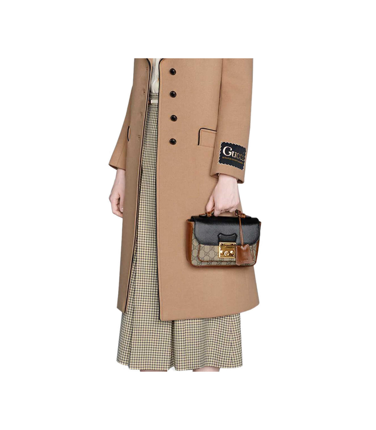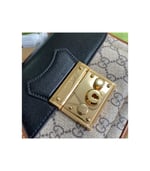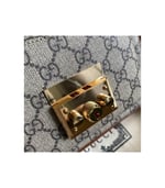Inspired by a style from the archives, a mini version of the Padlock shoulder bag is introduced as a part of the Ouverture collection. Presented in a mix of white leather and GG Supreme canvas, the style is defined by the line’s signature key lock closure. A colourful orange leather trim completes the style.