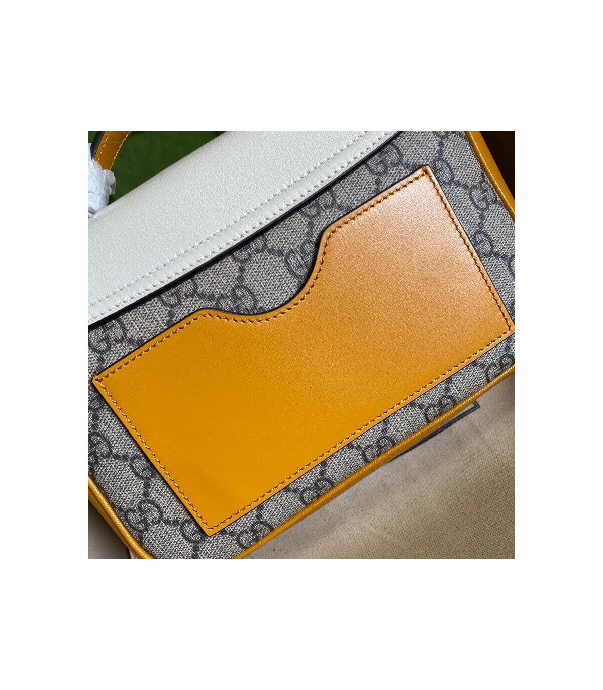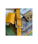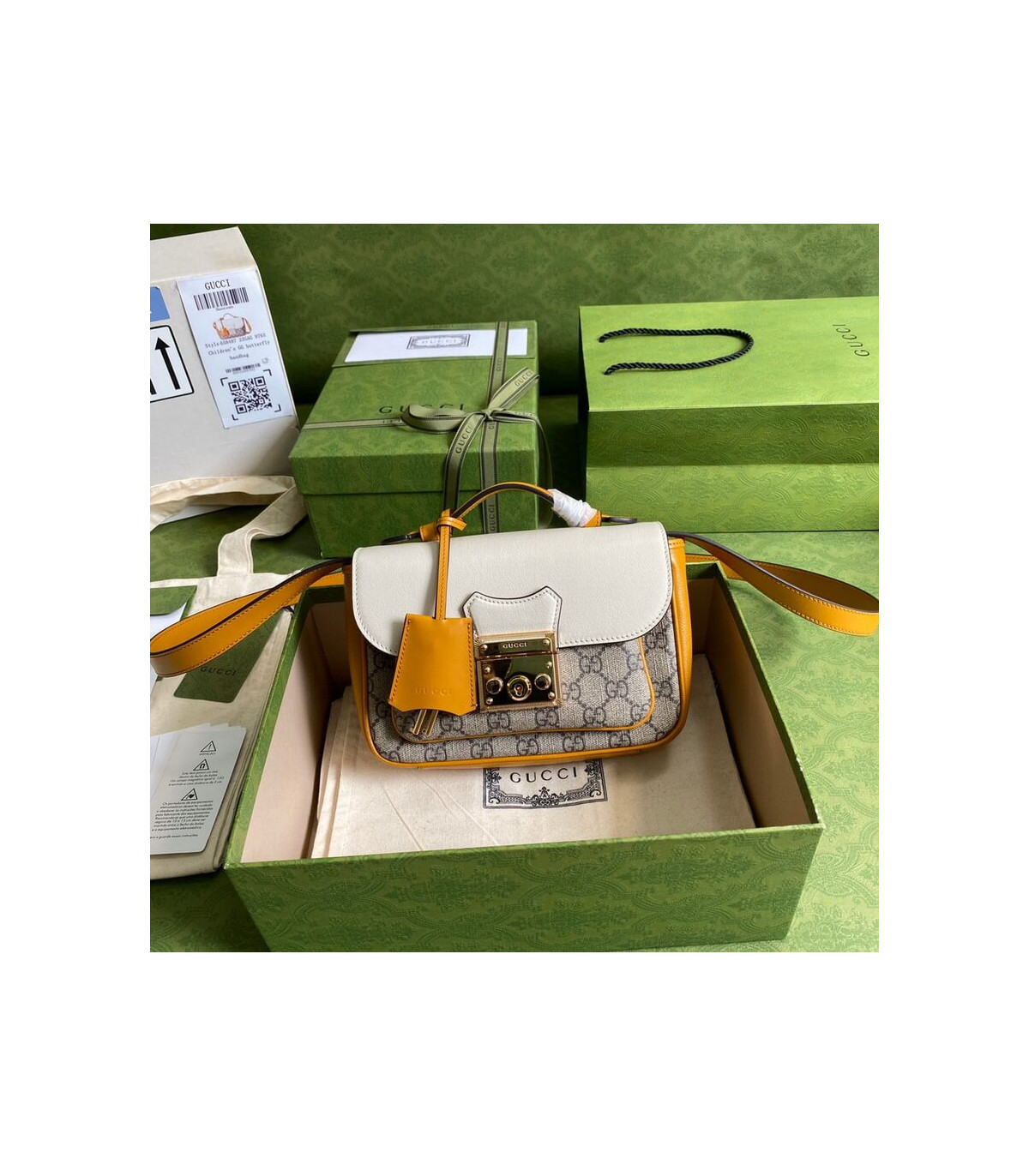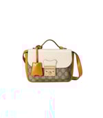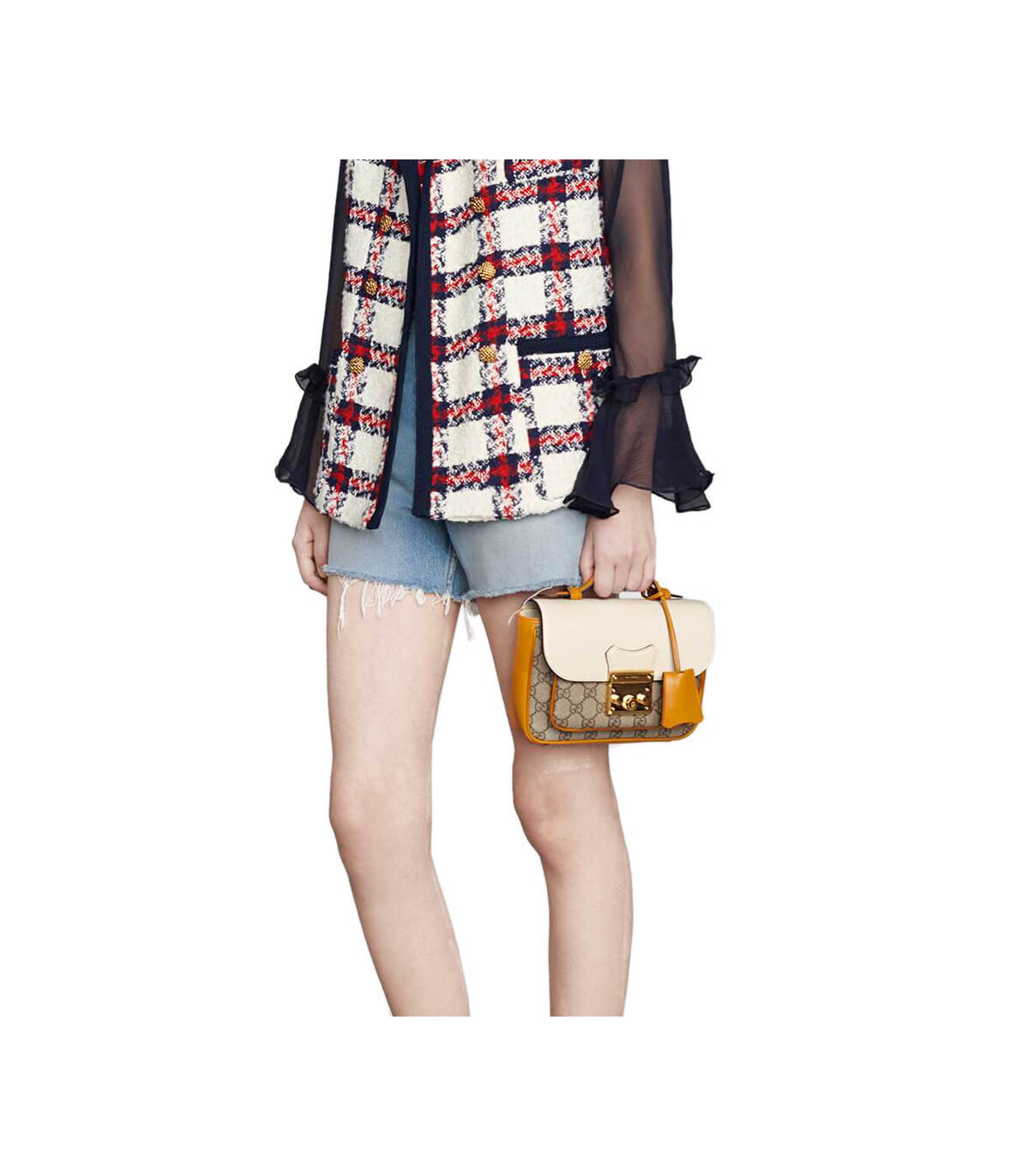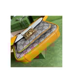 Inspired by a style from the archives, a mini version of the Padlock shoulder bag is introduced as a part of the Ouverture collection. Presented in a mix of white leather and GG Supreme canvas, the style is defined by the line’s signature key lock closure. A colourful orange leather trim completes the style.