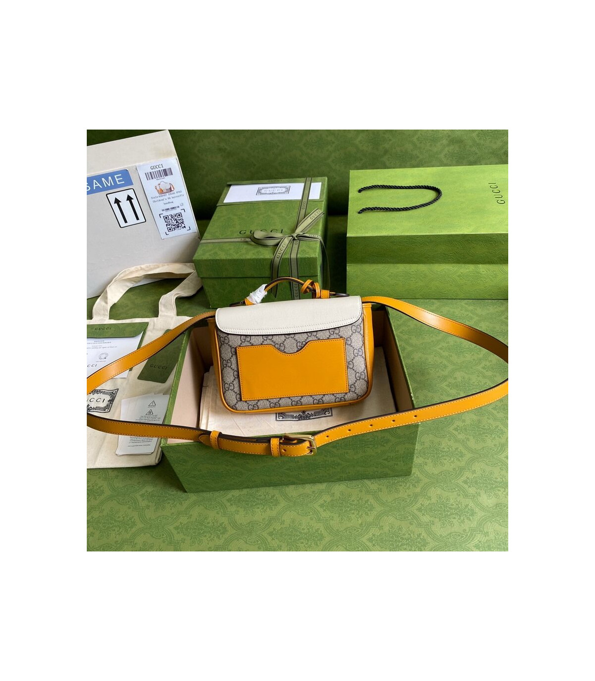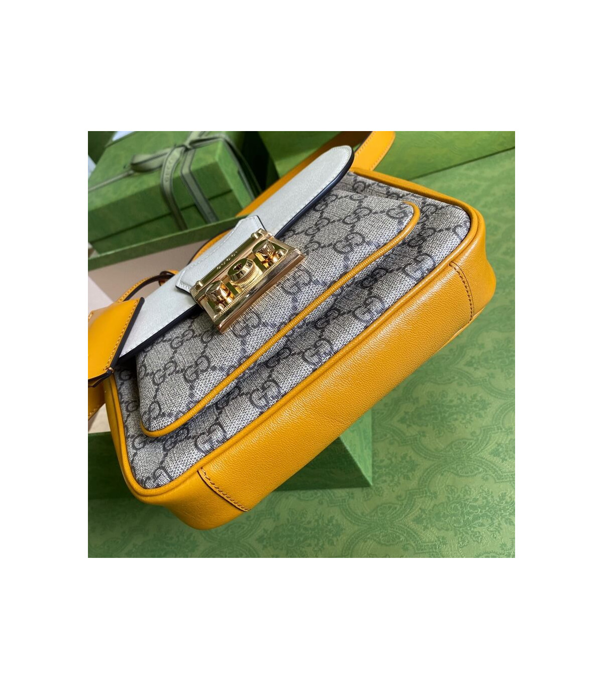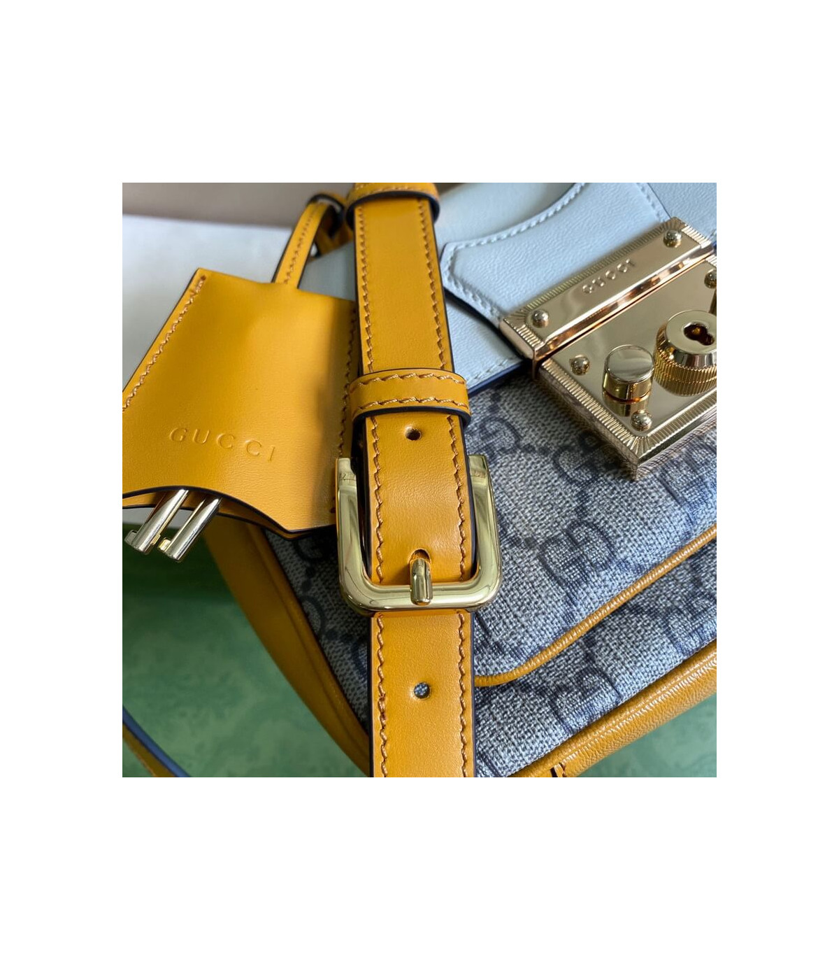 Inspired by a style from the archives, a mini version of the Padlock shoulder bag is introduced as a part of the Ouverture collection. Presented in a mix of white leather and GG Supreme canvas, the style is defined by the line’s signature key lock closure. A colourful orange leather trim completes the style.