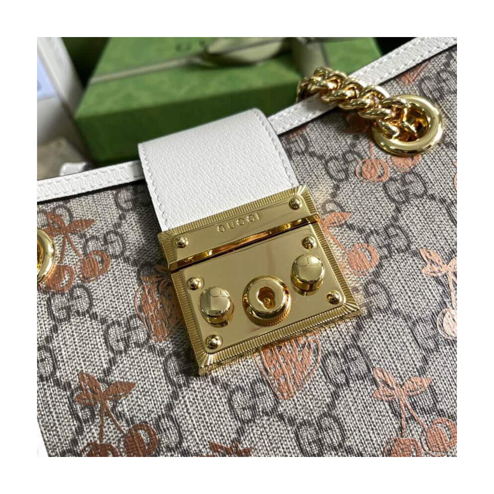 Inspired by an archival piece, the Padlock is presented with contemporary details―linking different chapters of House history together. Here, the small bag is reimagined as a tote bag while still being defined by the line’s emblematic lock and key closure. A metallic cherry and strawberry print completes the design with a playful twist.