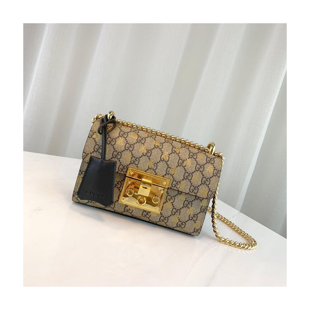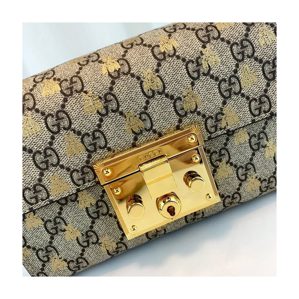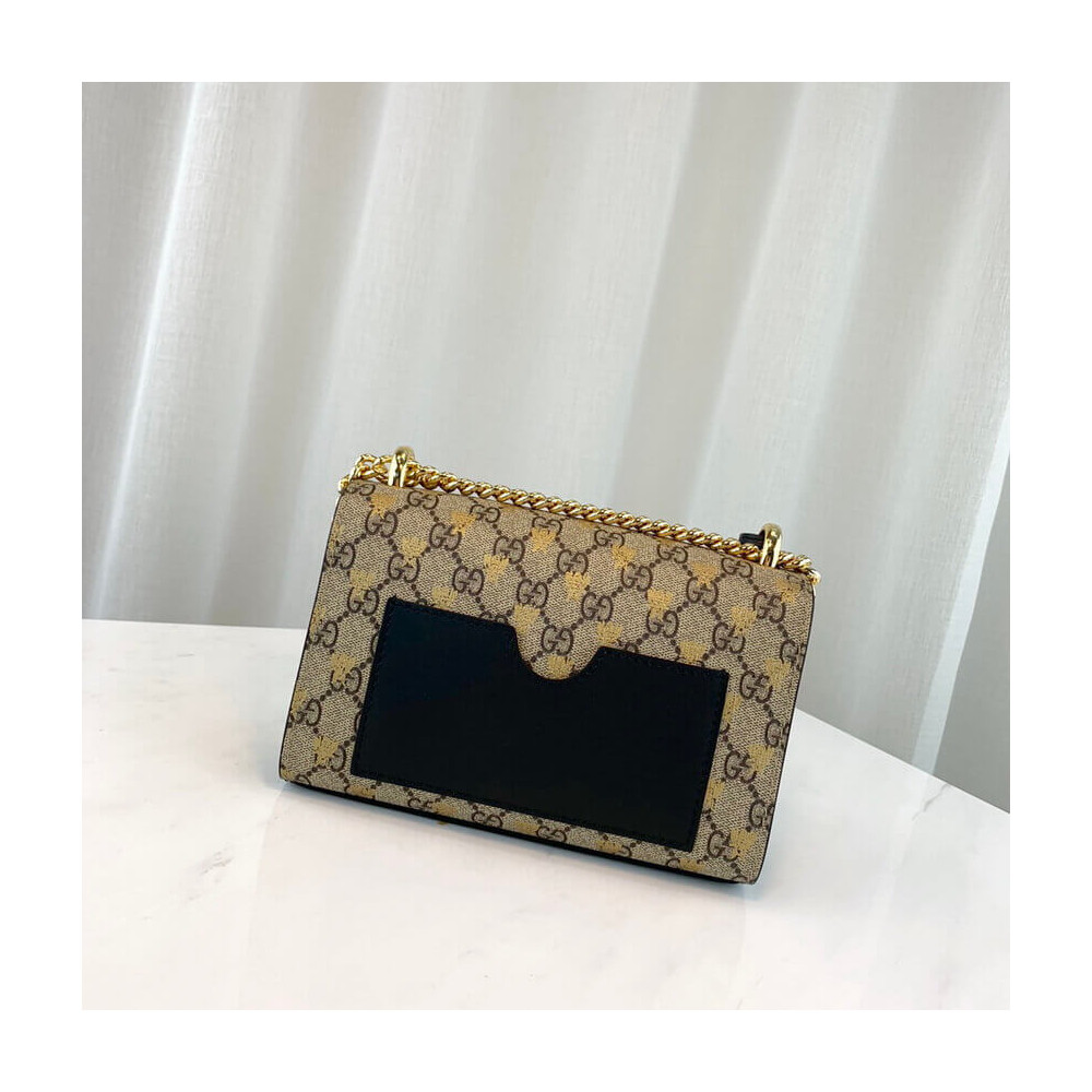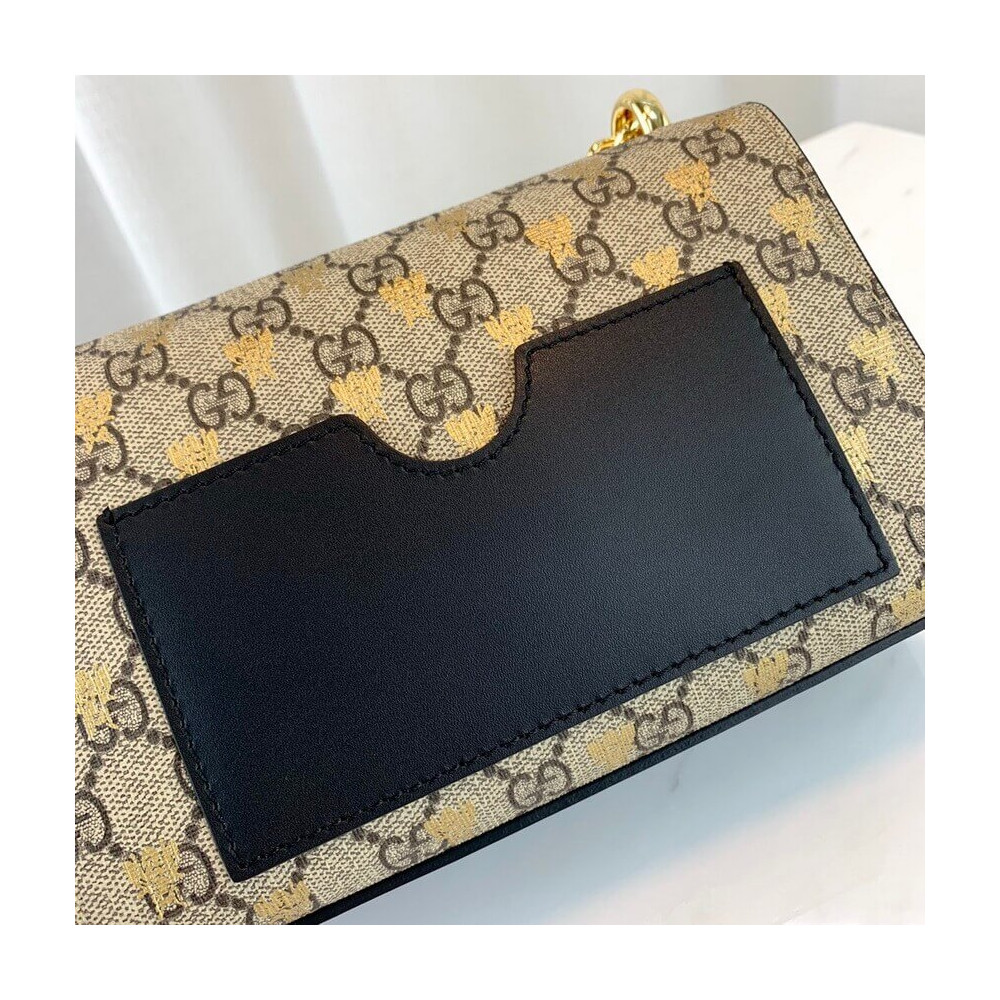 A small structured shoulder bag with a key lock closure pulled from the archives, the key is placed in a leather key case that loops around the chain. The sliding chain strap can be worn multiple ways, changing between a shoulder and a top handle bag. Made in GG Supreme canvas enriched with allover gold printed bees―a historical symbol from the House archives, first introduced in the 1970s.