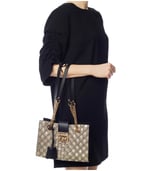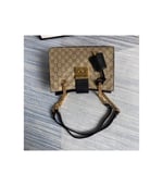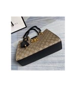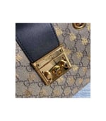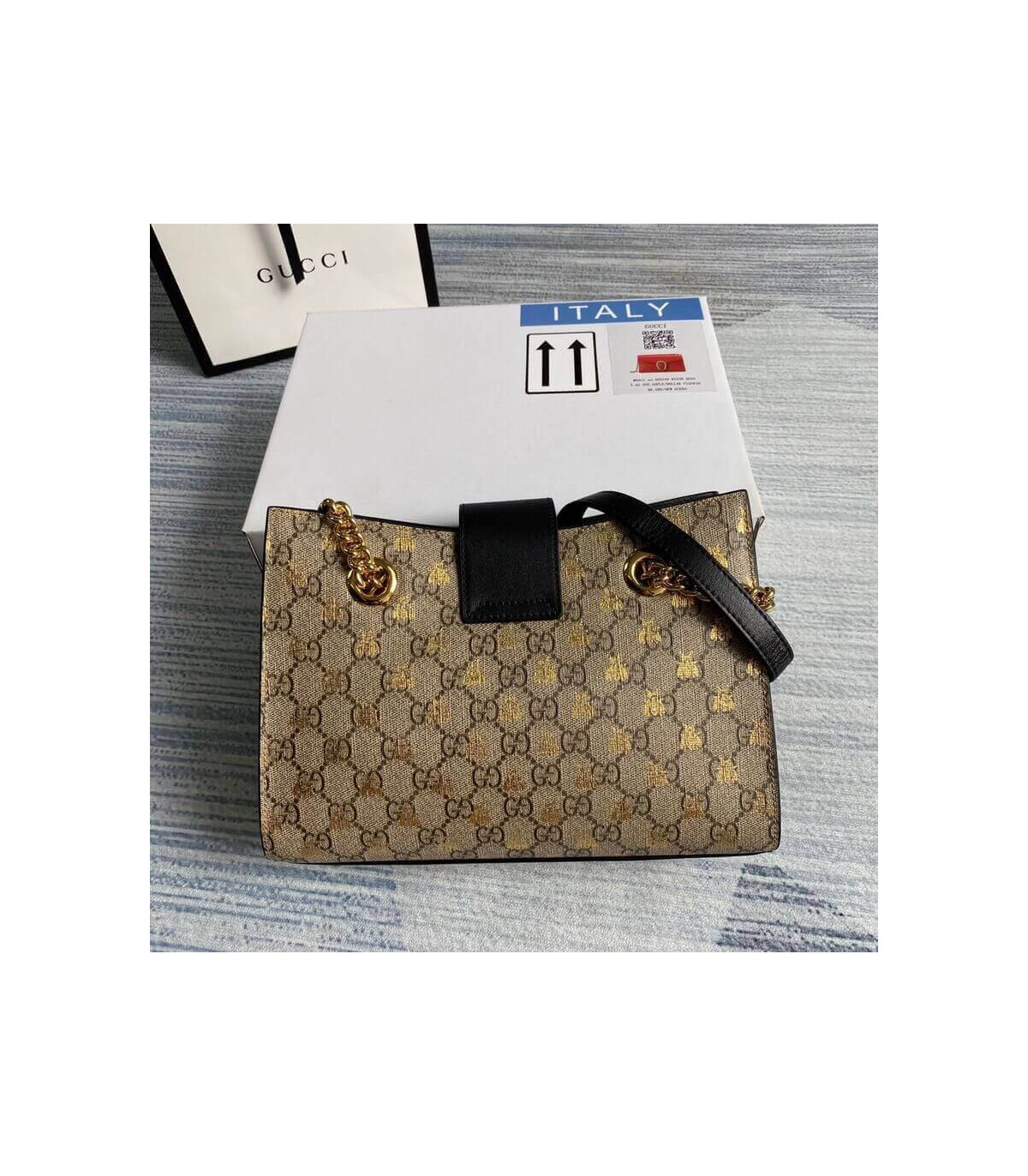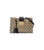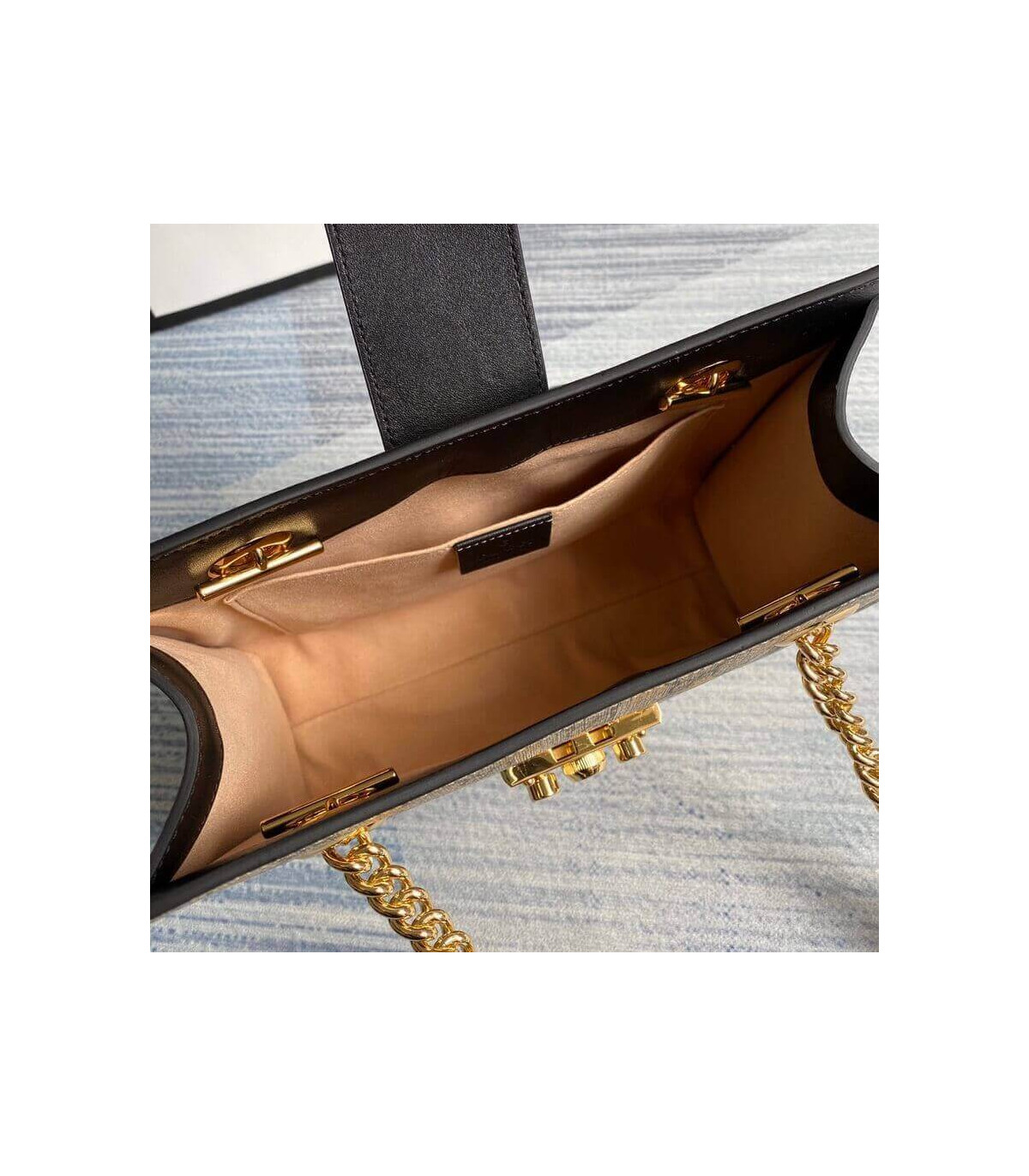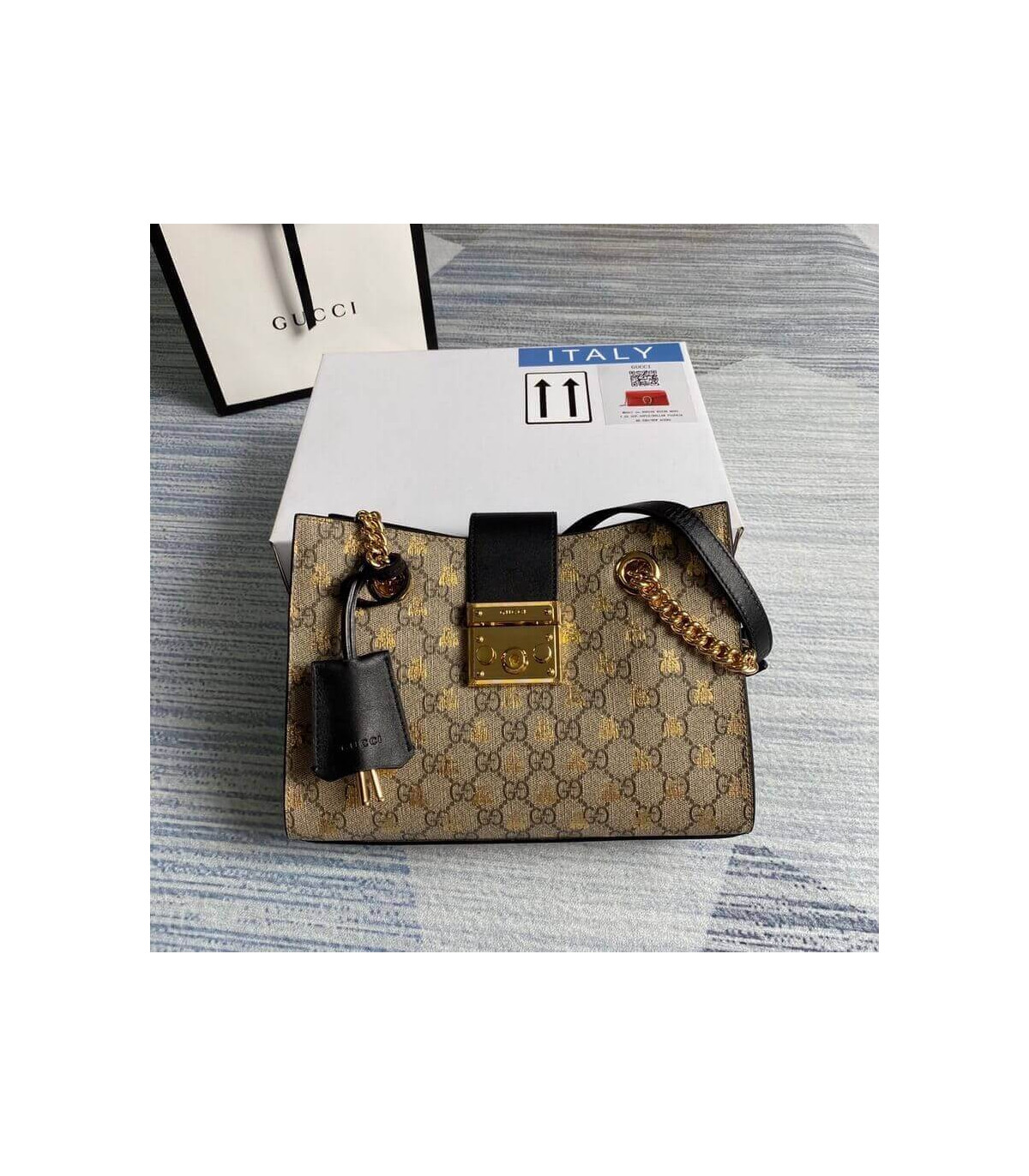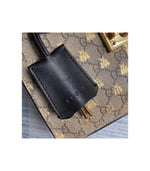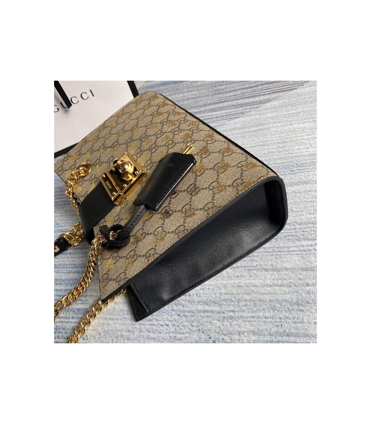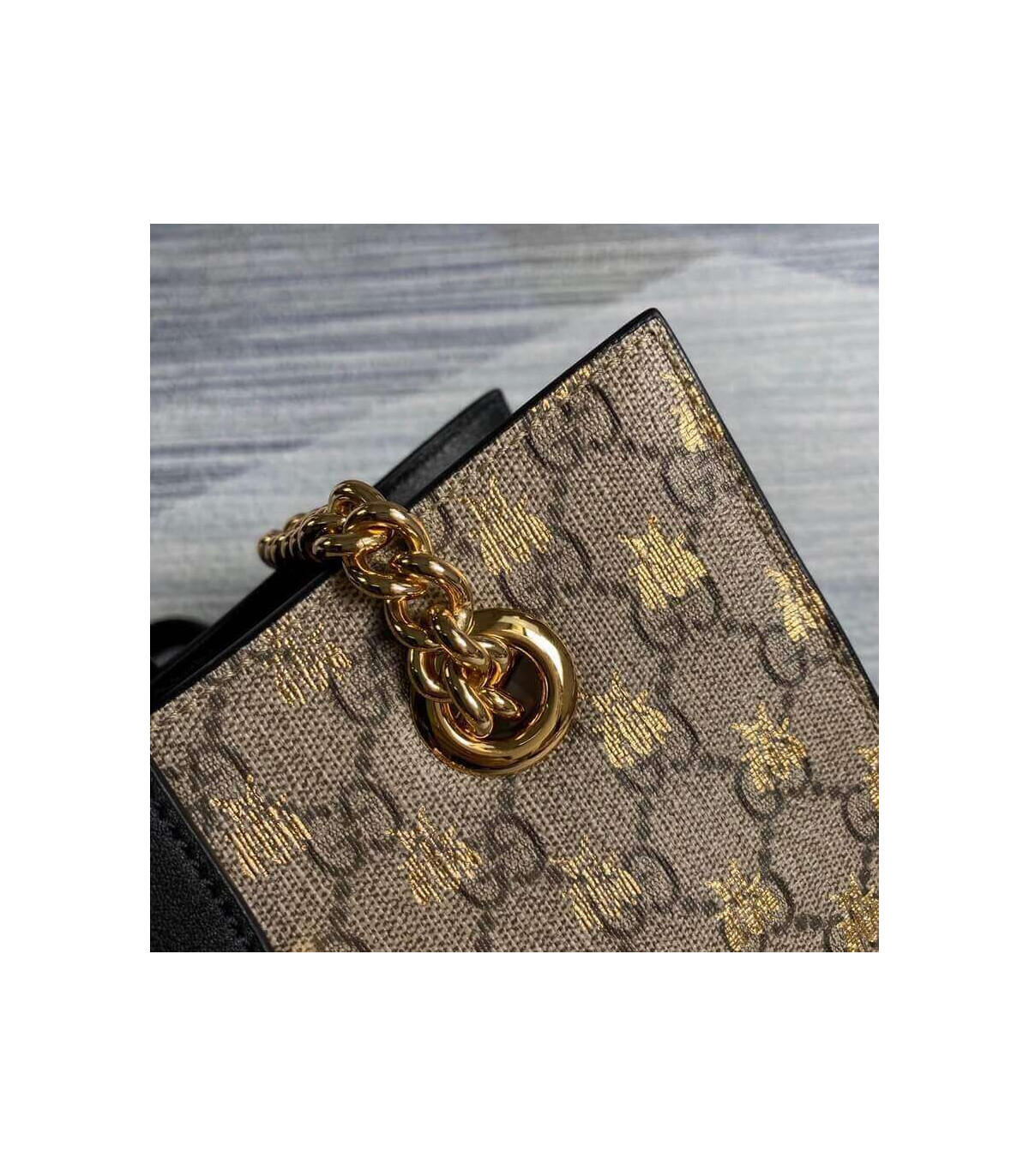 A structured shoulder bag in the GG motif, enriched with allover gold printed bees―a historical symbol from the House archives, first introduced in the 1970s. The strap secures with a key lock closure pulled straight from the archives with the key placed in a detachable leather key case.