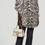 A structured GG Supreme canvas top handle bag appears beige and white with subtle oatmeal leather trim. The textured tiger head closure defines the front as a unique hardware detail.