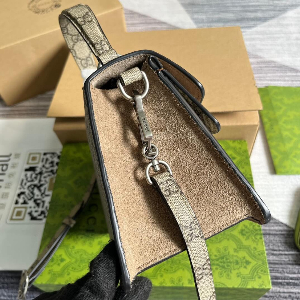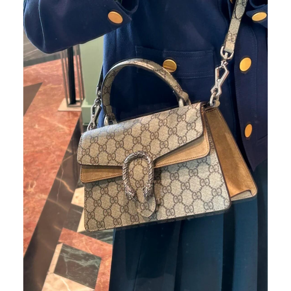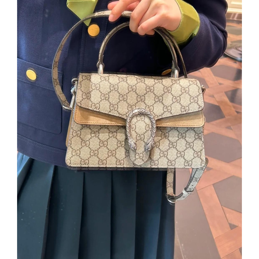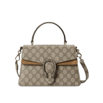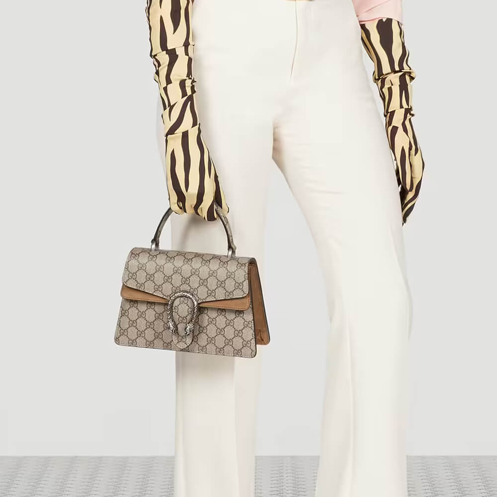 A structured GG Supreme canvas top handle bag appears beige and ebony with subtle taupe suede trim. The textured tiger head closure defines the front as a unique hardware detail.