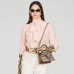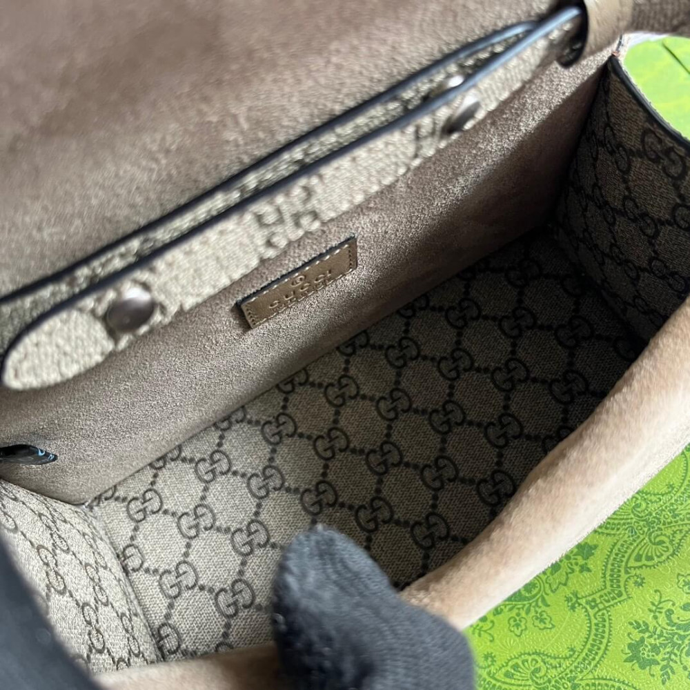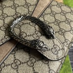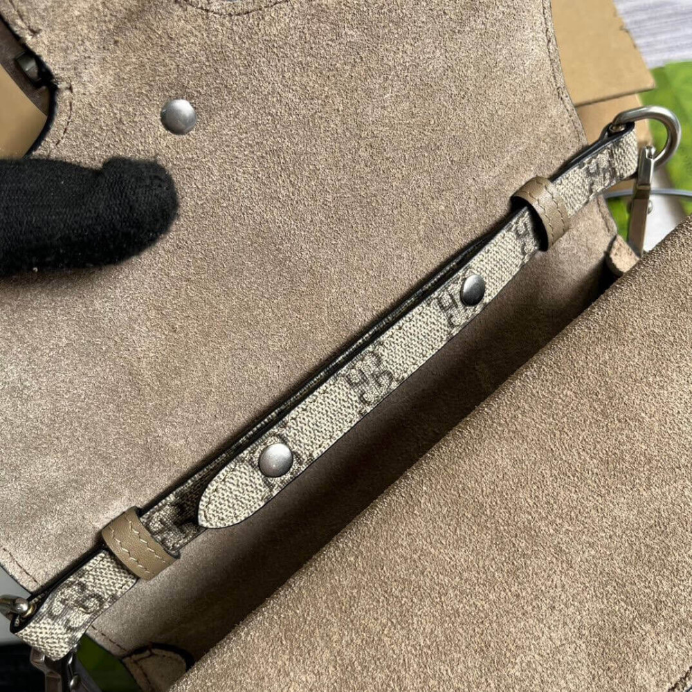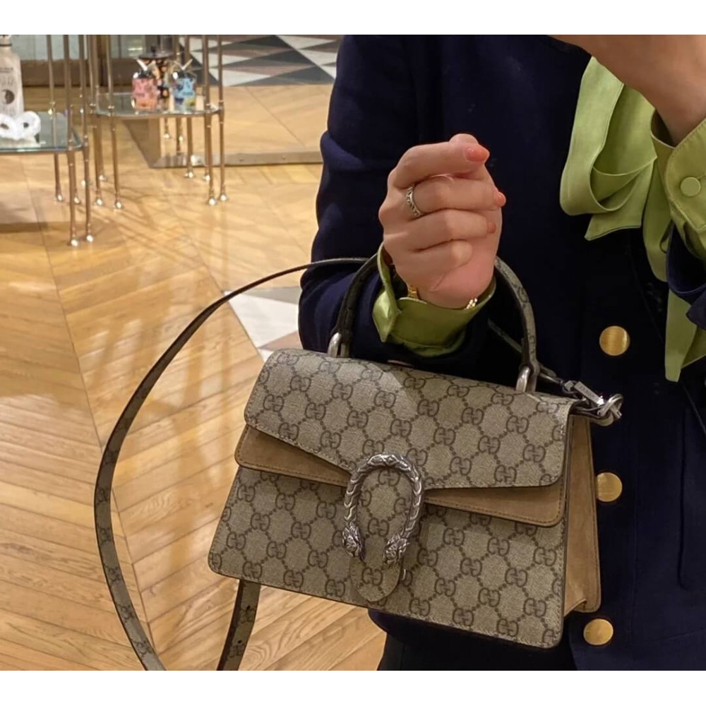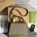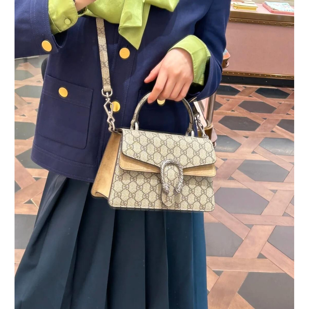 A structured GG Supreme canvas top handle bag appears beige and ebony with subtle taupe suede trim. The textured tiger head closure defines the front as a unique hardware detail.